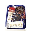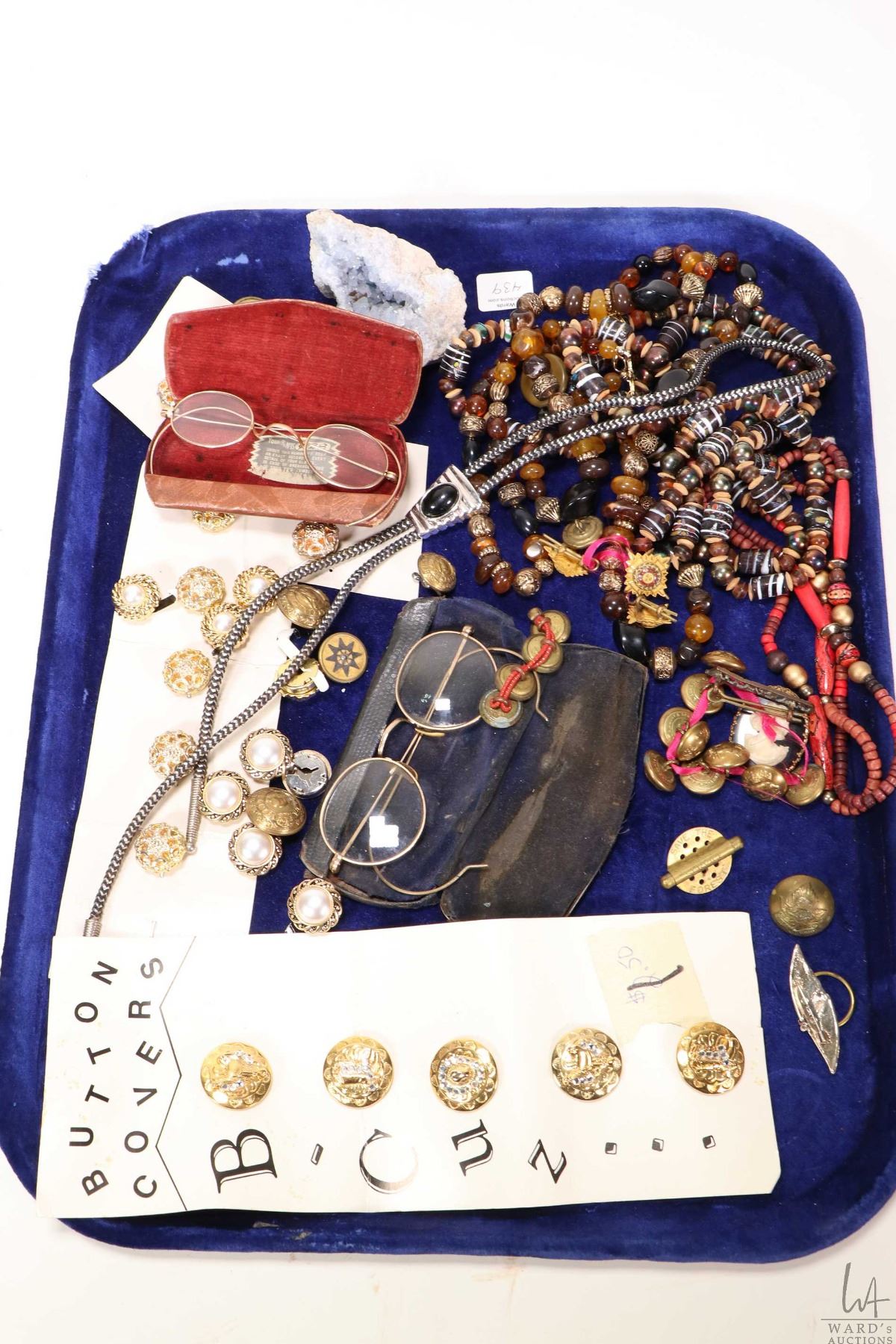 Tray lot of collectibles buttons including Canadian Forest Service, Edmonton Transportation Systems, Military style buttons, button covers, beaded necklaces, a geode and two pairs of gold plated eye glasses in cases etc.