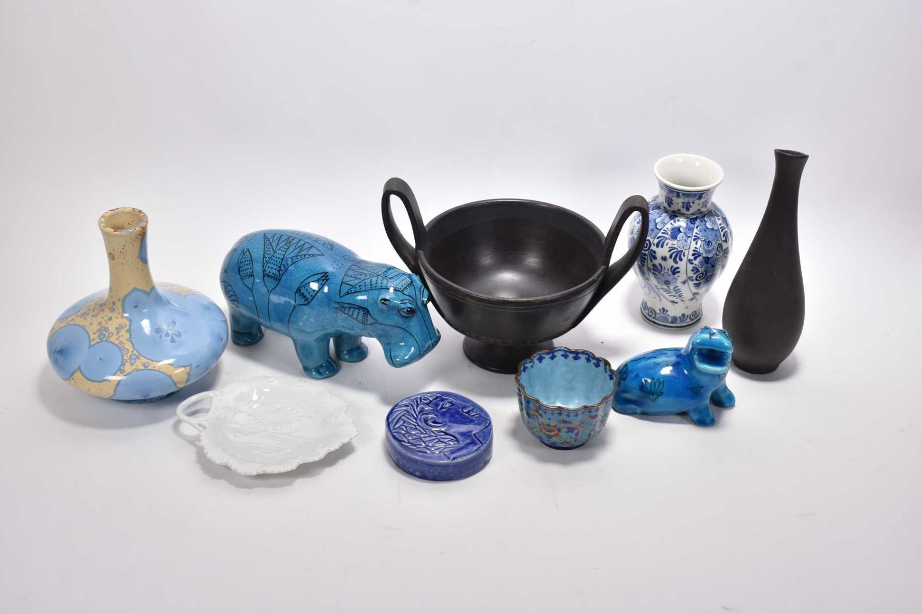 Tray lot of collectibles including an enamelled fluted dish, a West German leaf motif pin tray, splatter glazed vase, three pieces of Metropolitan museum tourist ware including two hippopotamuses and a double handled dish etc. Not Available For Shipping. Local Bidders Only