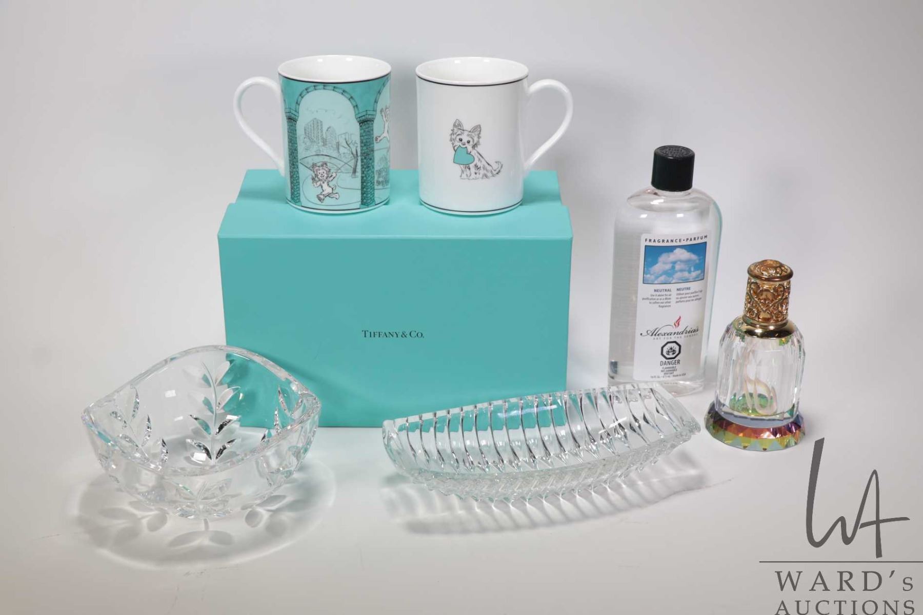 Tray lot of collectibles including boxed set of two Tiffany & Co. coffee mugs, Tiffany & Co. etched glass dish, a crystal scent diffuser with a bottle of fragrance and a frosted and clear glass dish