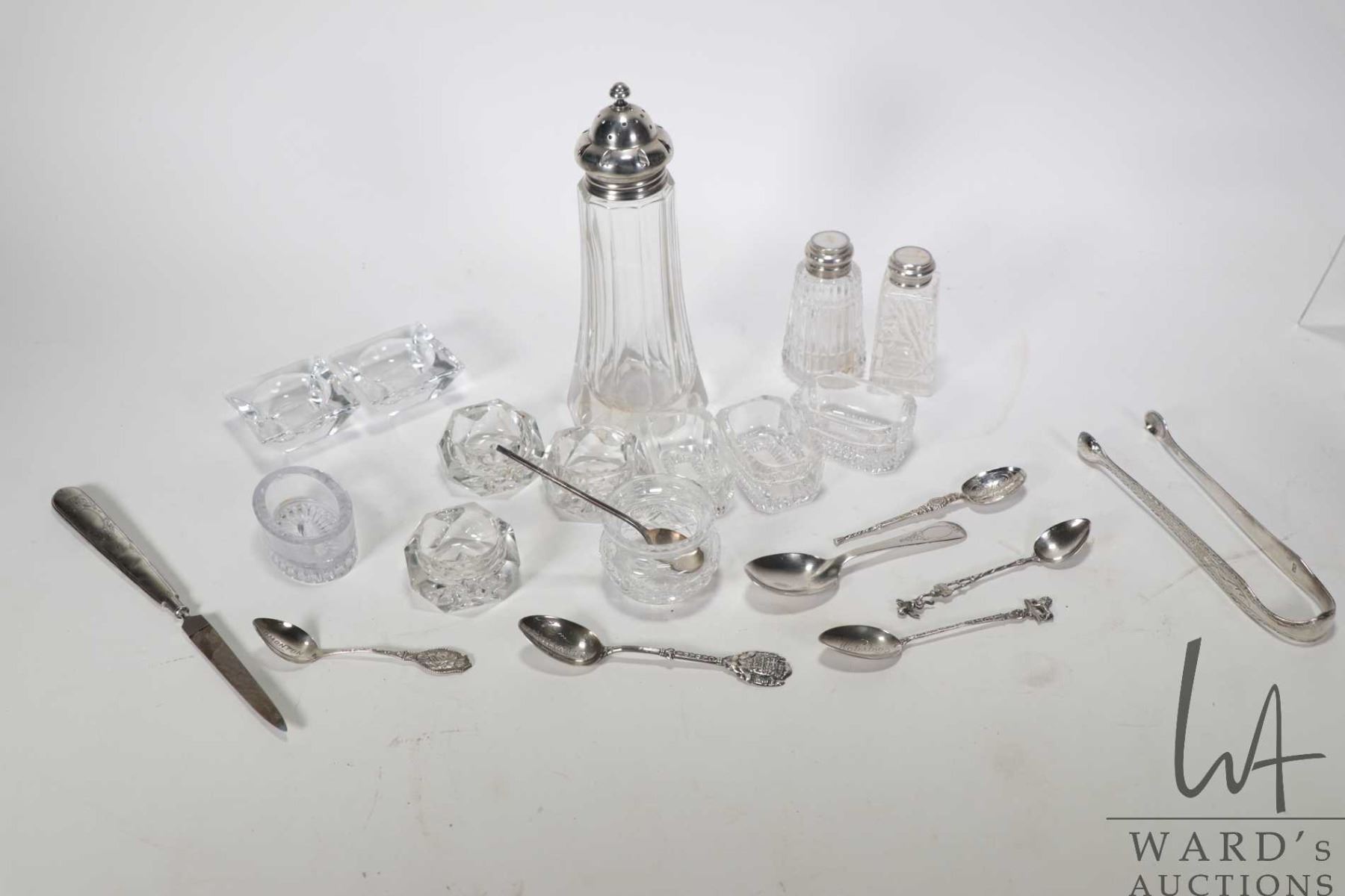 Tray lot of collectibles including glass sugar shaker with sterling top, pair of sugar tongs, nail file, set of shakers, plus a collection of open salts, sterling spoons, etc.