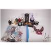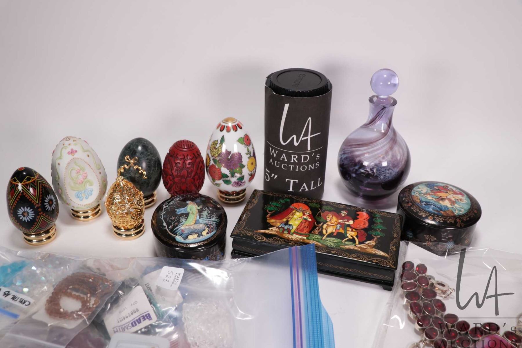 Tray lot of collectibles including hand painted, lidded Russian box, two Russian porcelain, lidded dresser boxes, a selection of eggs including porcelain, metal, stone etc. plus a selection of crystal beads and a lidded perfume bottle etc.