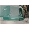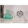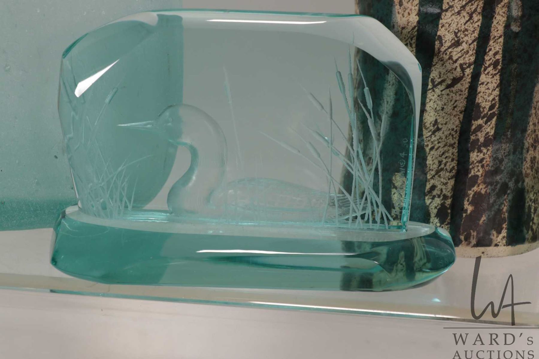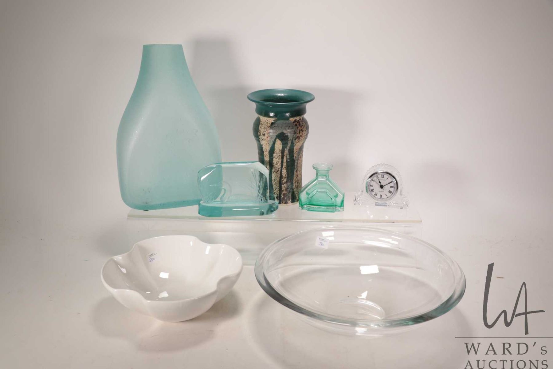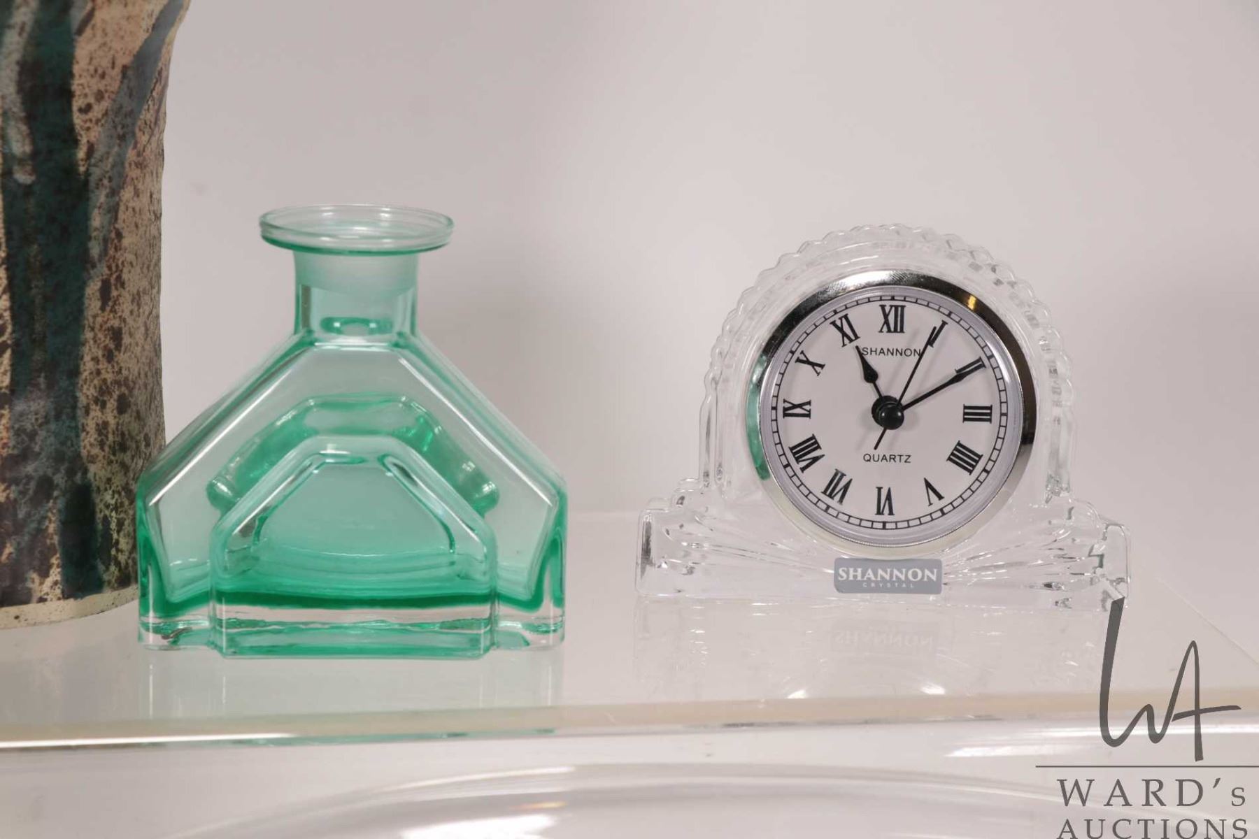 Tray lot of collectibles including limited edition 3 3/4" crystal loon statue signed by artist A Capredoni 4/50, 12 1/2" sea glass vase, glazed pottery vase, Italian pottery bowl, glass bowl and a small crystal desk clock