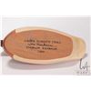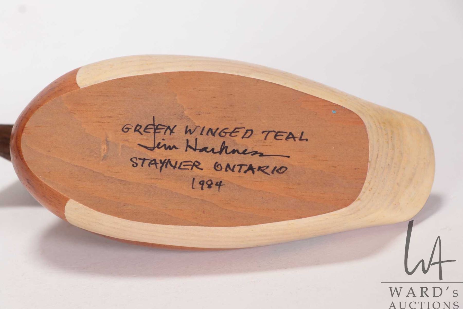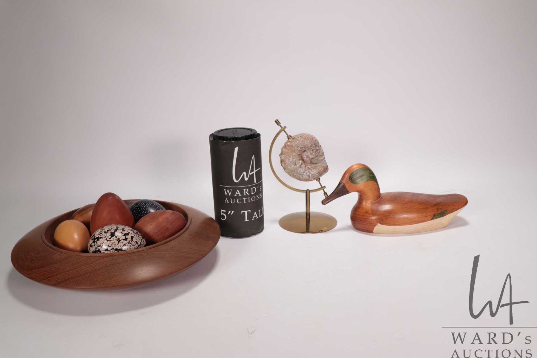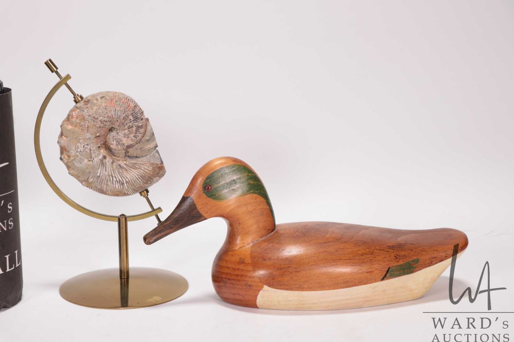 Tray lot of collectibles including turned wooden "nest" with a selection of turned wood and stone eggs, hand carved small "Green Winged Teal' duck decoy, signed by artist Jim Harknesss, Stayner, Ontario 1984 and an ammonite fossil in a brass display