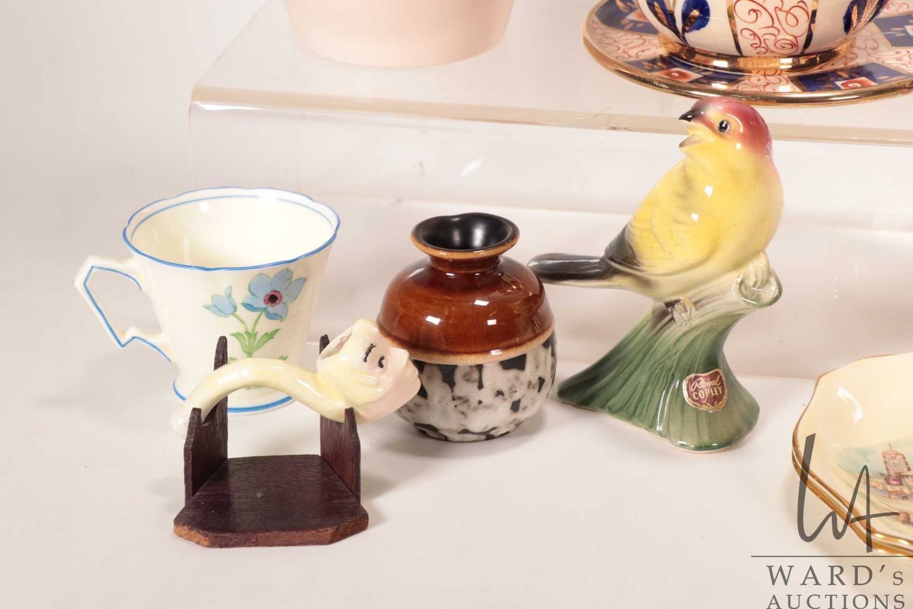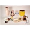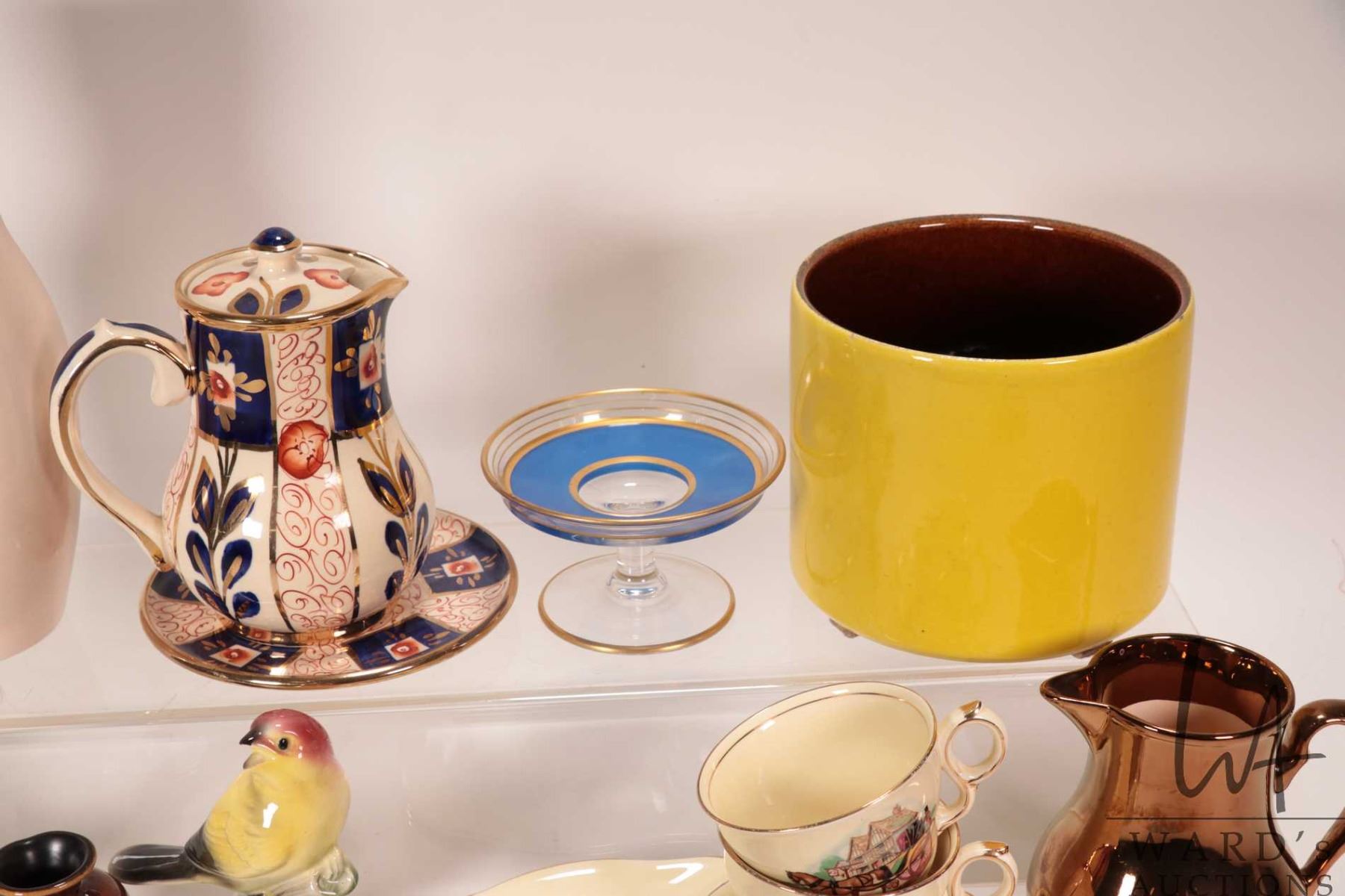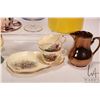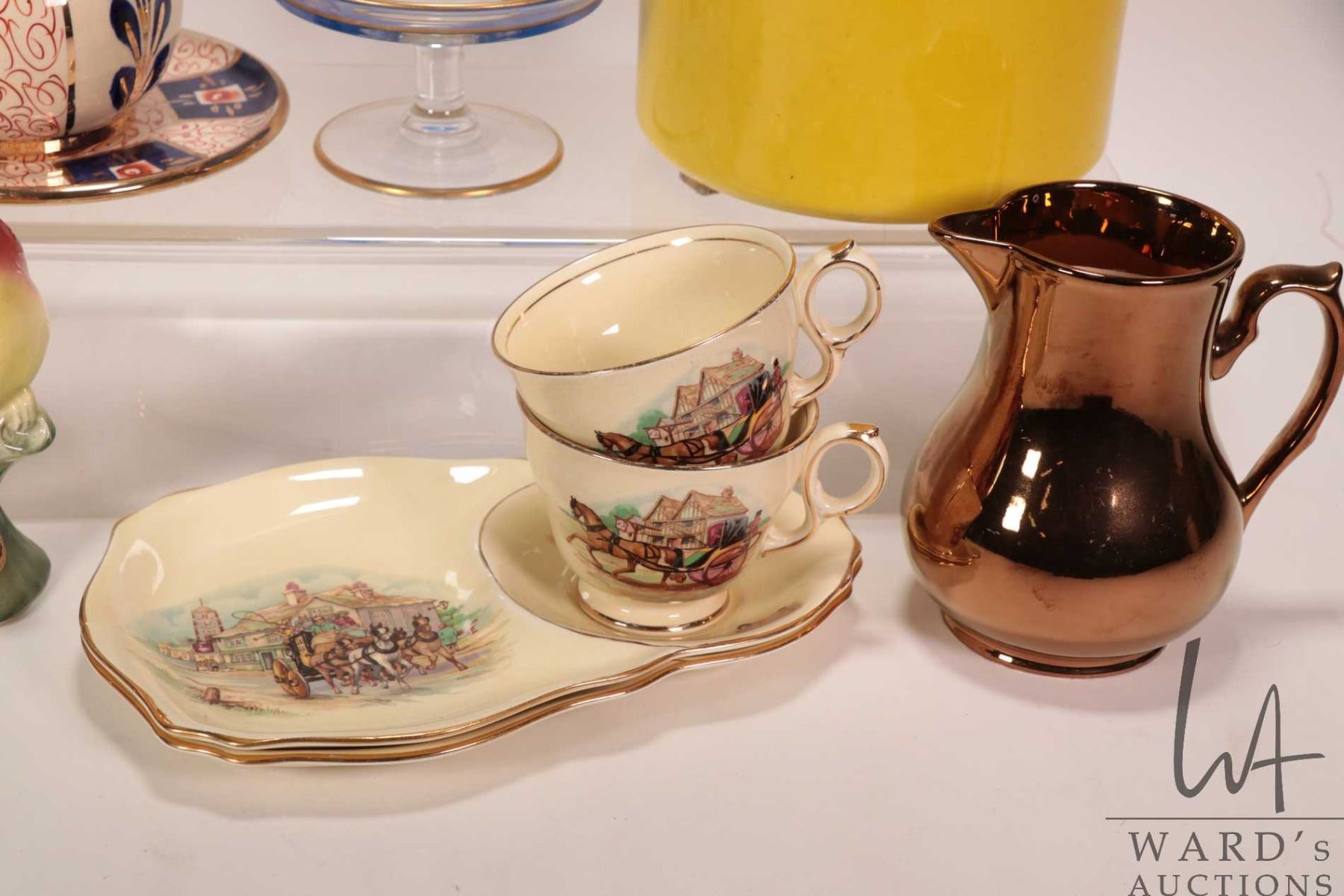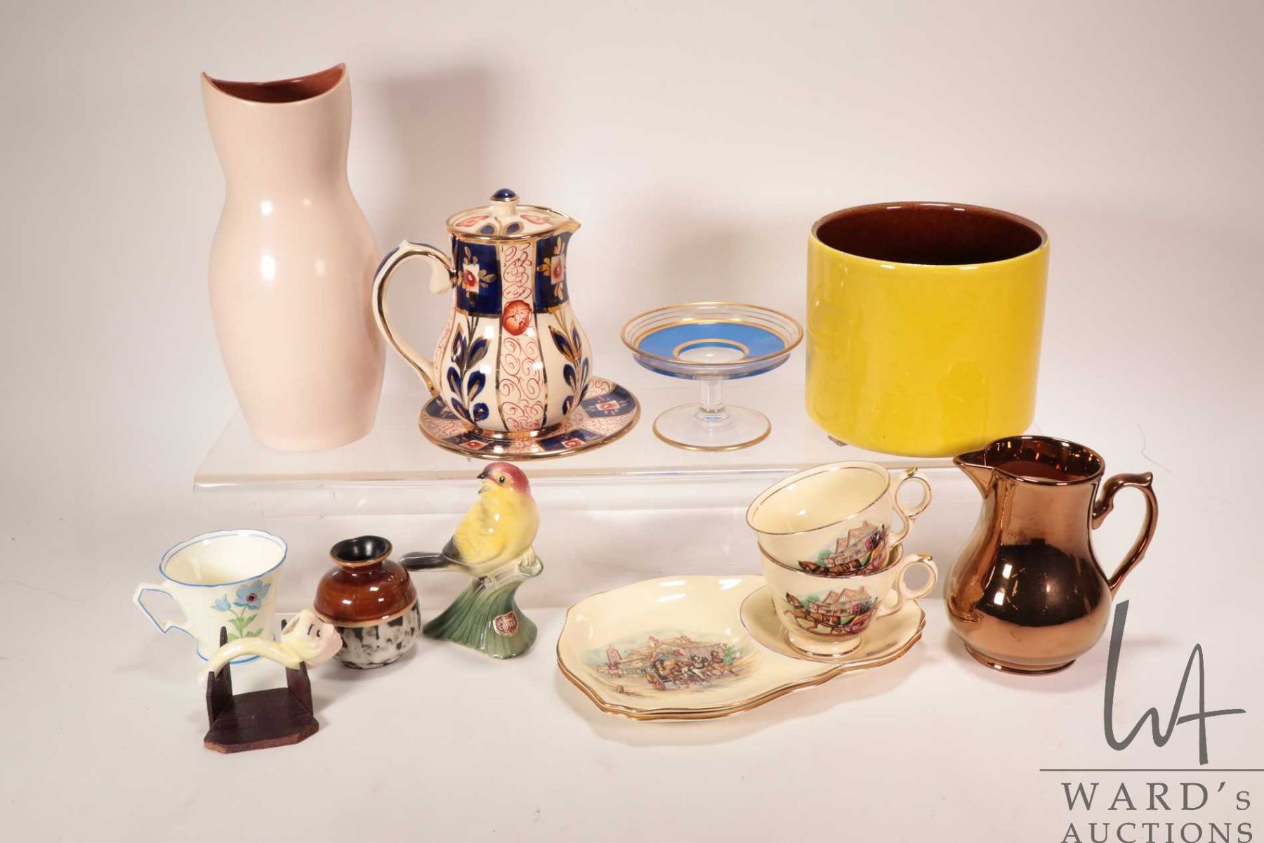 Tray lot of collectibles including two Royal Winton tennis sets, Wade copper luster pitcher, West German small jardinere, Imari cream pitcher and trivet, Royal Norfolk pottery vase and a New Chelsea "St. Ives" hand painted teacup, no saucer etc.