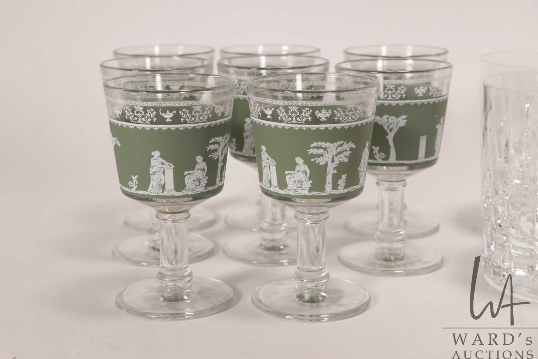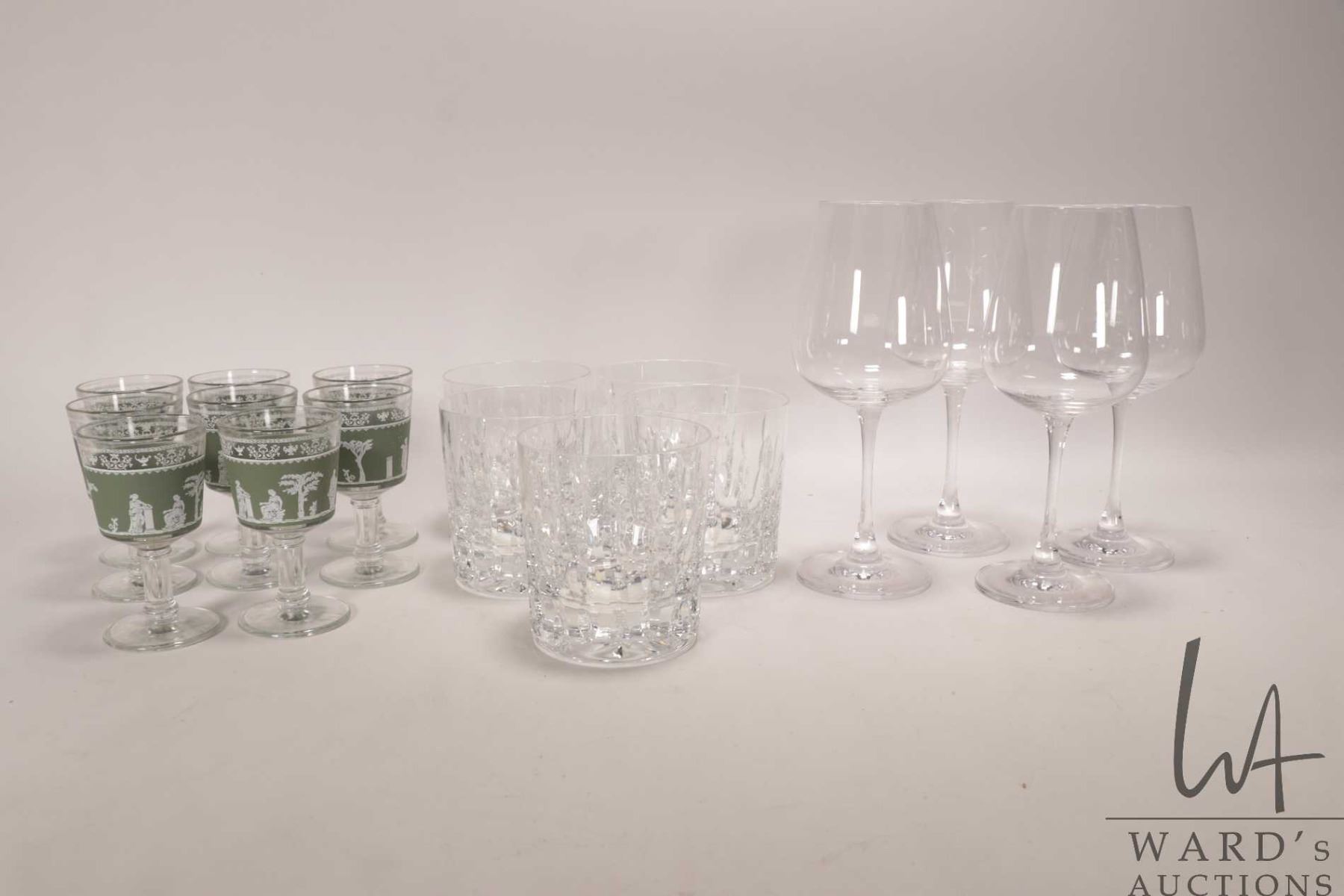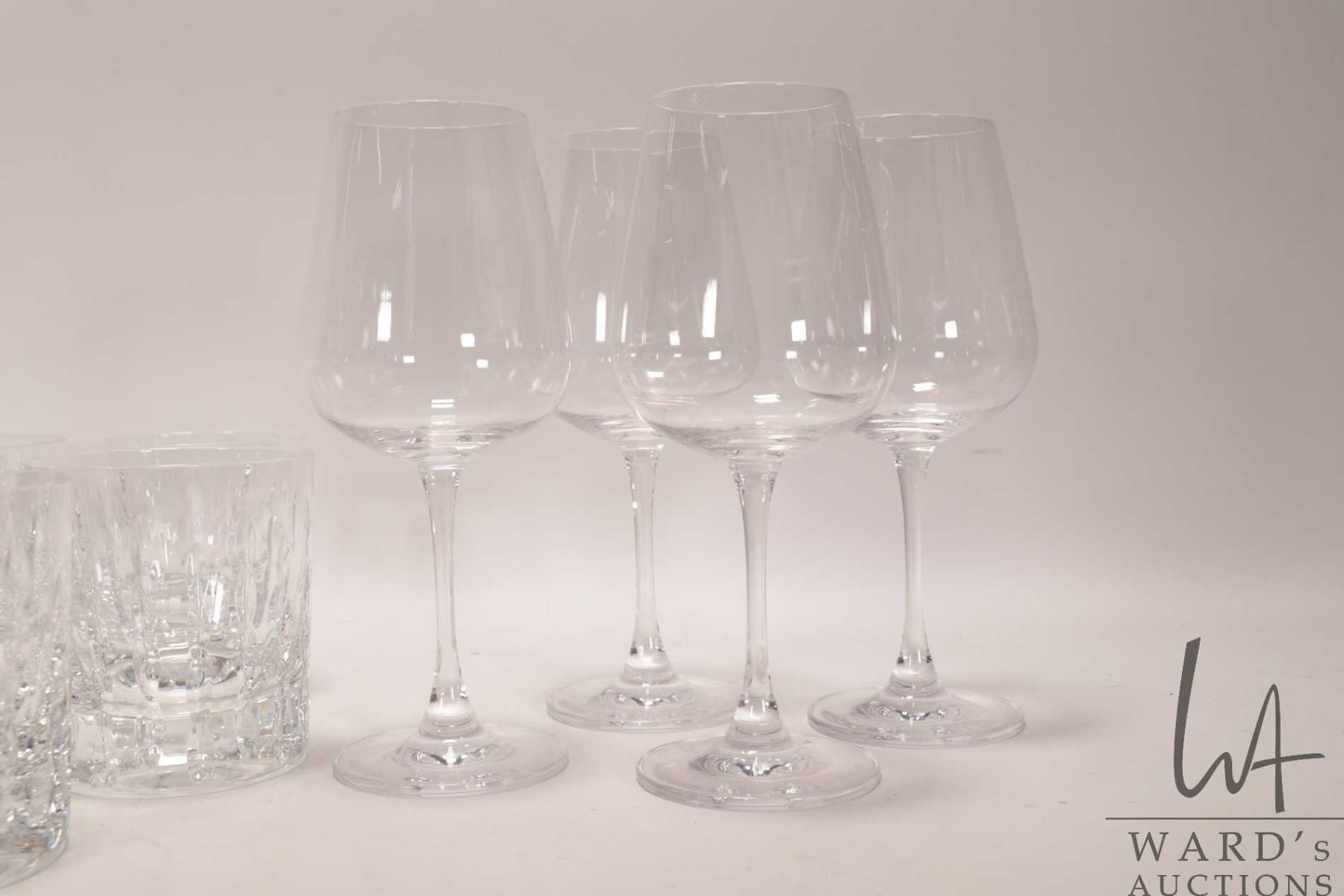 Tray lot of glassware including five heavy tumblers, four crystal wine glass and eight Jeanette Hell