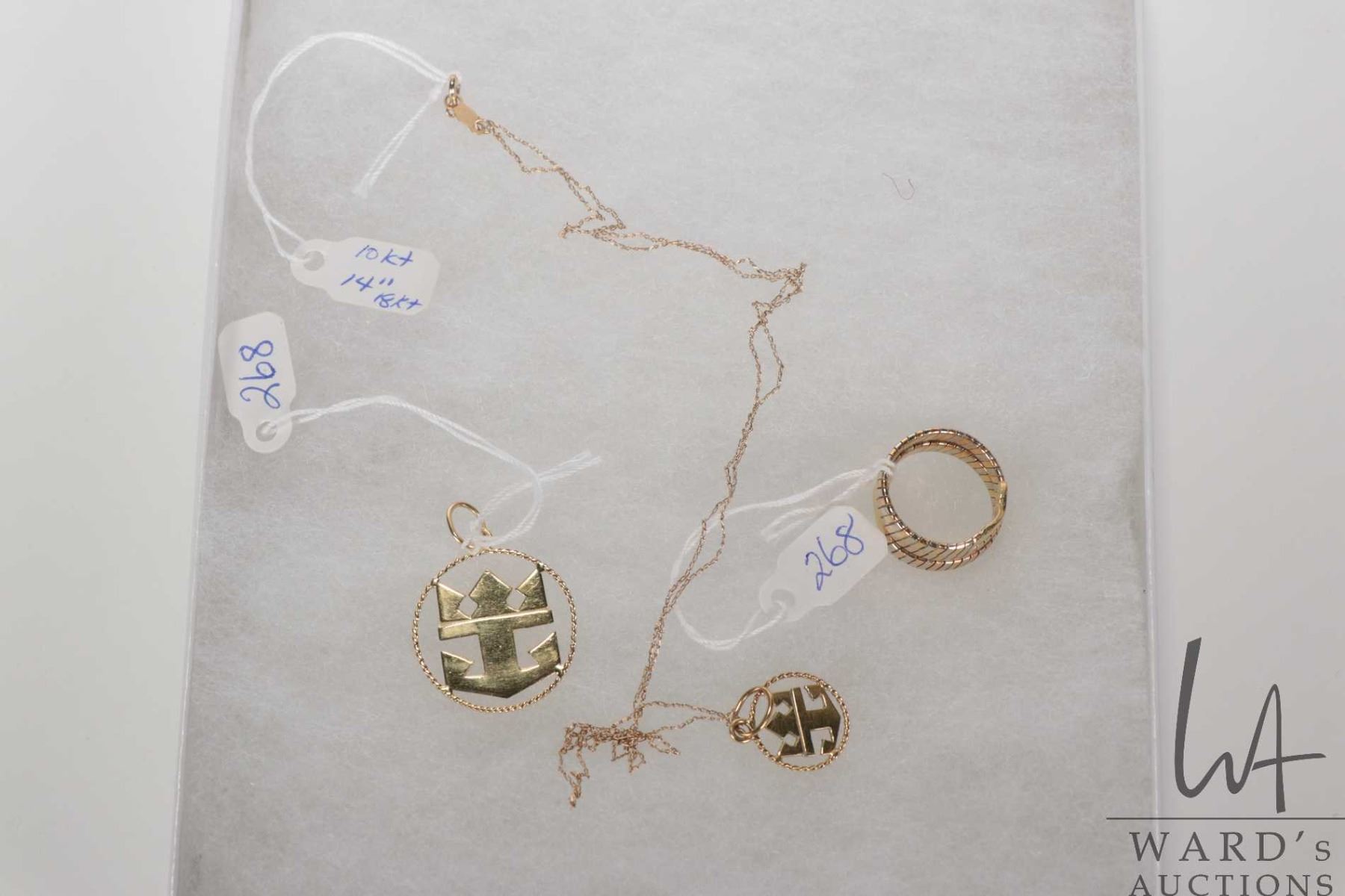 Tray lot of gold jewellery including 18kt tri-gold adjustable snake motif ring, 18kt Gold Royal Caribbean cruise line logo pendant and a smaller 18kt gold cruise line pendant on a 10kt yellow gold 14" fine gold neck chain