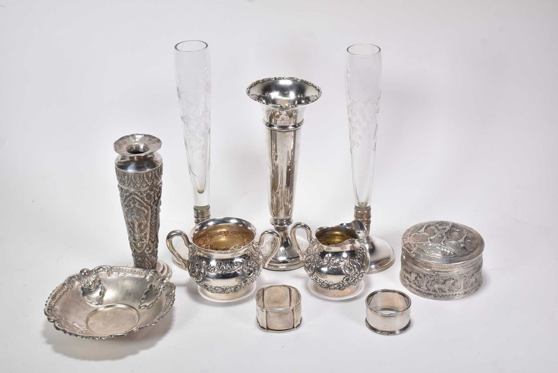 Tray lot of sterling silver and silver-plate including sterling cream and sugar bowl, British sterling 8" vase, Birks napkin ring, Tibetan silver 6 1/4" vase and a lidded box etc.