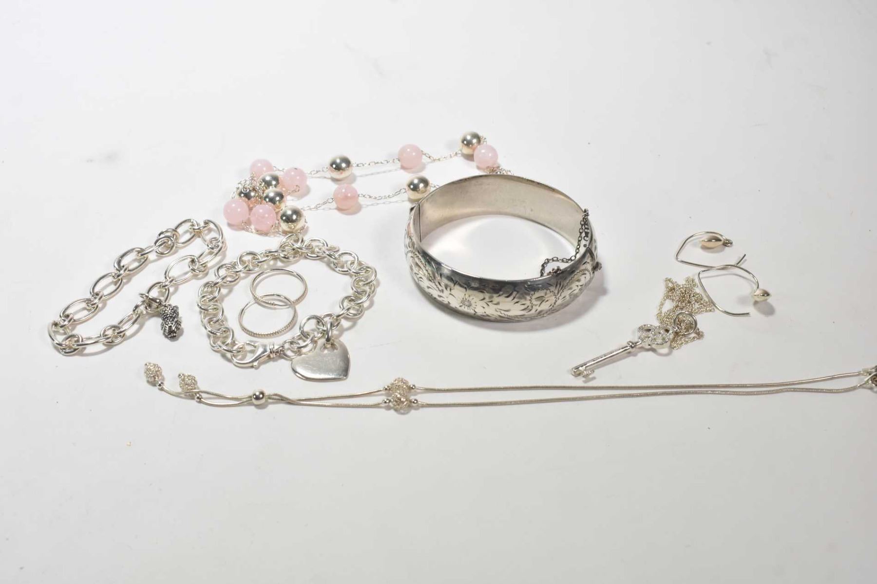 Tray lot of sterling silver jewellery including Tiffany style key set with rhinestone on a chain, two pairs of earrings, sterling and pink ball bead necklace, two linked bracelets with attached charms and a necklace with filigree bead decoration plus a chaised sterling silver hinged bracelet