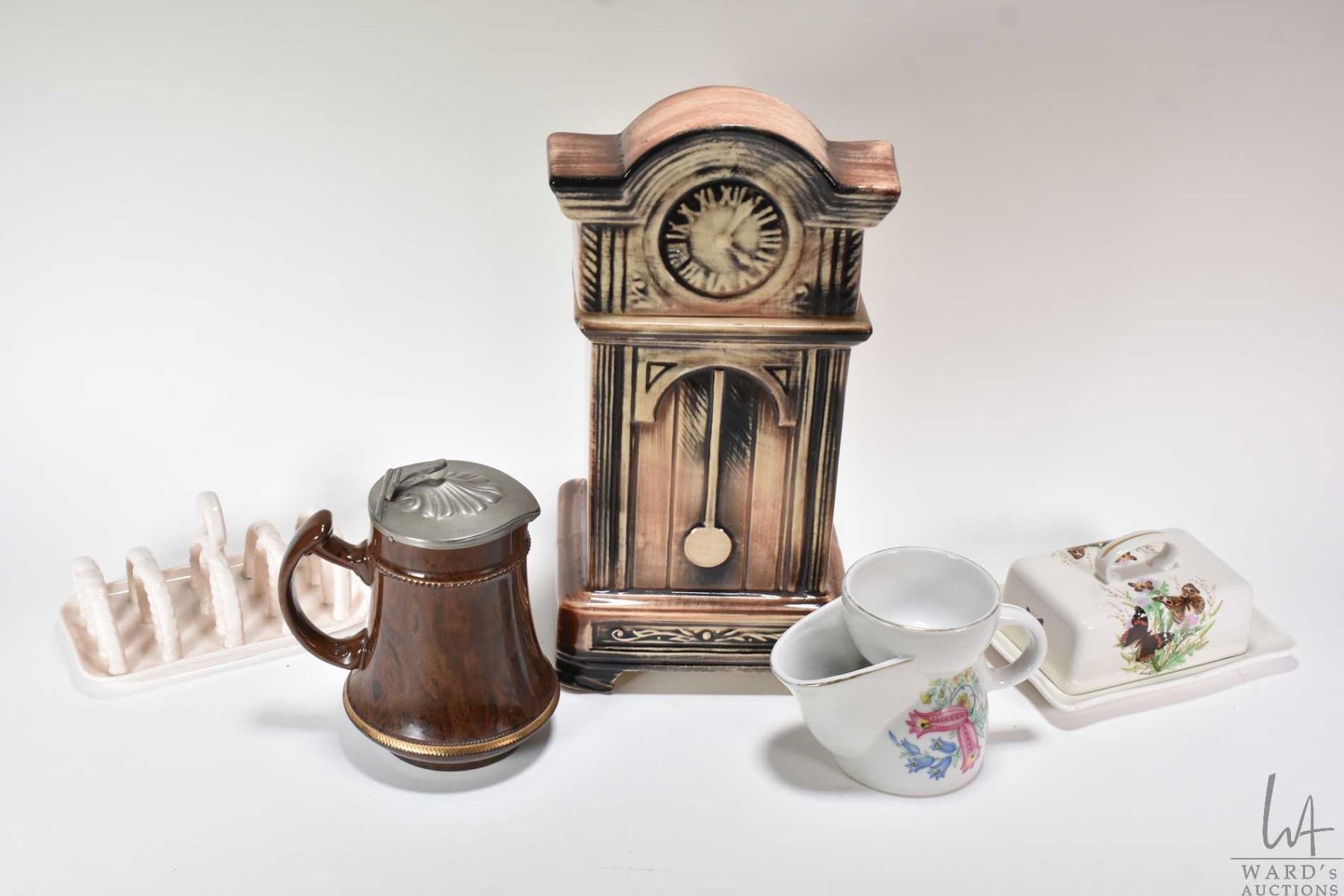 Tray lot of vintabe china collectibles including Victoria Pottery toast rack, Royal Cauldron cheese keep, tankard with pewter lid, shaving mug, and a USA marked clock cookie jar