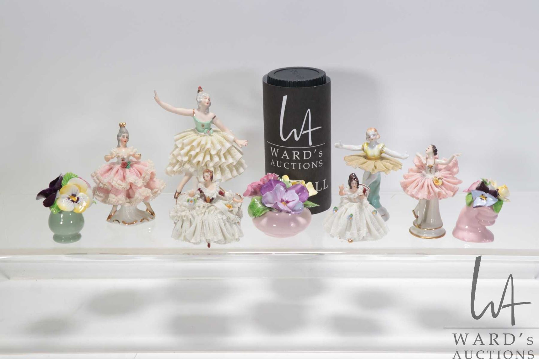Tray lot of vintage German Dresden figurines with lace draped skirts including 4 1/2" ballerina, miniature 2 1/4" seated ladies, plus three china florals