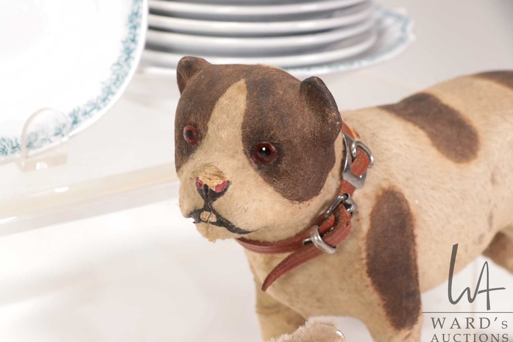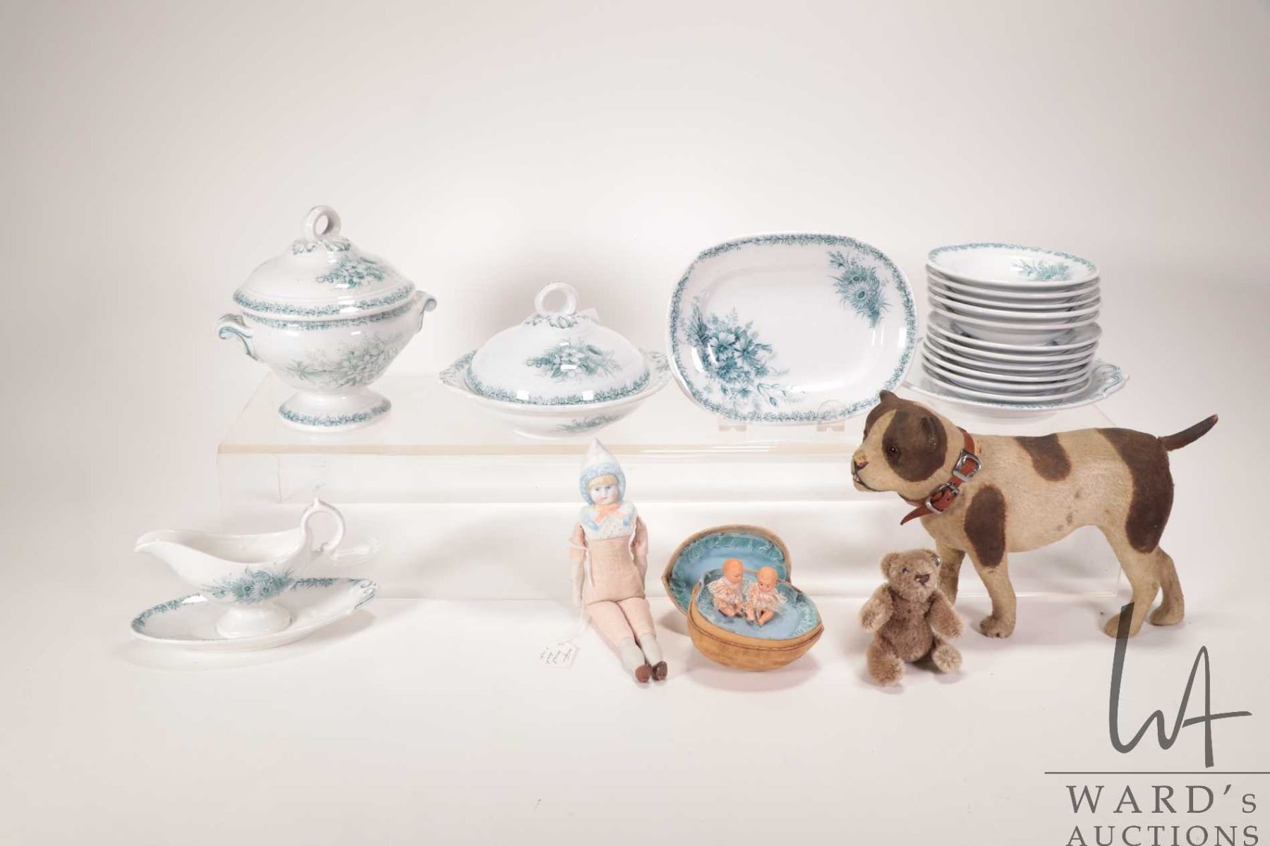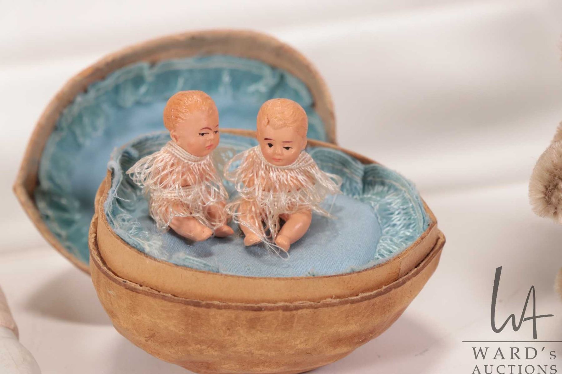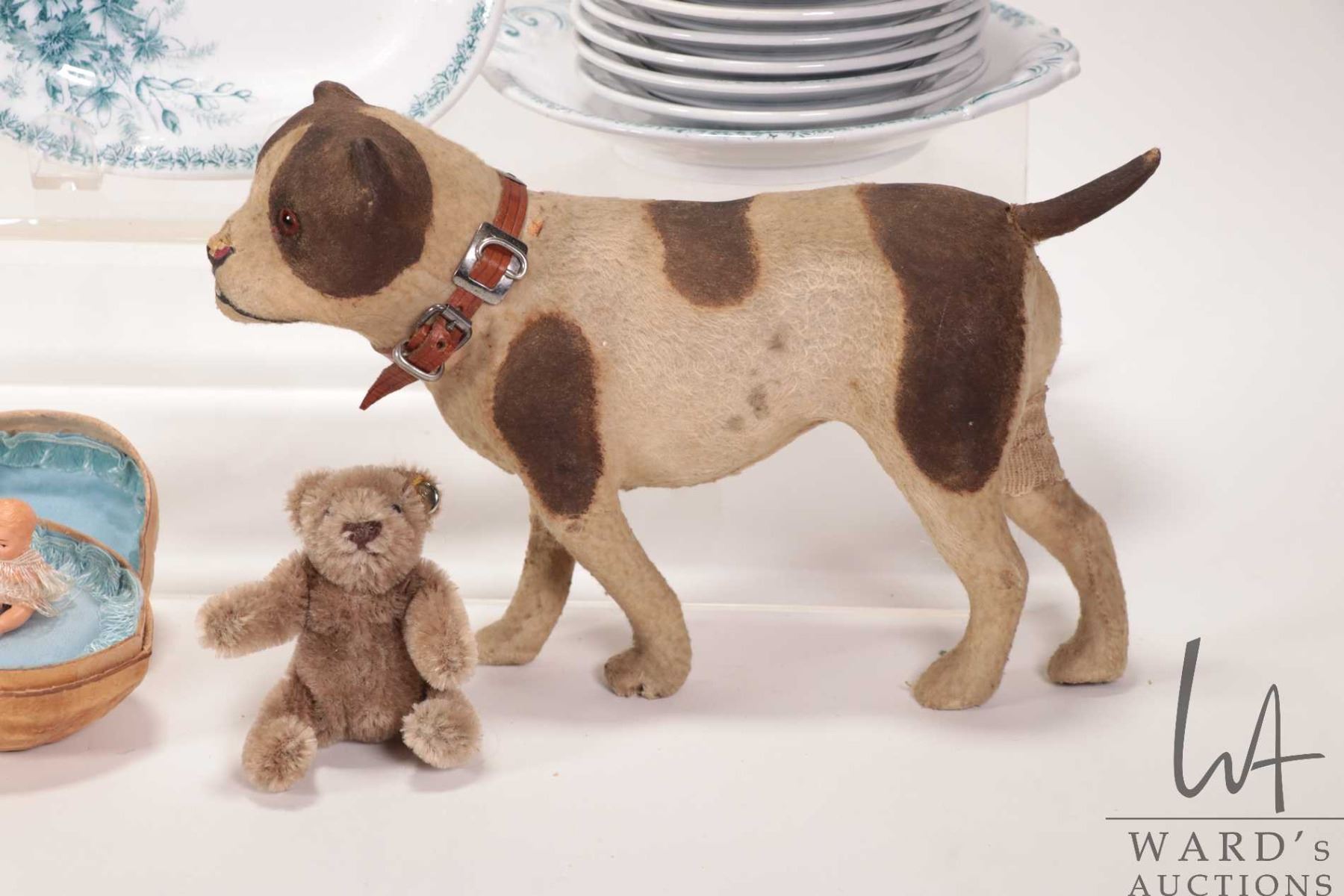 Tray lot of vintage and antique toys including German dish set, small 7" bisque head doll, miniature Steiff teddy bear, a pair of babies in a walnut and an 8 1/2" L dog, note: broken legs