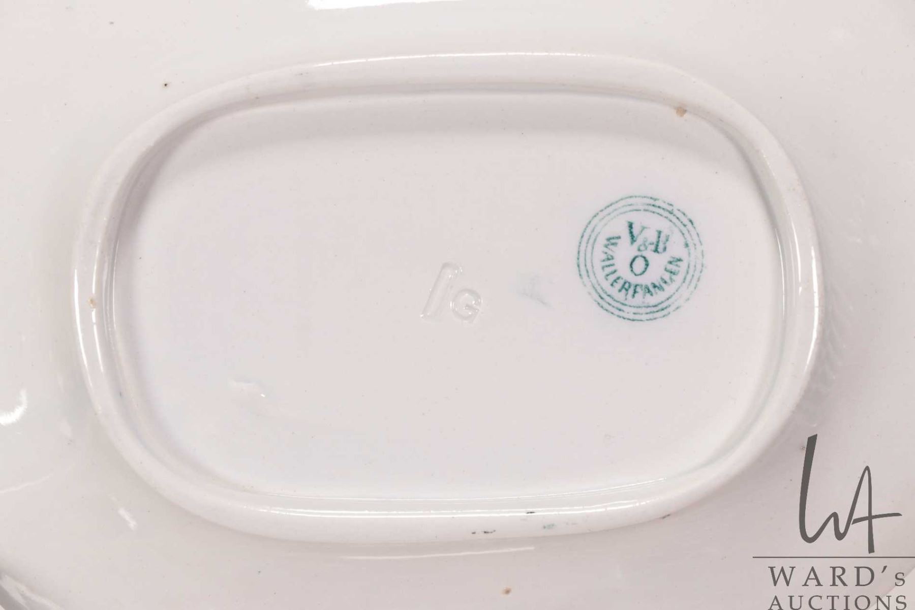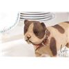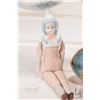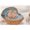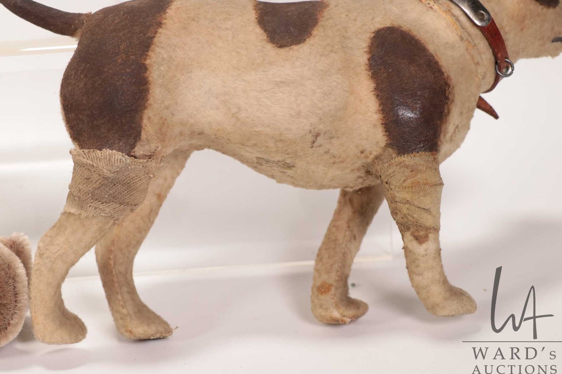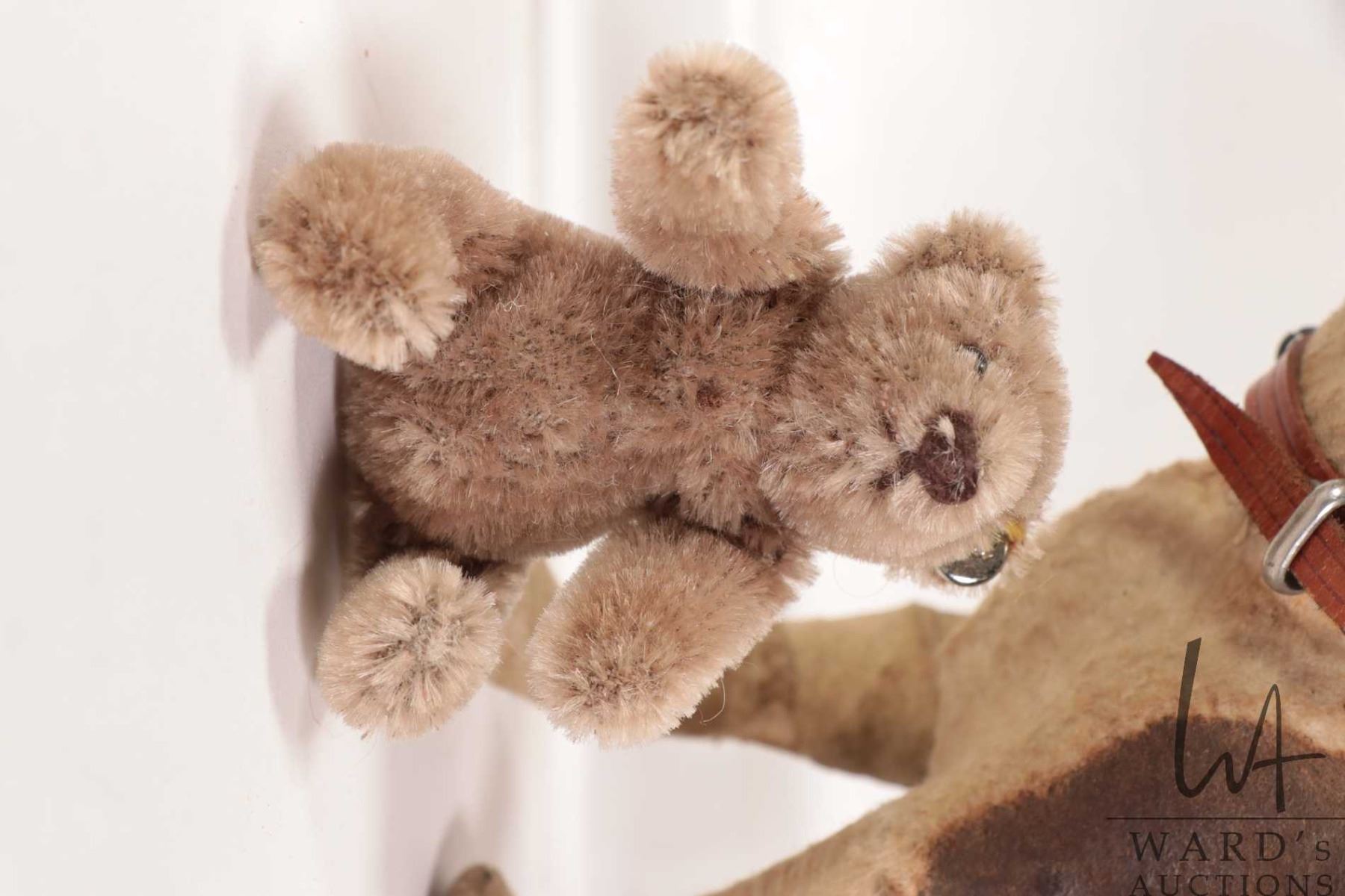 Tray lot of vintage and antique toys including German dish set, small 7" bisque head doll, miniature Steiff teddy bear, a pair of babies in a walnut and an 8 1/2" L dog, note: broken legs