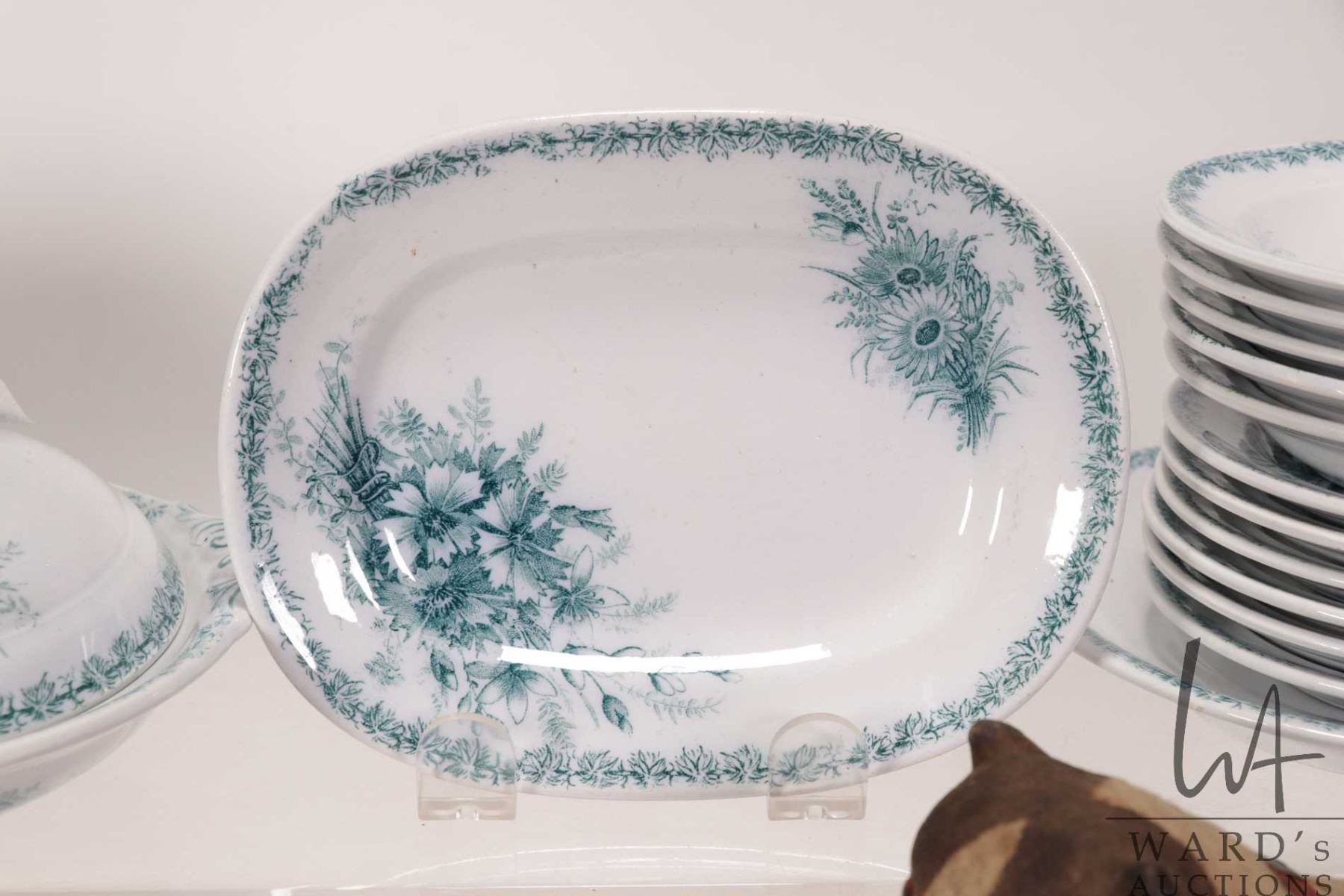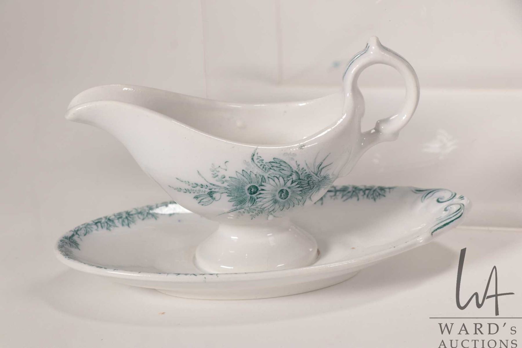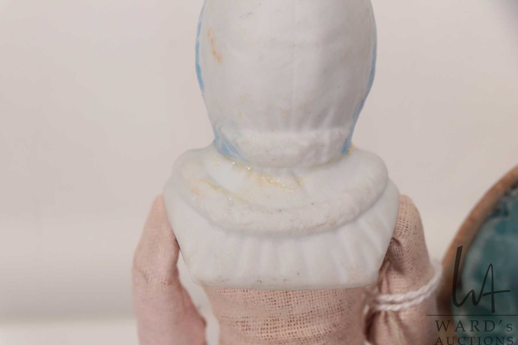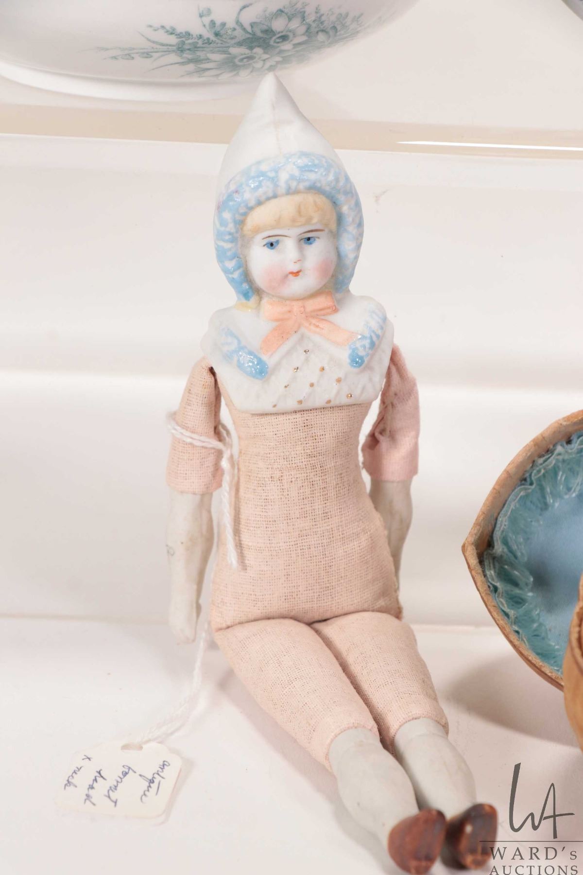 Tray lot of vintage and antique toys including German dish set, small 7" bisque head doll, miniature