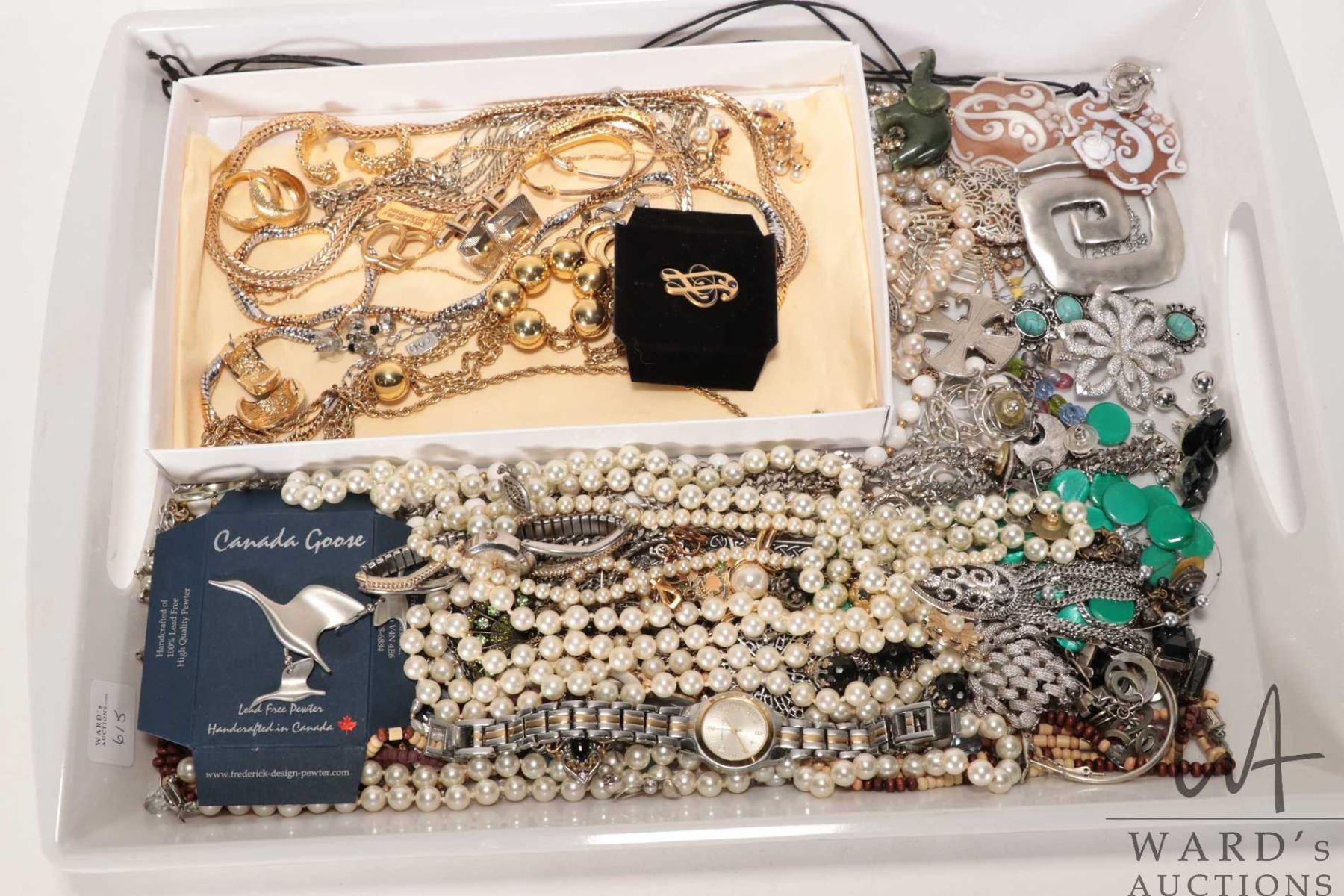 Tray lot of vintage and collectible costume jewellery including beaded necklaces, brroches, earrings, neck chains, pendants, watches, earrings etc.