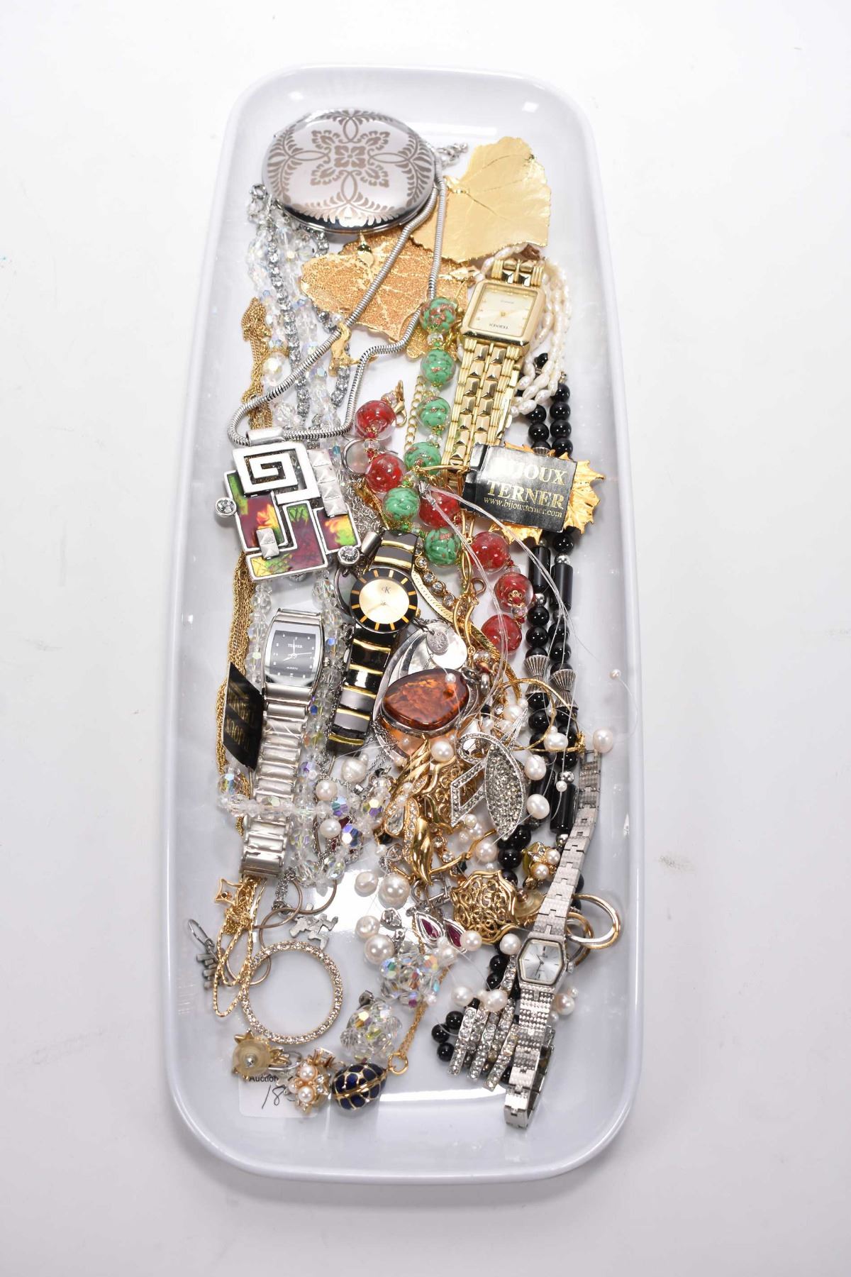 Tray lot of vintage and collectible costume jewellery including neck chains and pendants, lamp bead bracelets, earrings, watches, genuine pearls etc.