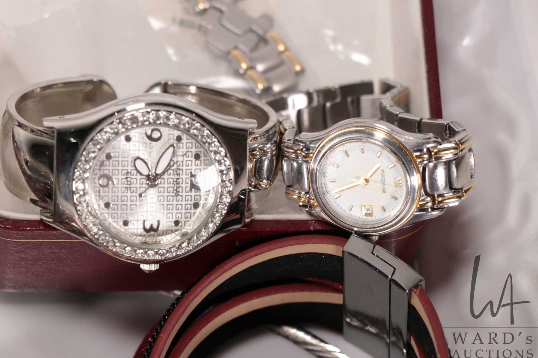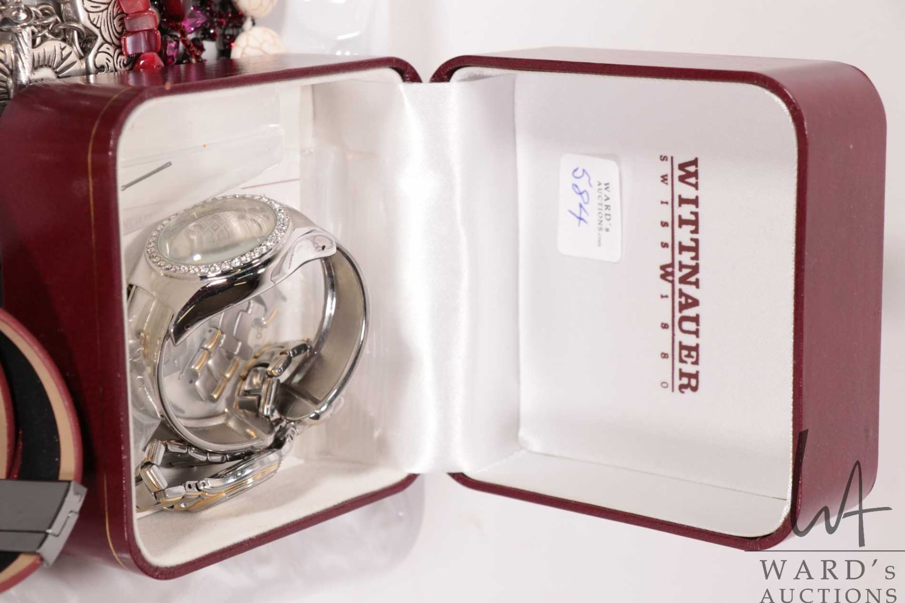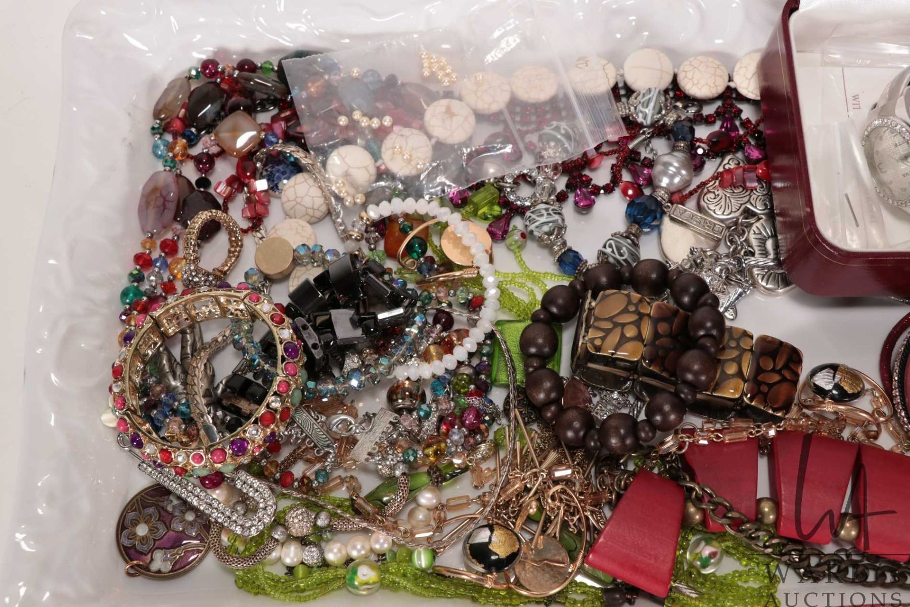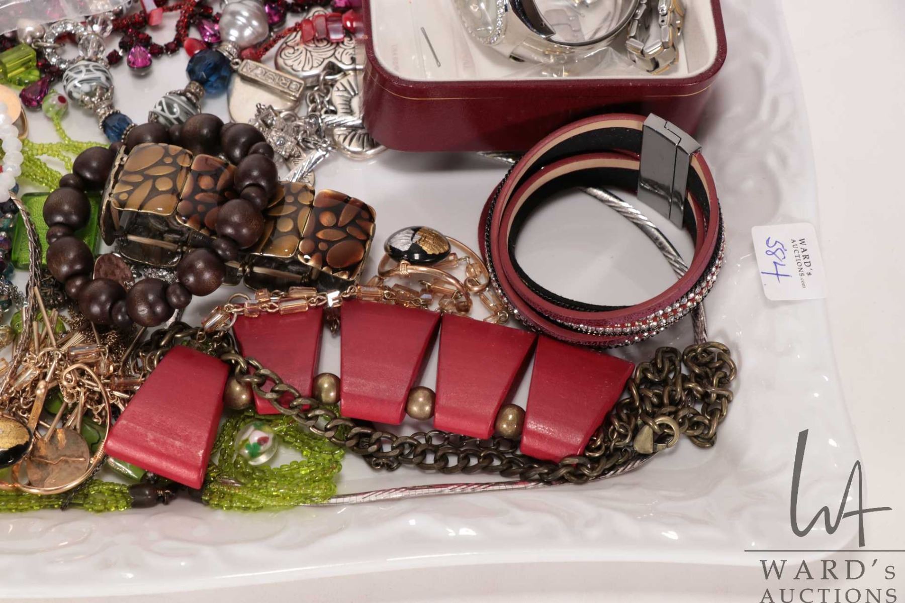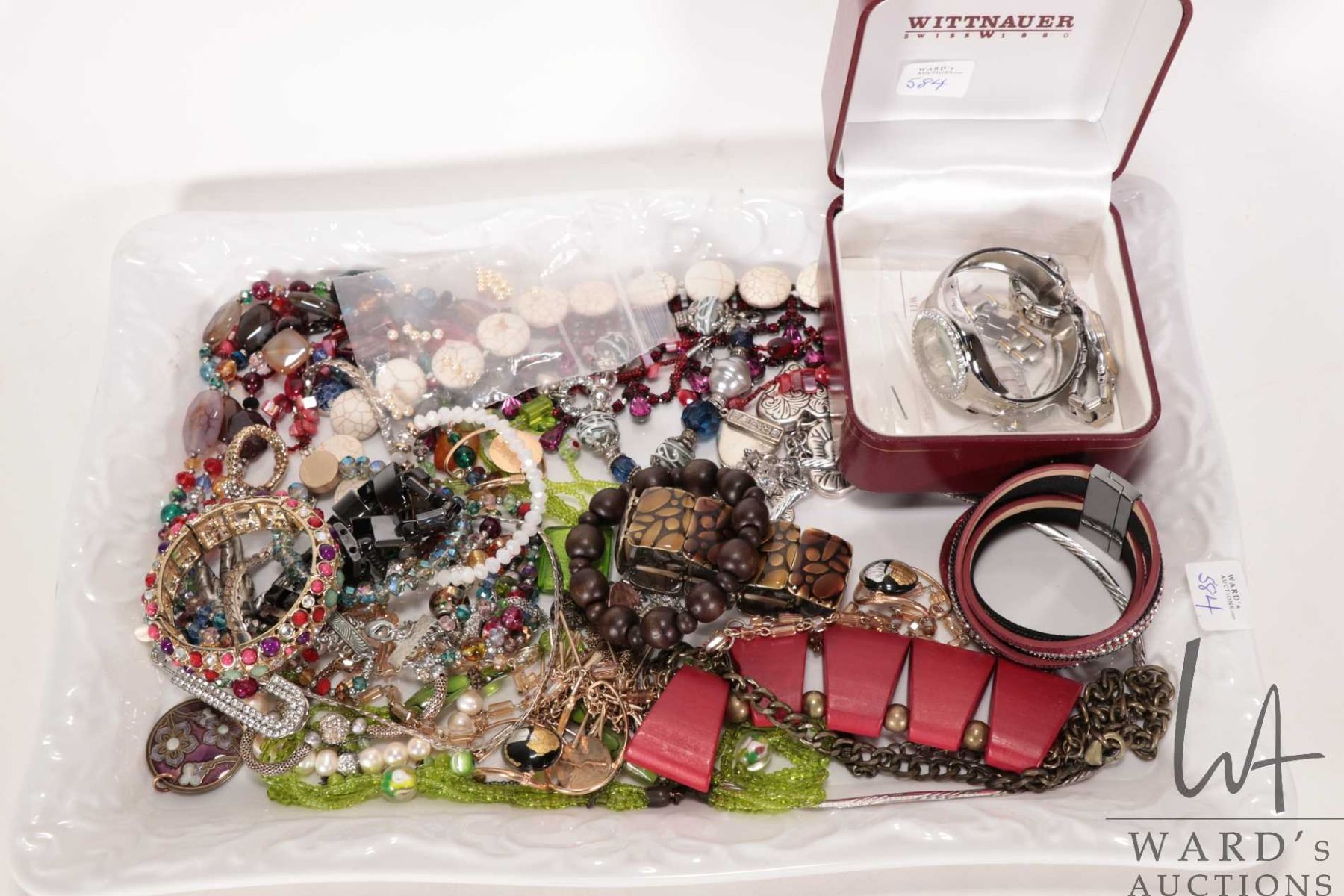 Tray lot of vintage and collectible custom jewellery including gold filled earrings, beaded necklaces, sterling silver necklace, watches including Wittnauer, bracelets, necklaces, brooches etc.