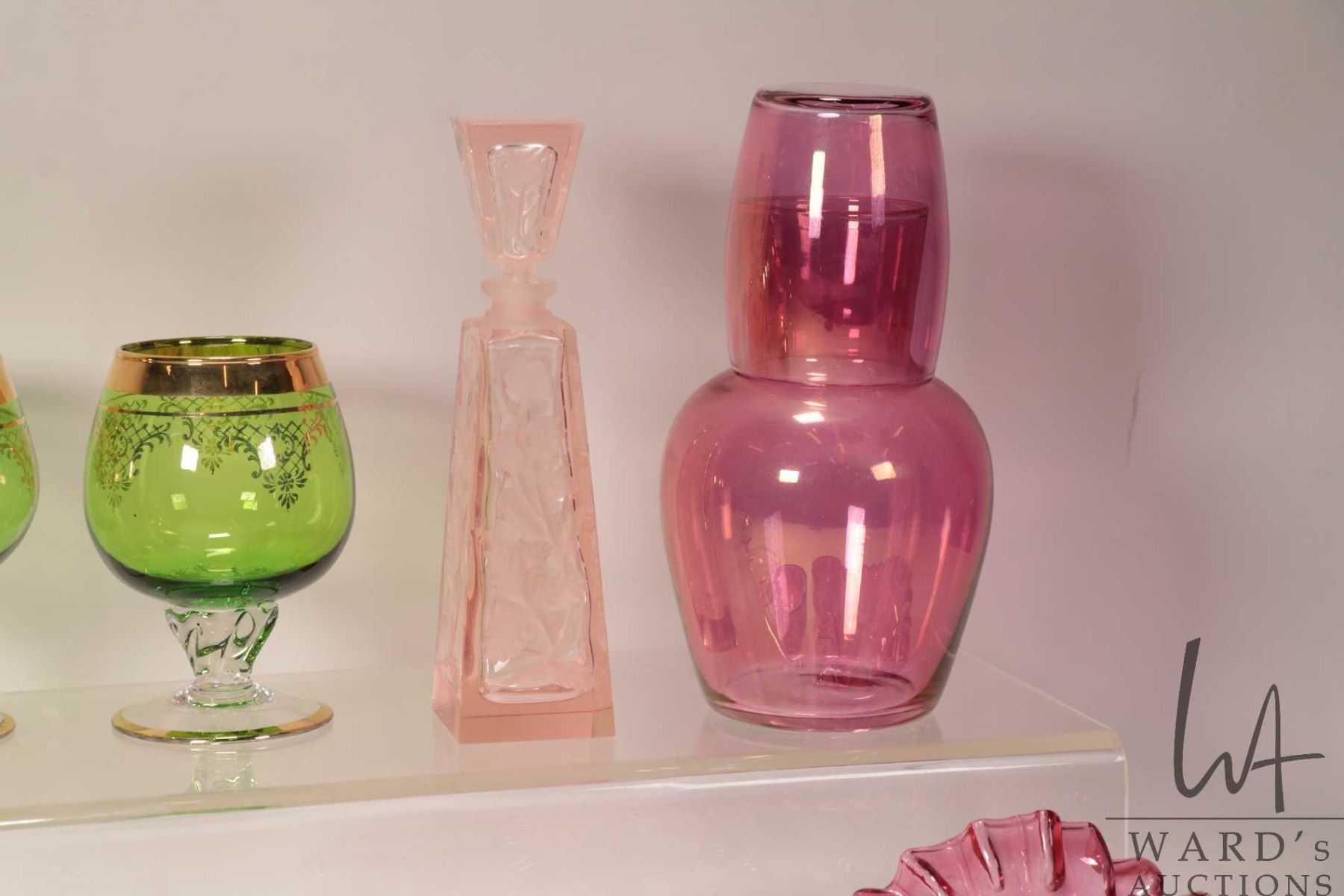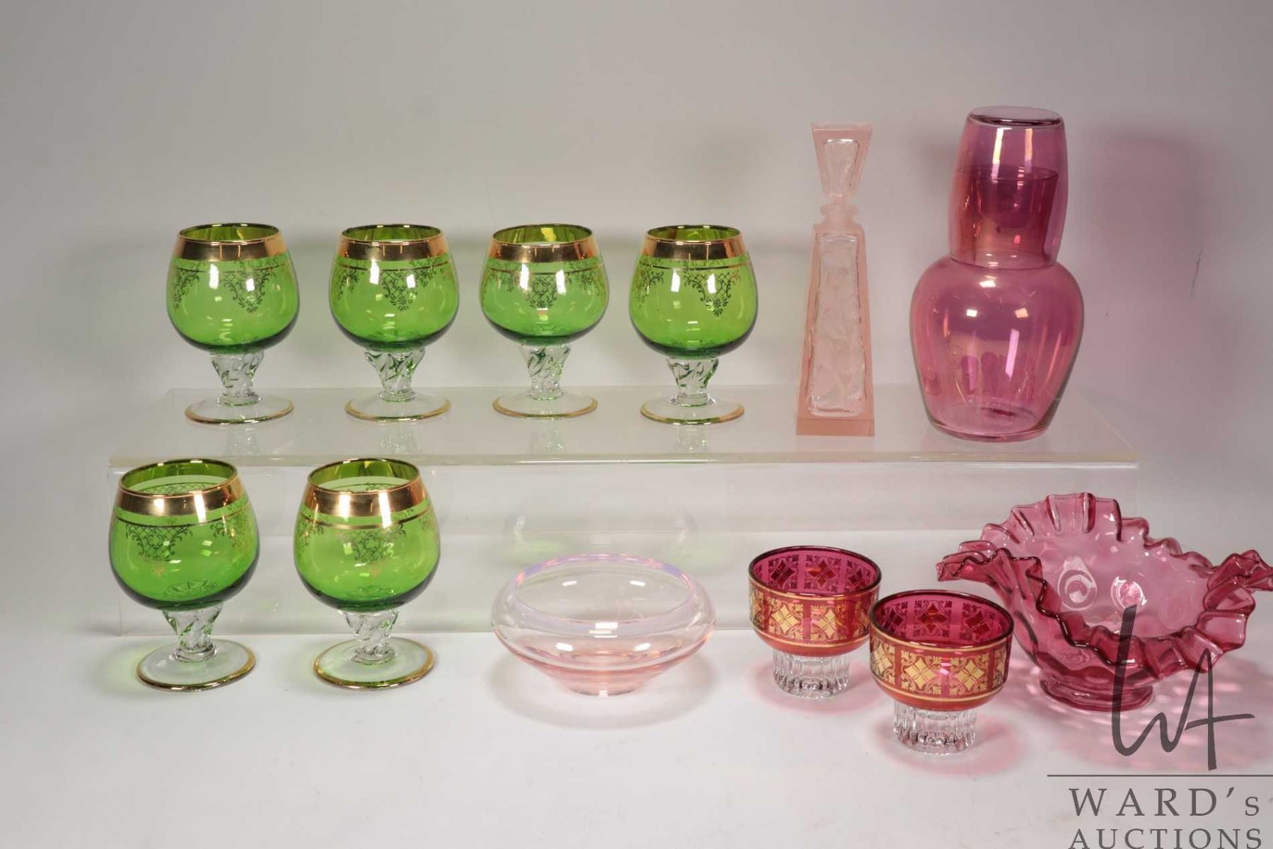 Tray lot of vintage and collectible glassware including six emerald green Bohemian glass snifters, cranberry dimpled dish with ruffled edge, cranberry water jug with drinking glass, pink etched perfume, pink shallow rose bowl and two ruby and gold candleholders with clear bases