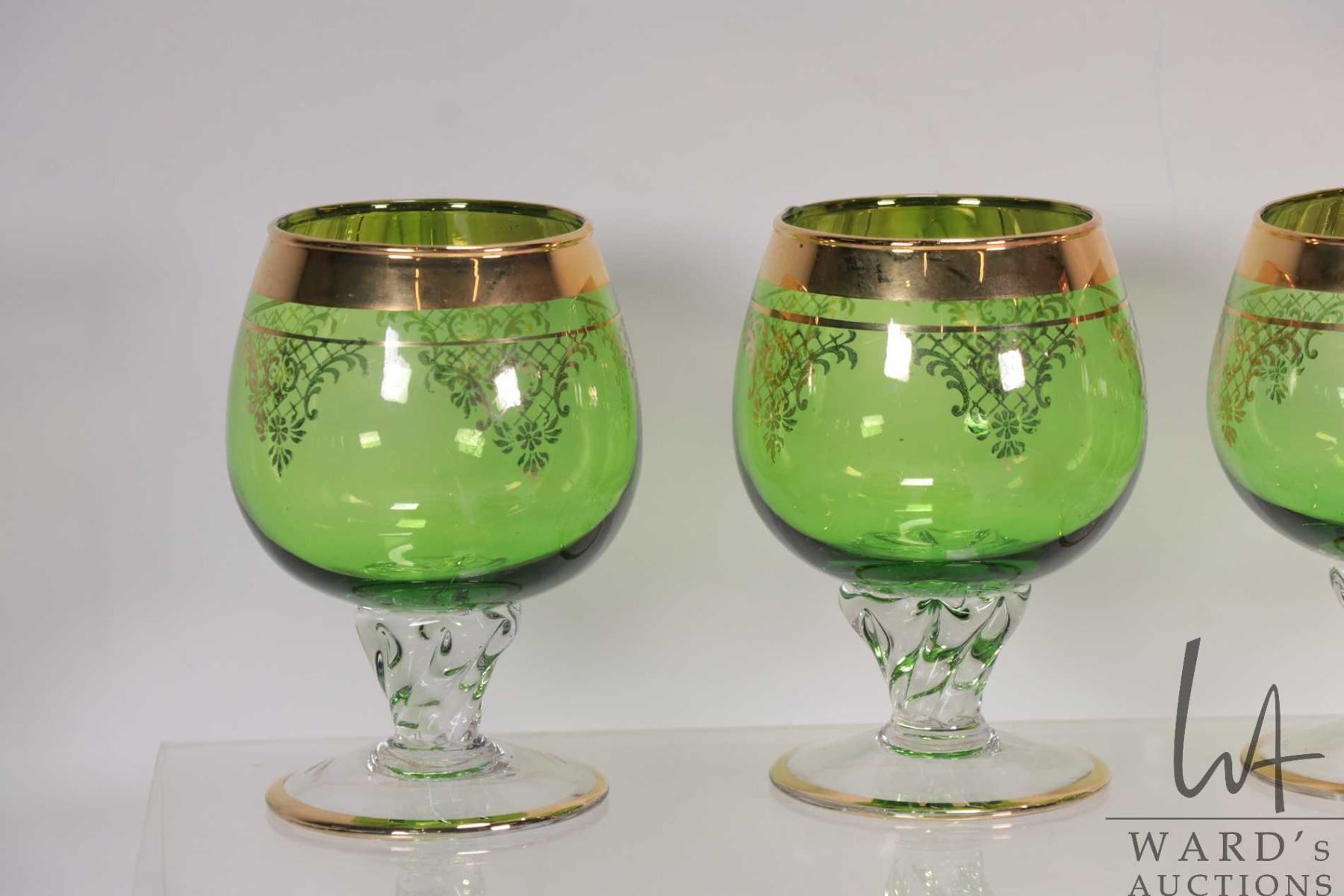 Tray lot of vintage and collectible glassware including six emerald green Bohemian glass snifters, c