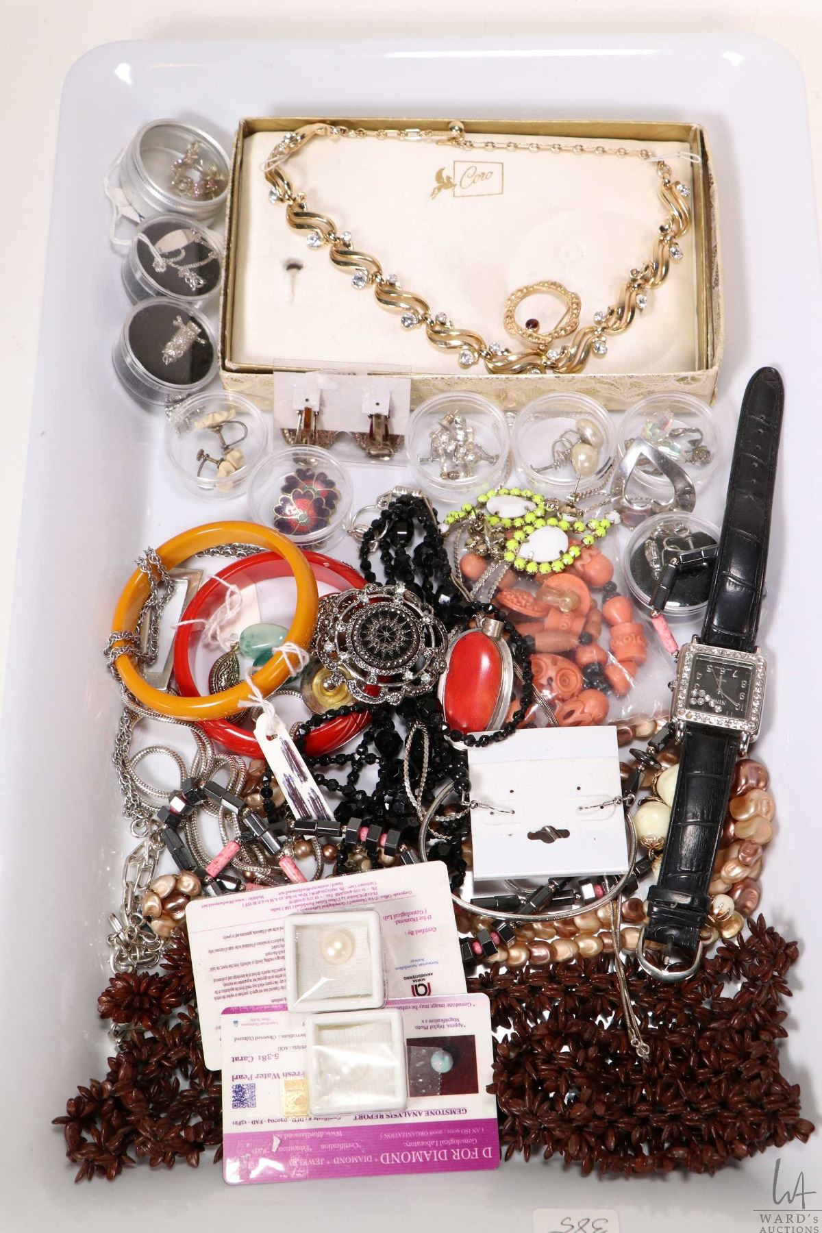 Tray lot of vintage and collectible jewellery including bakelite bangles, signed Coro necklaces, genuine pearls, silver and red jasper pendant, earrings etc.