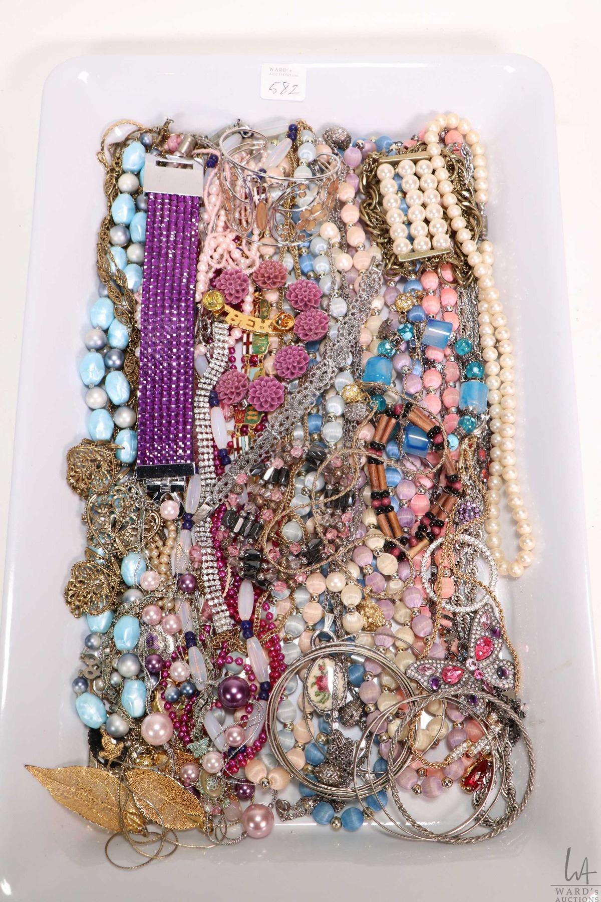 Tray lot of vintage and collectible jewellery including beaded bracelets, diamante bracelets, necklaces, bangles, pendants etc.