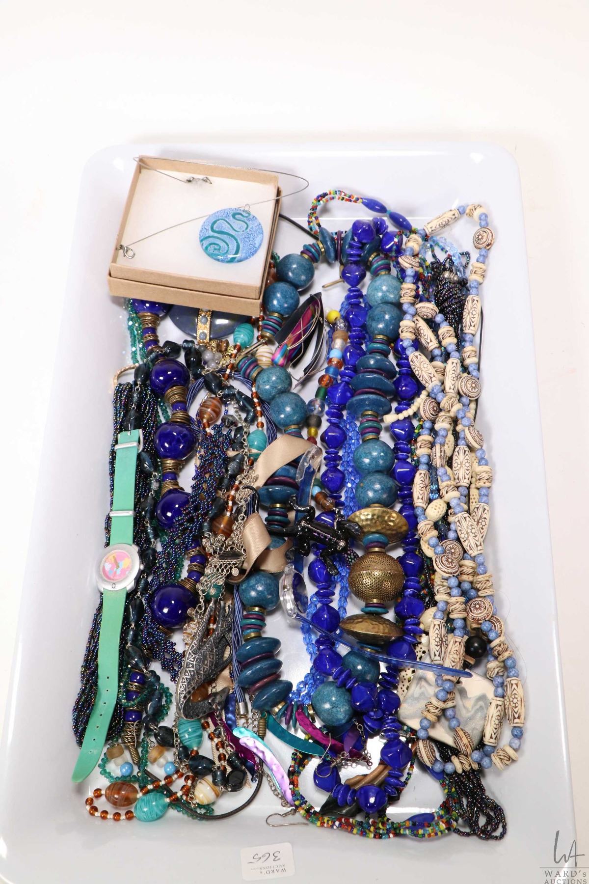 Tray lot of vintage and collectible jewellery including beaded necklaces, earrings, watch etc.