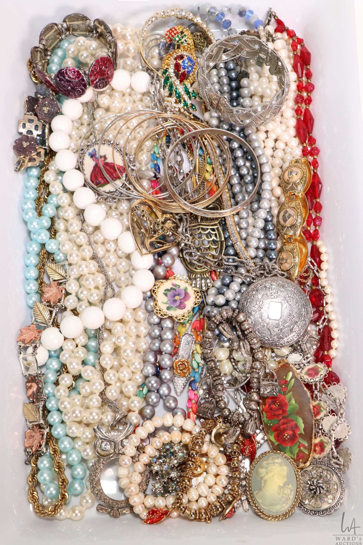 Tray lot of vintage and collectible jewellery including bracelets, beaded necklaces, pendants and chains, brooches etc.