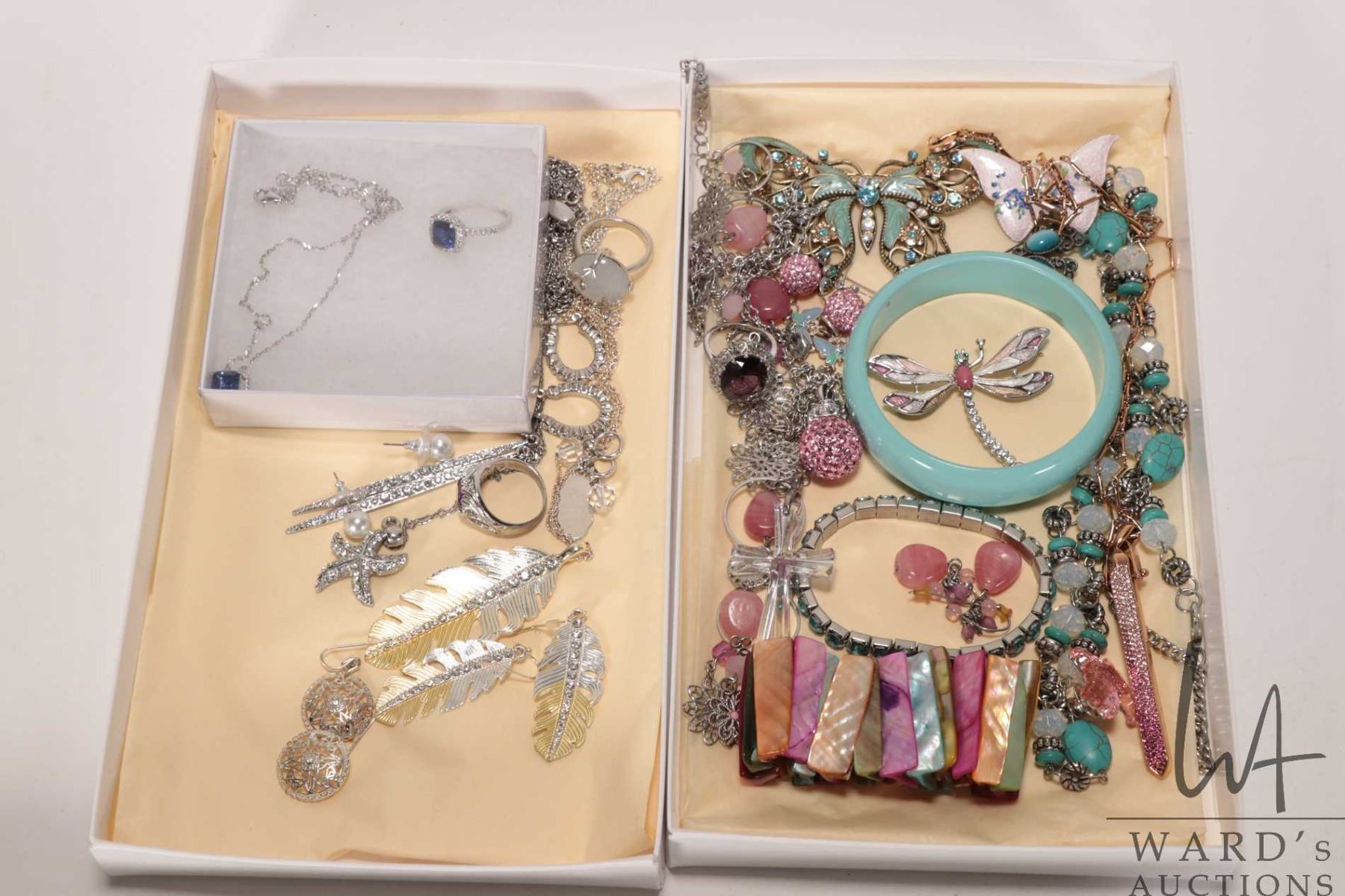 Tray lot of vintage and collectible jewellery including crystal earrings and pendants, gemstone like jewellery, enamel butterflies, sterling silver neck chain with blue gemstone and diamante accents with matching sterling silver ring etc.