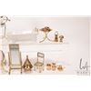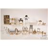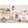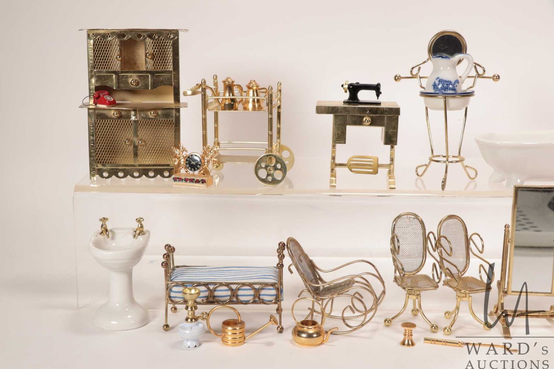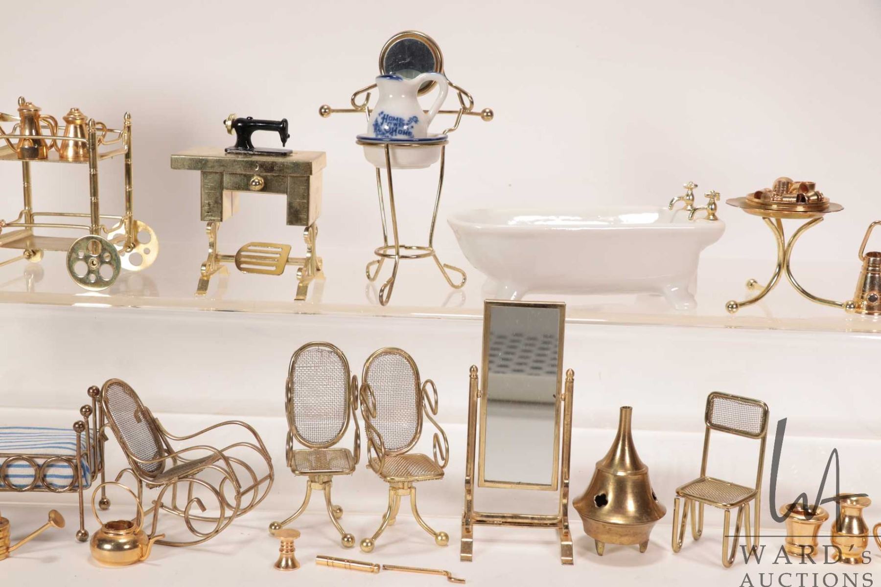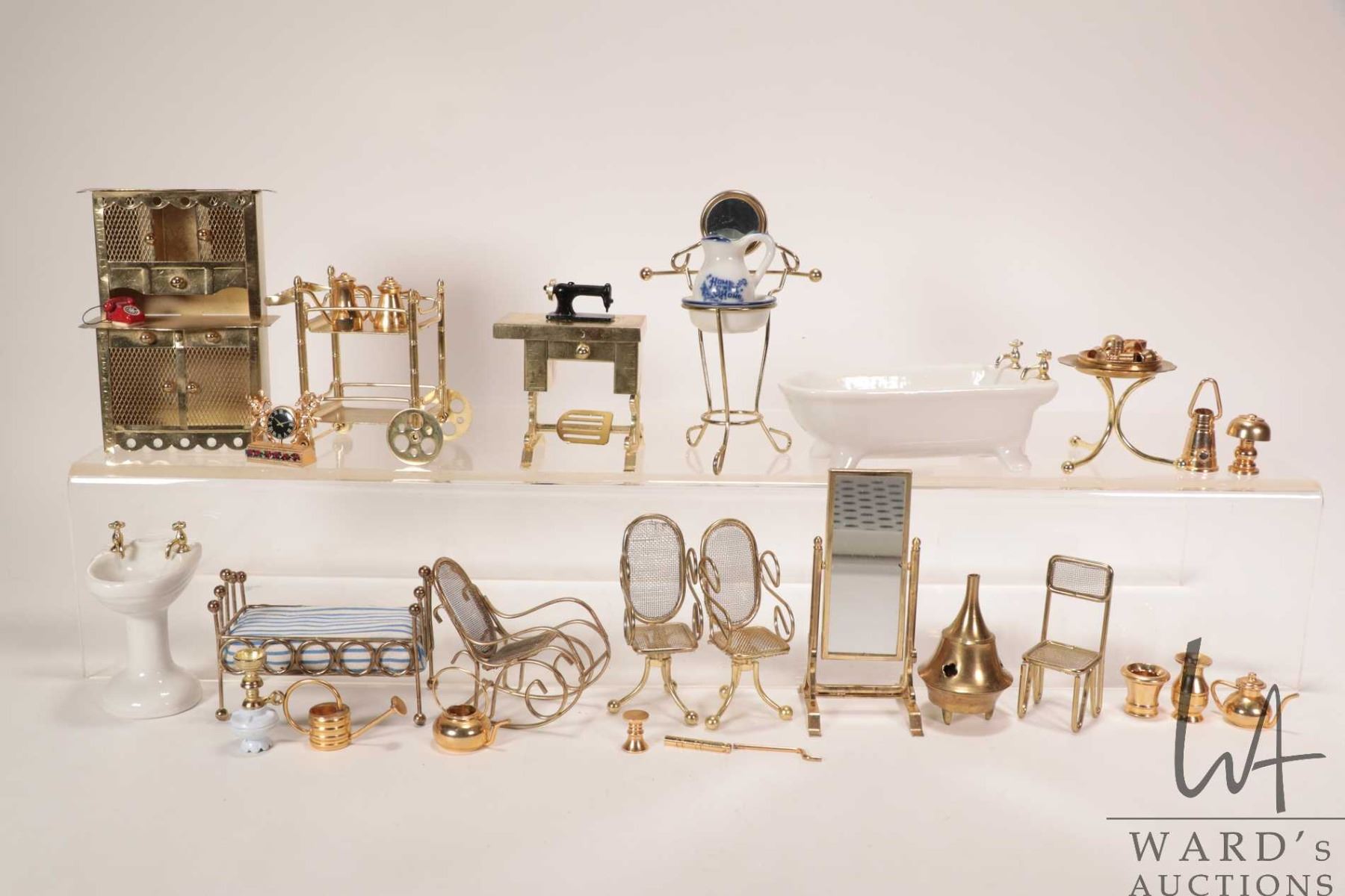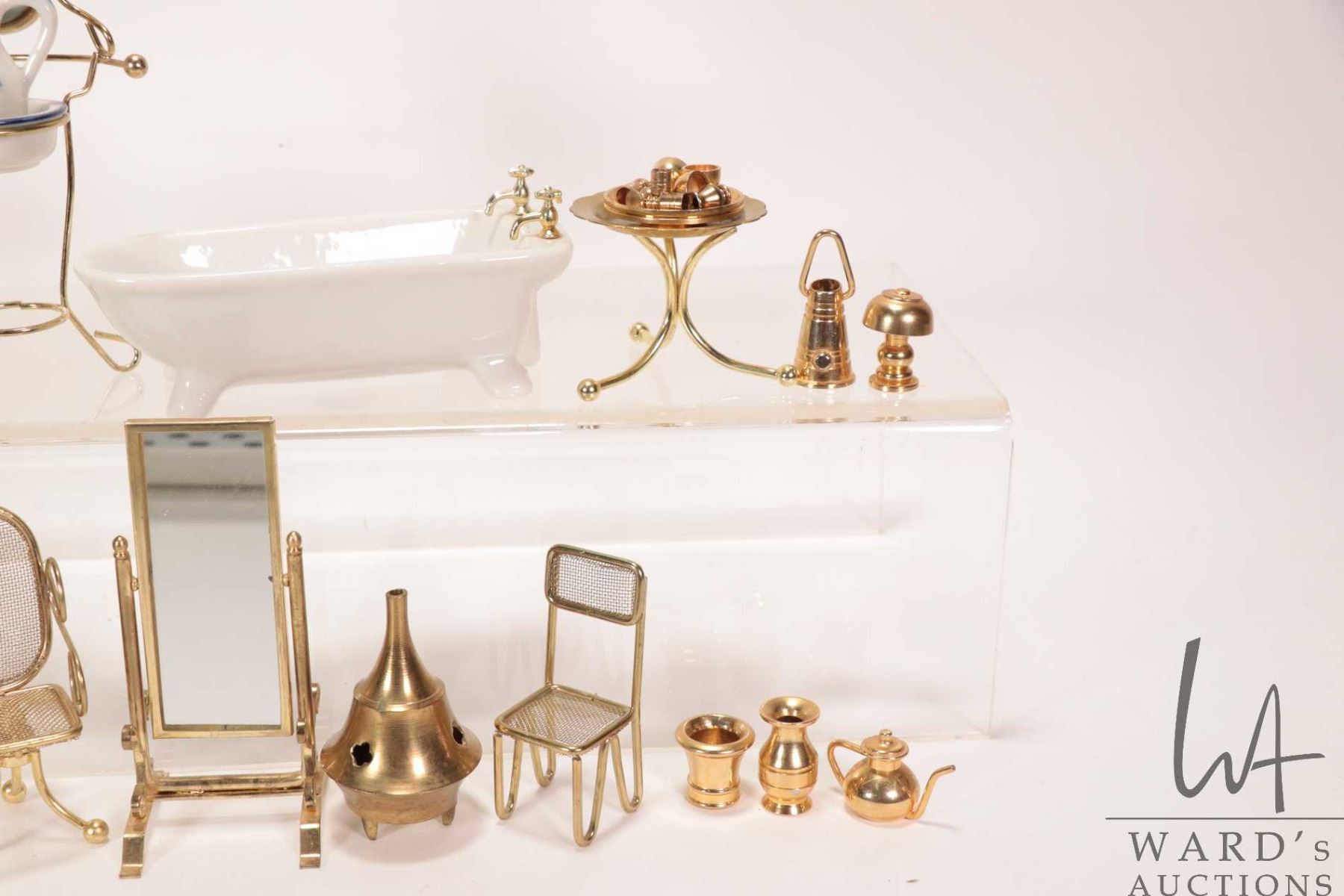 Tray lot of vintage brass dollshouse furniture plus a porcelain bath and toilet etc.