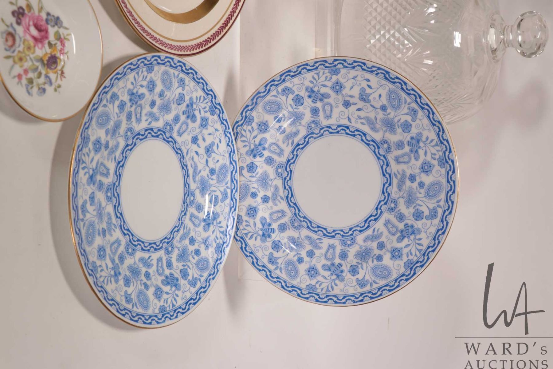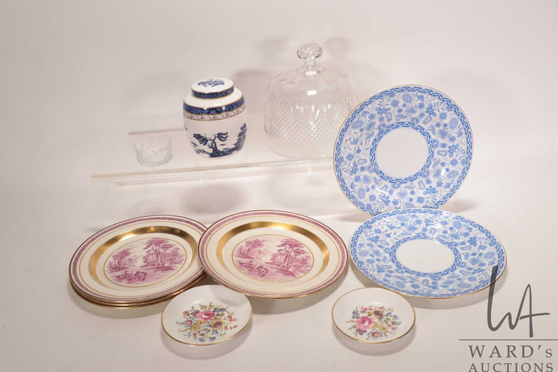 Tray lot of vintage china collectibles including four Wedgwood Etruria 8 1/4" plates, two Royal Crown Derby 8 1/2" blue and white plates, Royal Doulton Booths "Real Old Willow" lidded tea caddy, two Royal Worcester pin trays, lidded crystal dome and a small crystal dish