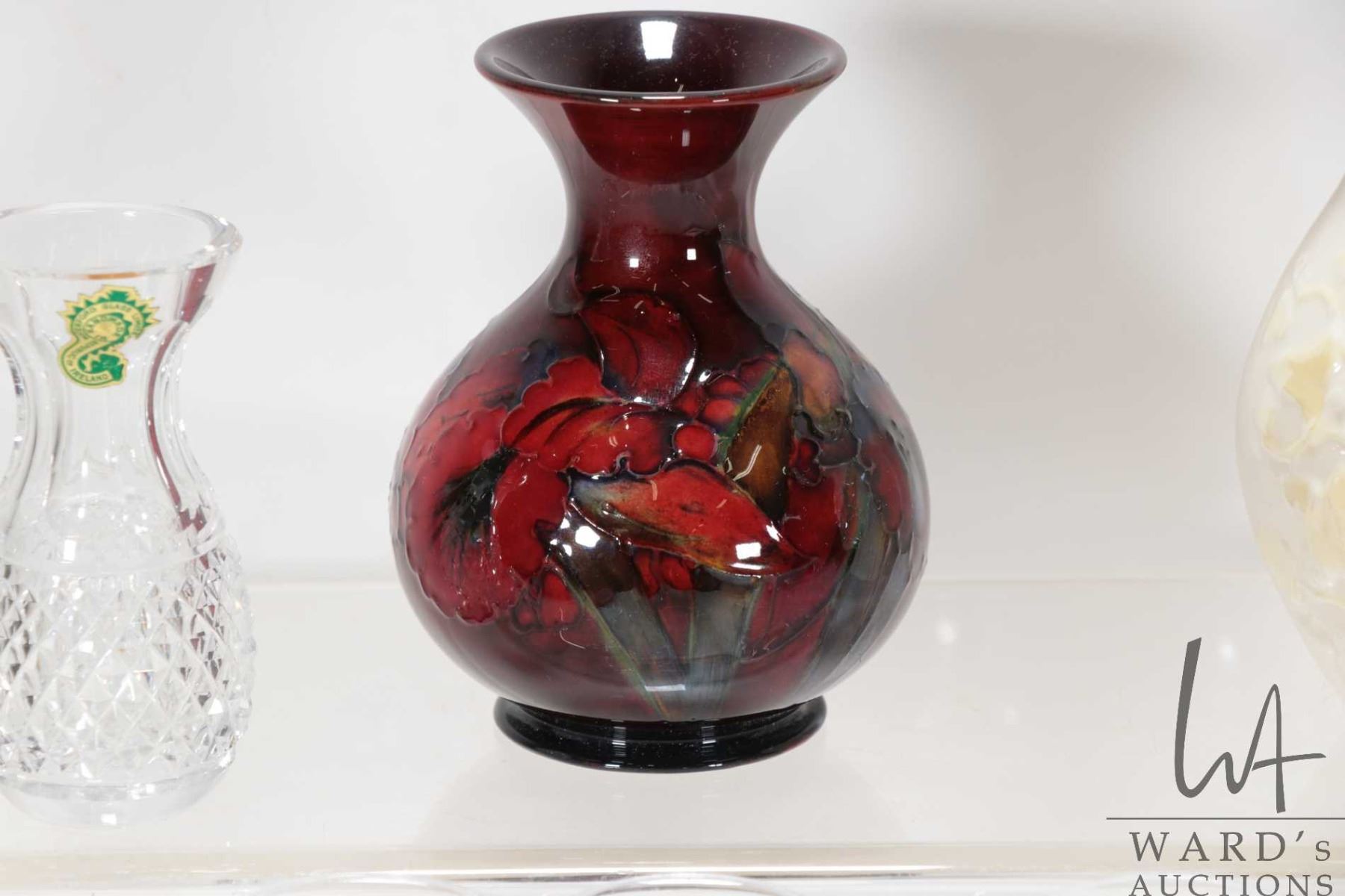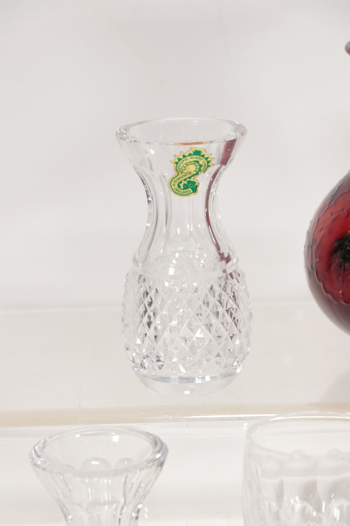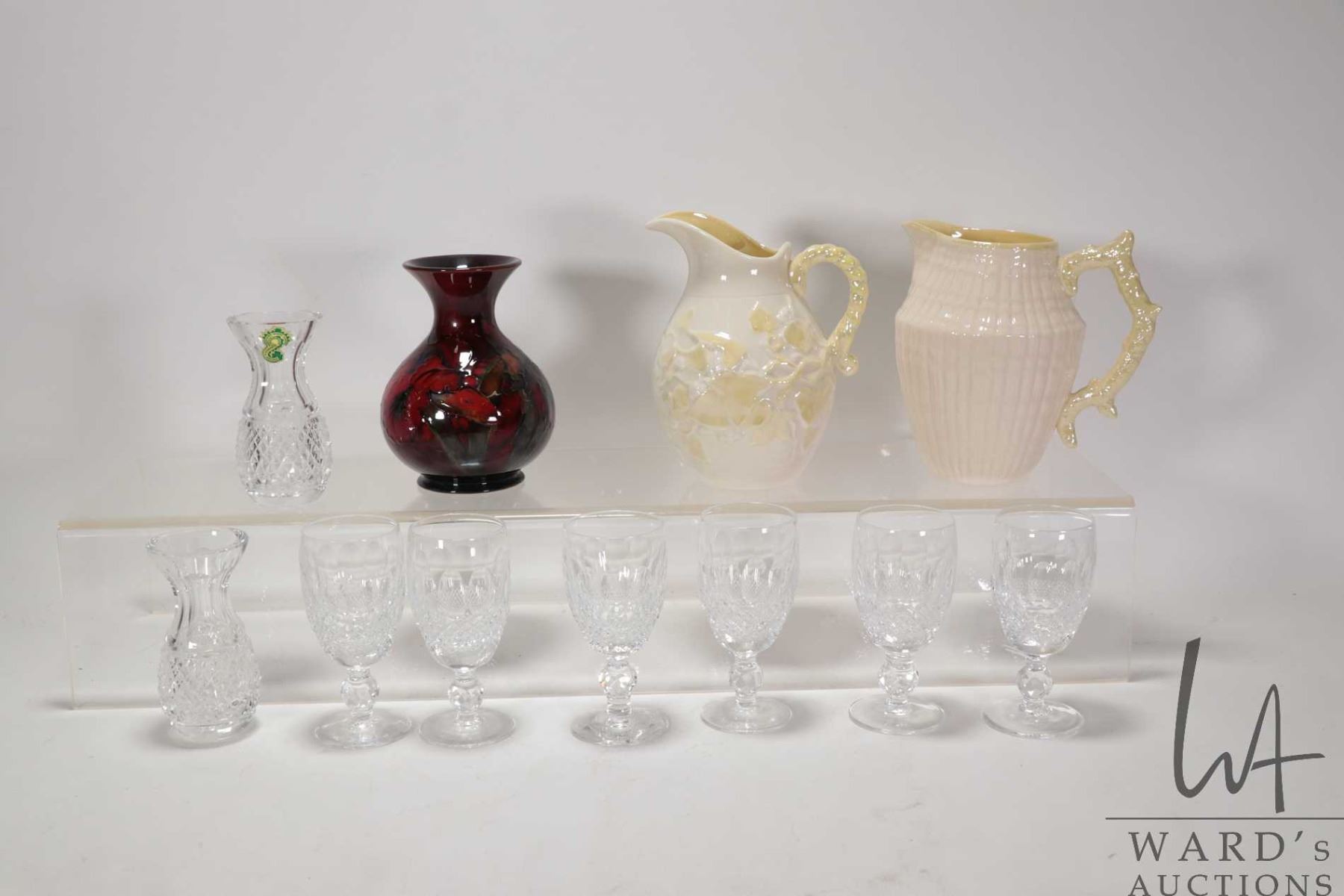 Tray lot of vintage collectible including two Belleek pitchers, six matching Waterford crystal sherry glass plus a pair of Waterford small bud vases and a Moorecroft Flambe orchid vase 5" in height