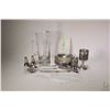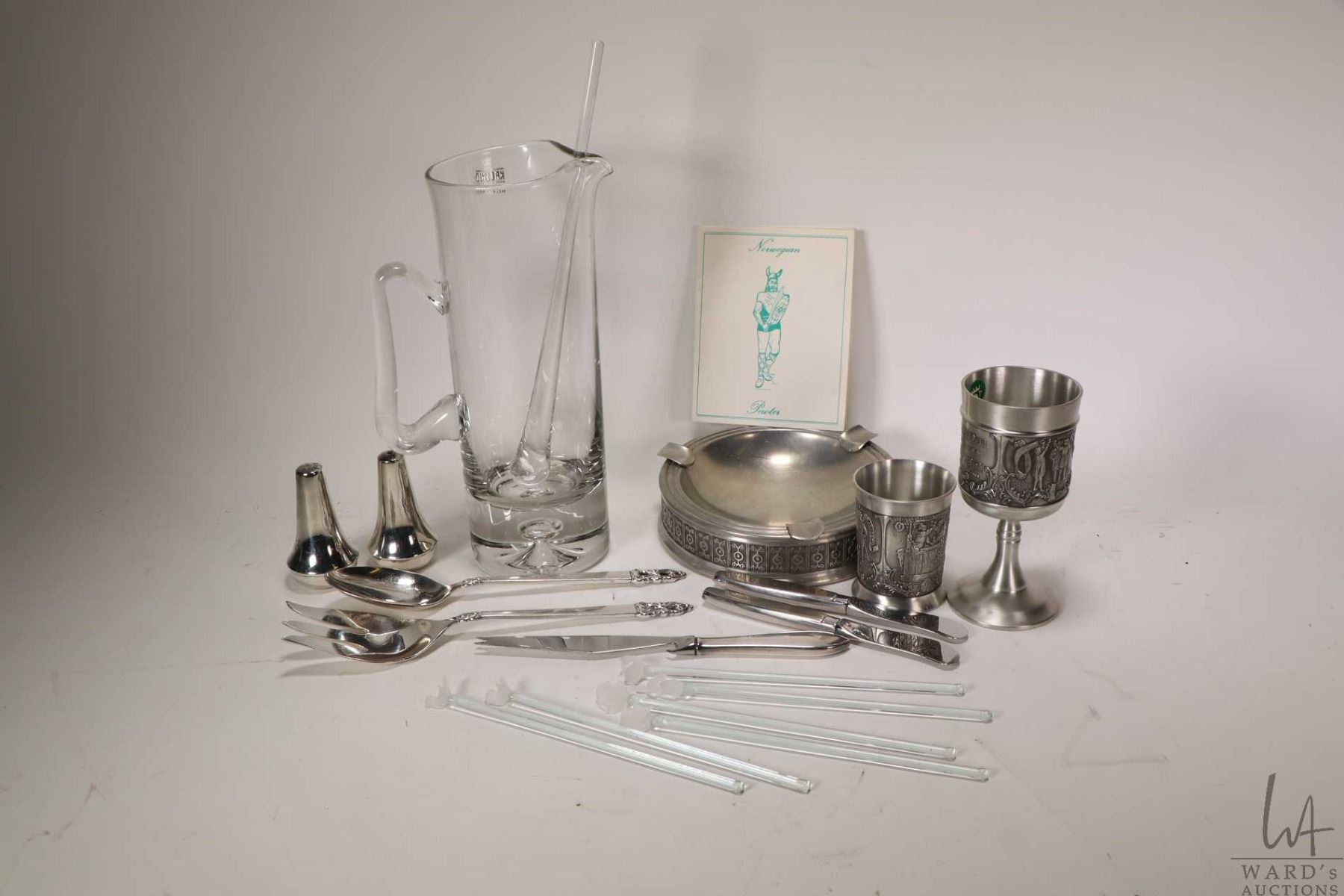 Tray lot of vintage collectibles including Norwegian pewter ashtray and two goblets, set of silver-plate shakers, cheese knife, serving spoon and fork plus Krosno pitcher with stir stick and six glass stirrers
