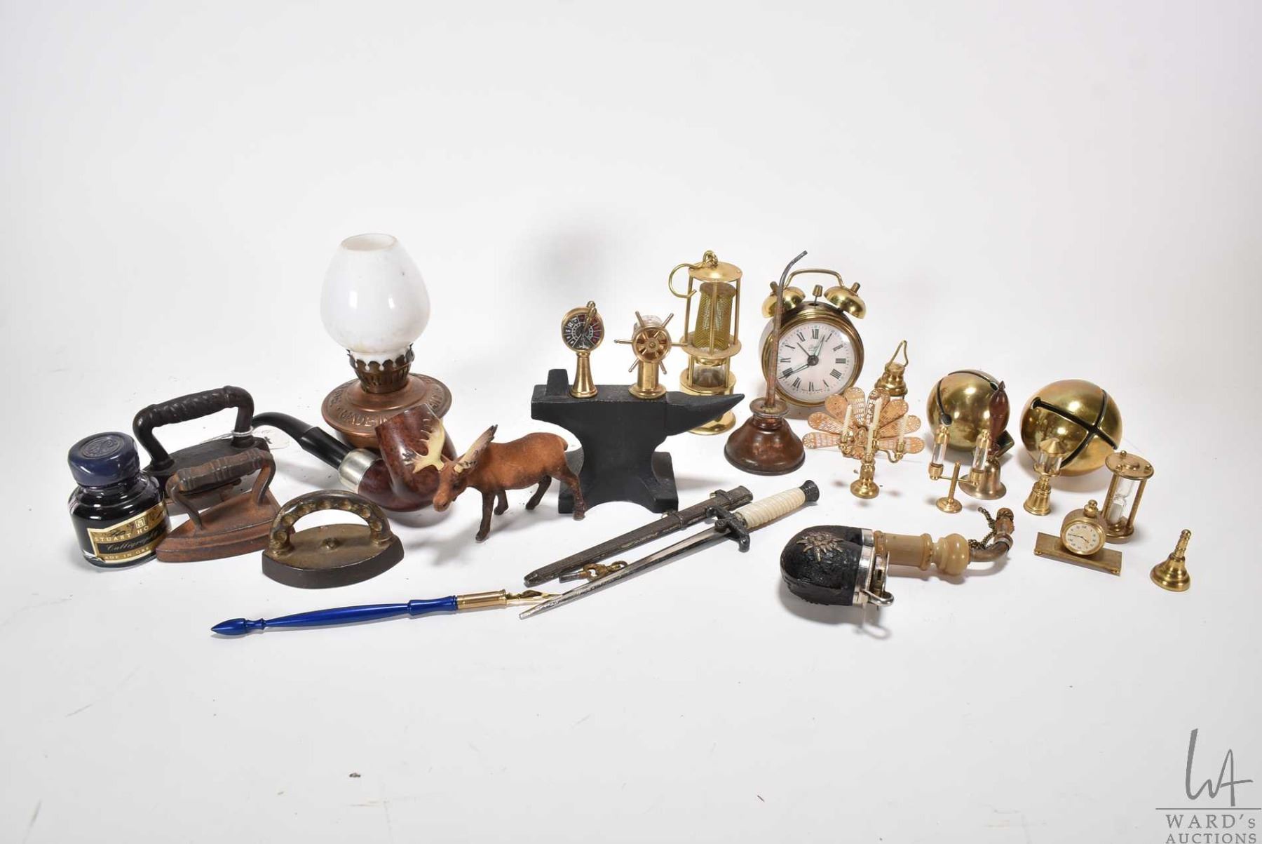 Tray lot of vintage collectibles including brass miniatures, small lamps, oiler, ink, anvil, pipes, irons, pen etc.