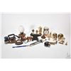 Tray lot of vintage collectibles including brass miniatures, small lamps, oiler, ink, anvil, pipes,