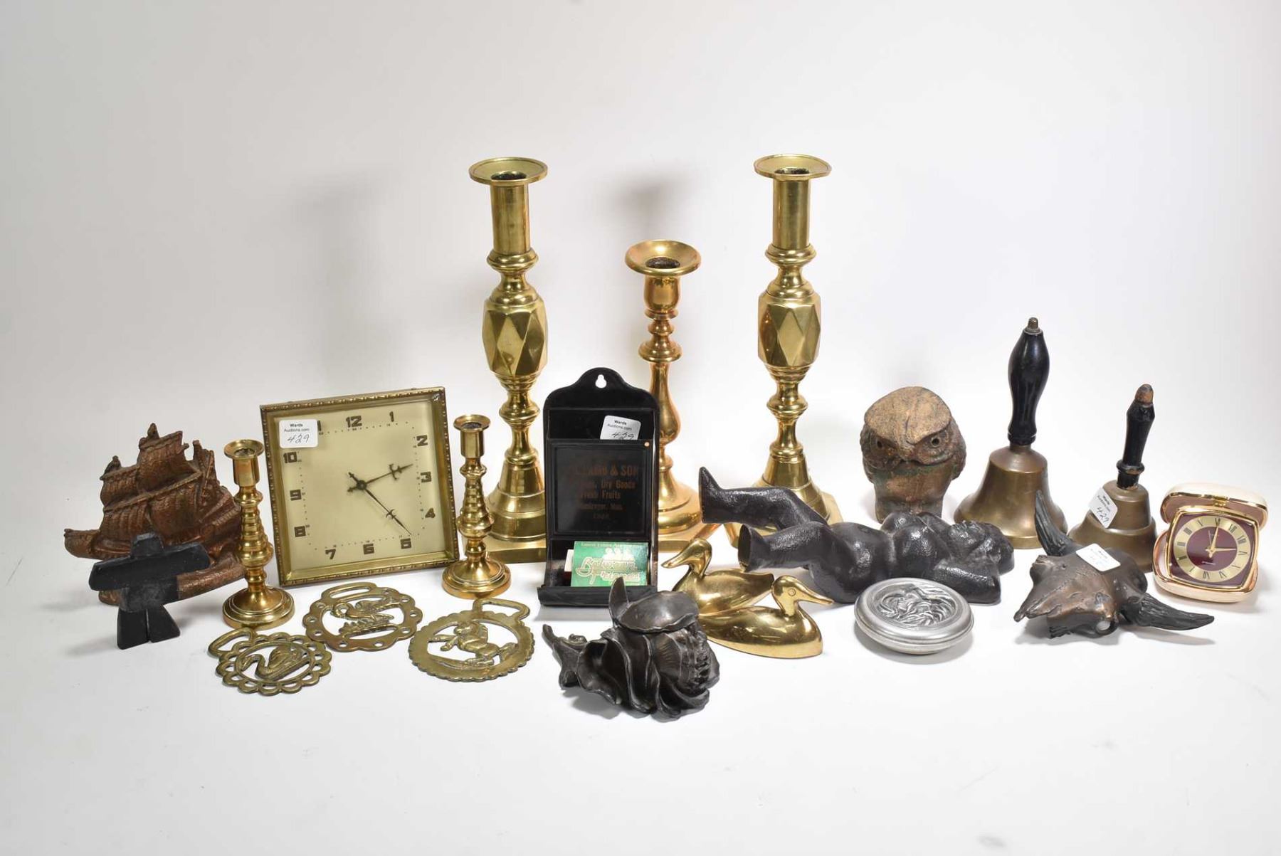 Tray lot of vintage collectibles including naked lady boot remover, wall mount match holder, inkwell, candlesticks etc.