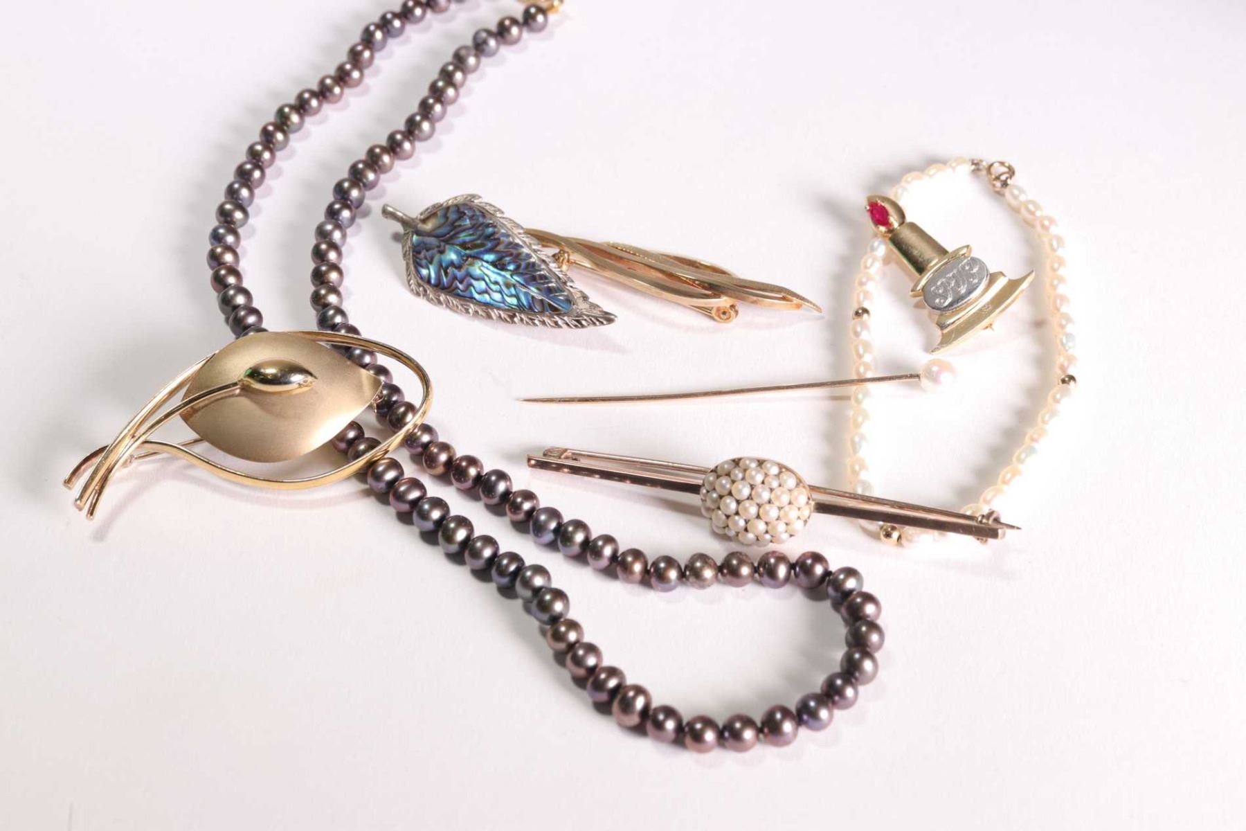 Tray lot of vintage jewellery including 8kt gold brooch, vermeil brooch, sterling silver, 18" strand of grey pearls with 14kt yellow gold clasp, brooch with ruby gemstone etc.