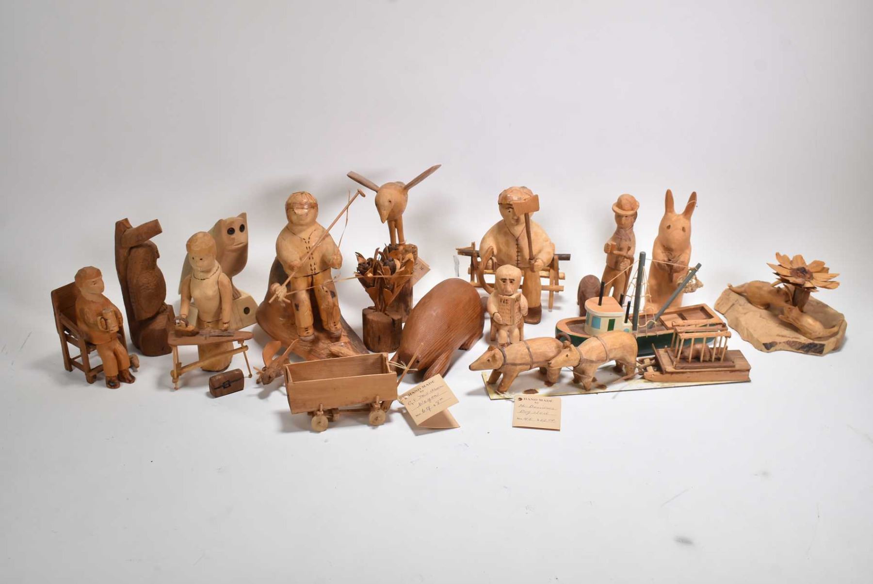 Tray lot of vintage treenware including carved birds, people, animals, Moosescrafts, Ford Davidson e