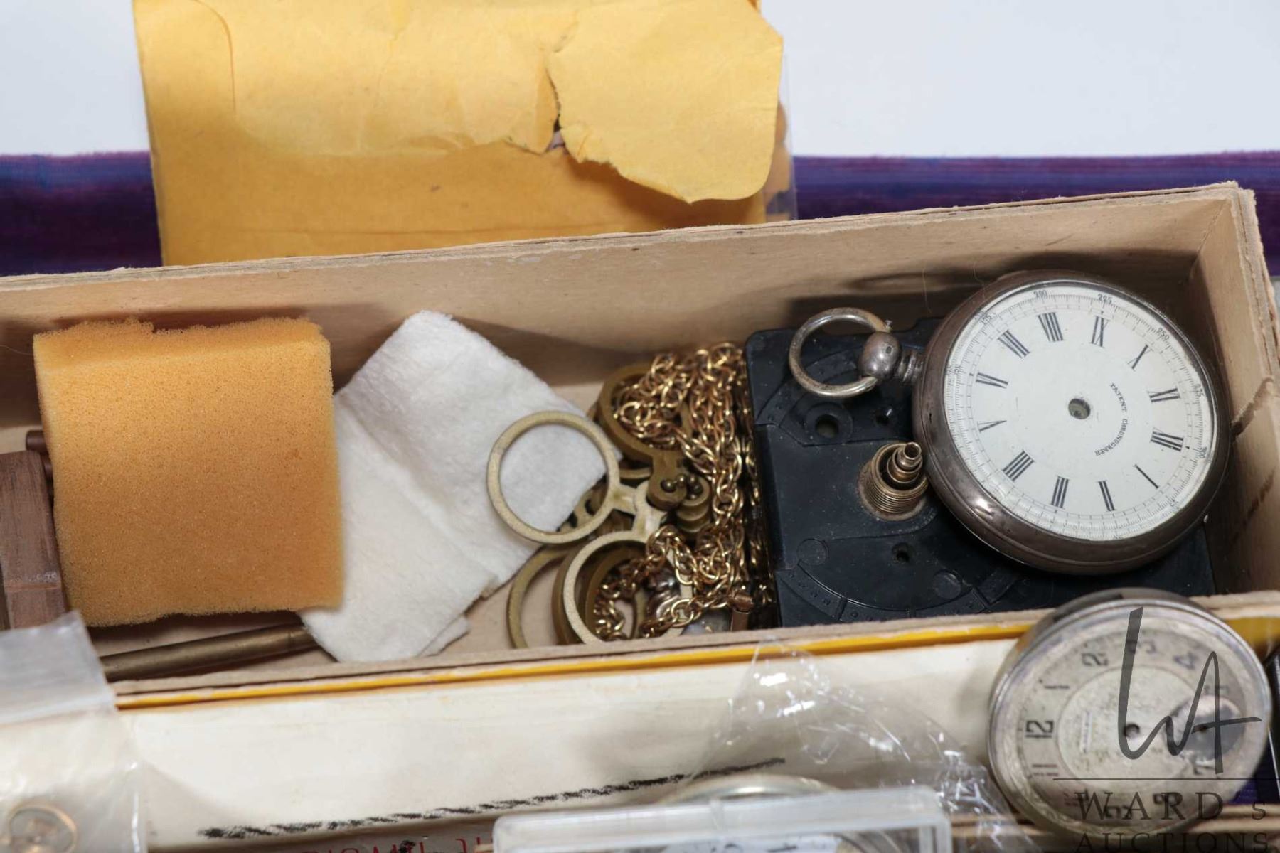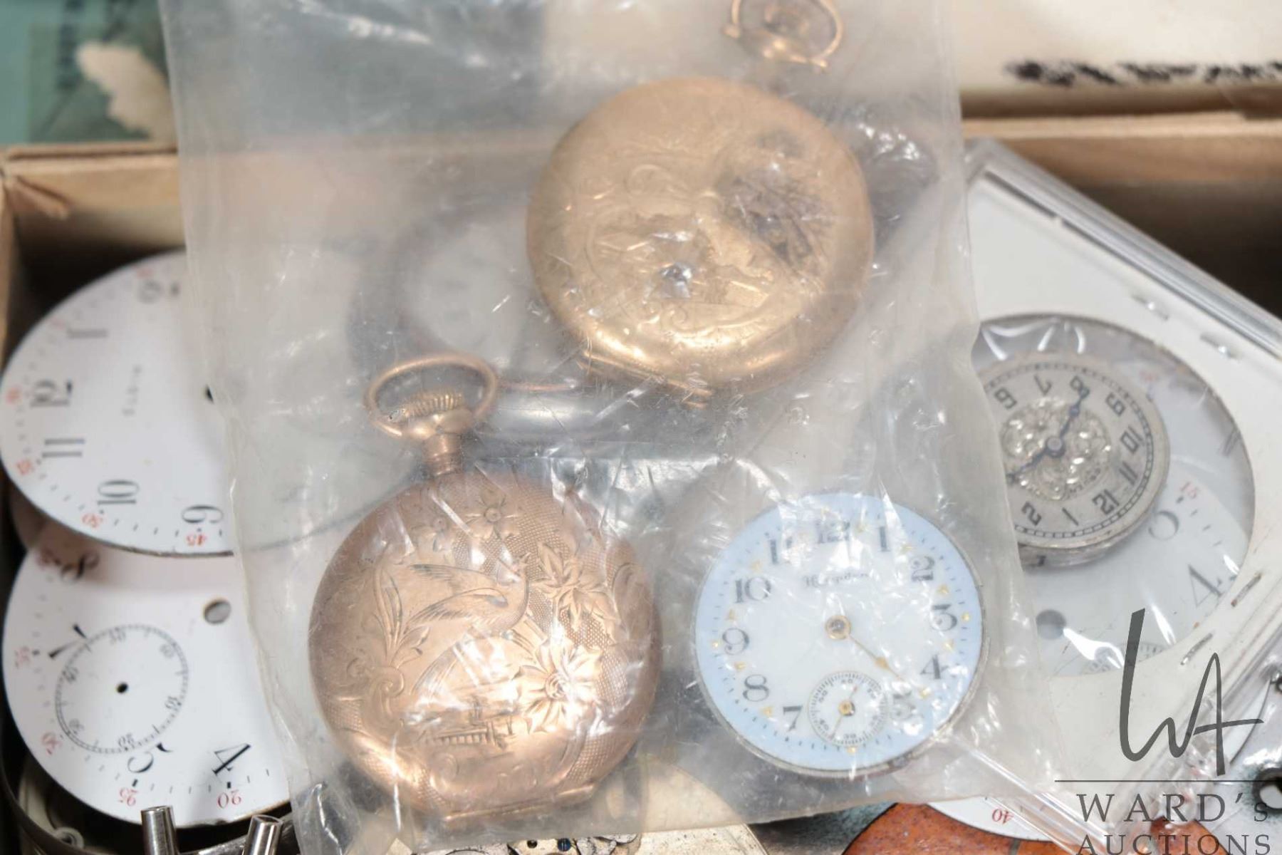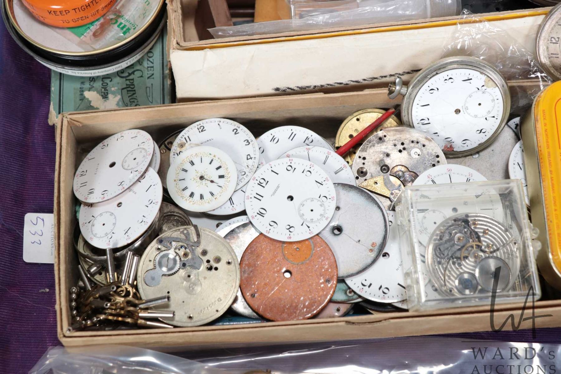 Tray lot of watch parts including, half completed and/or non working watches, cases, movements, pocket watch keys, pocket watch faces, etc.