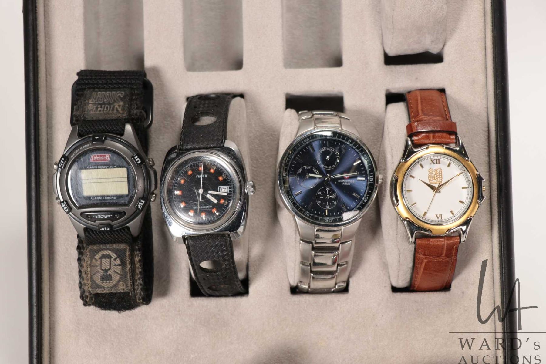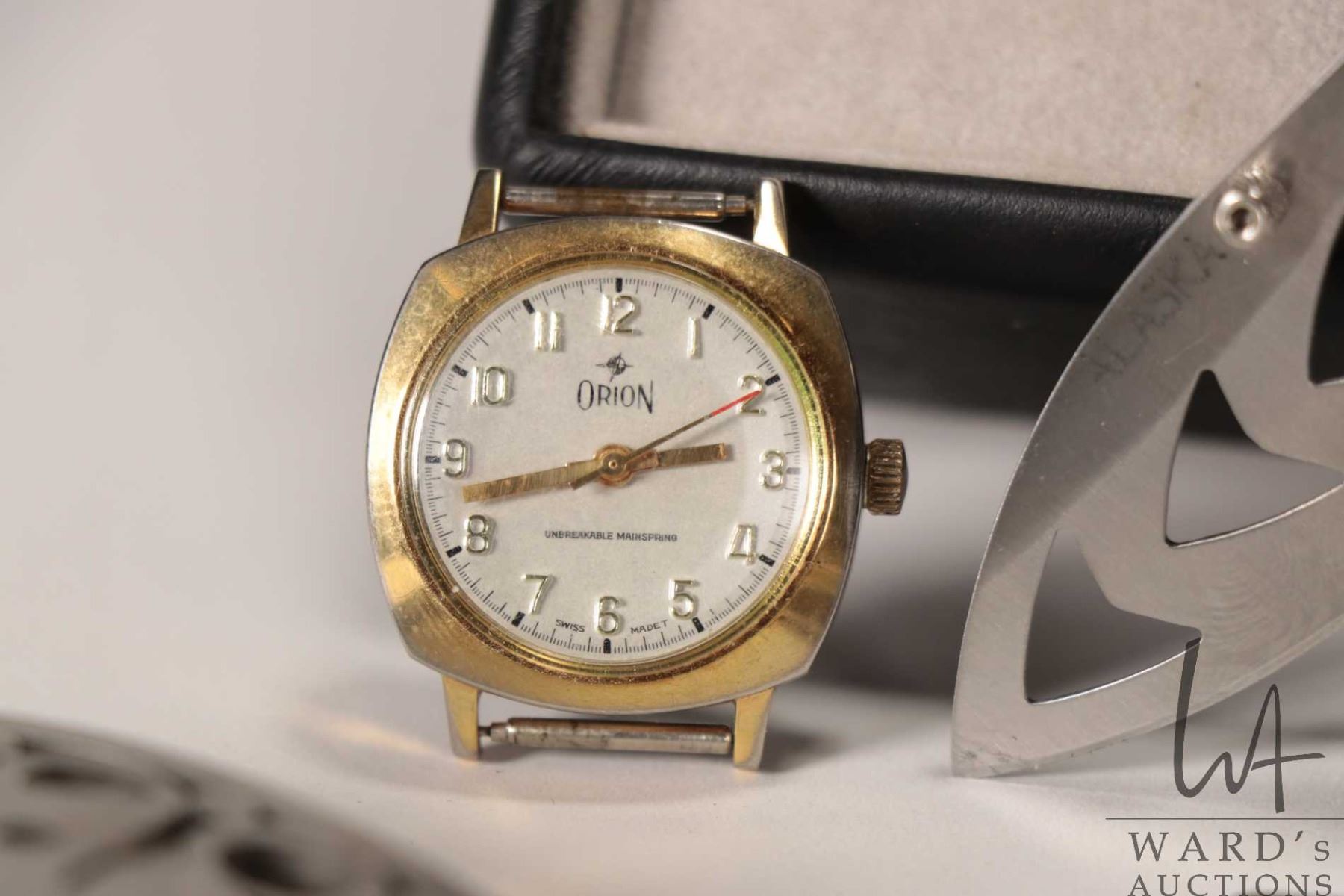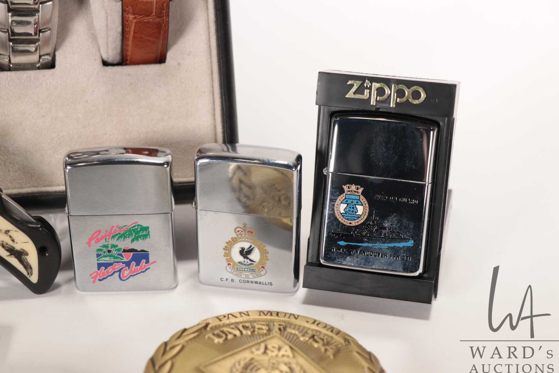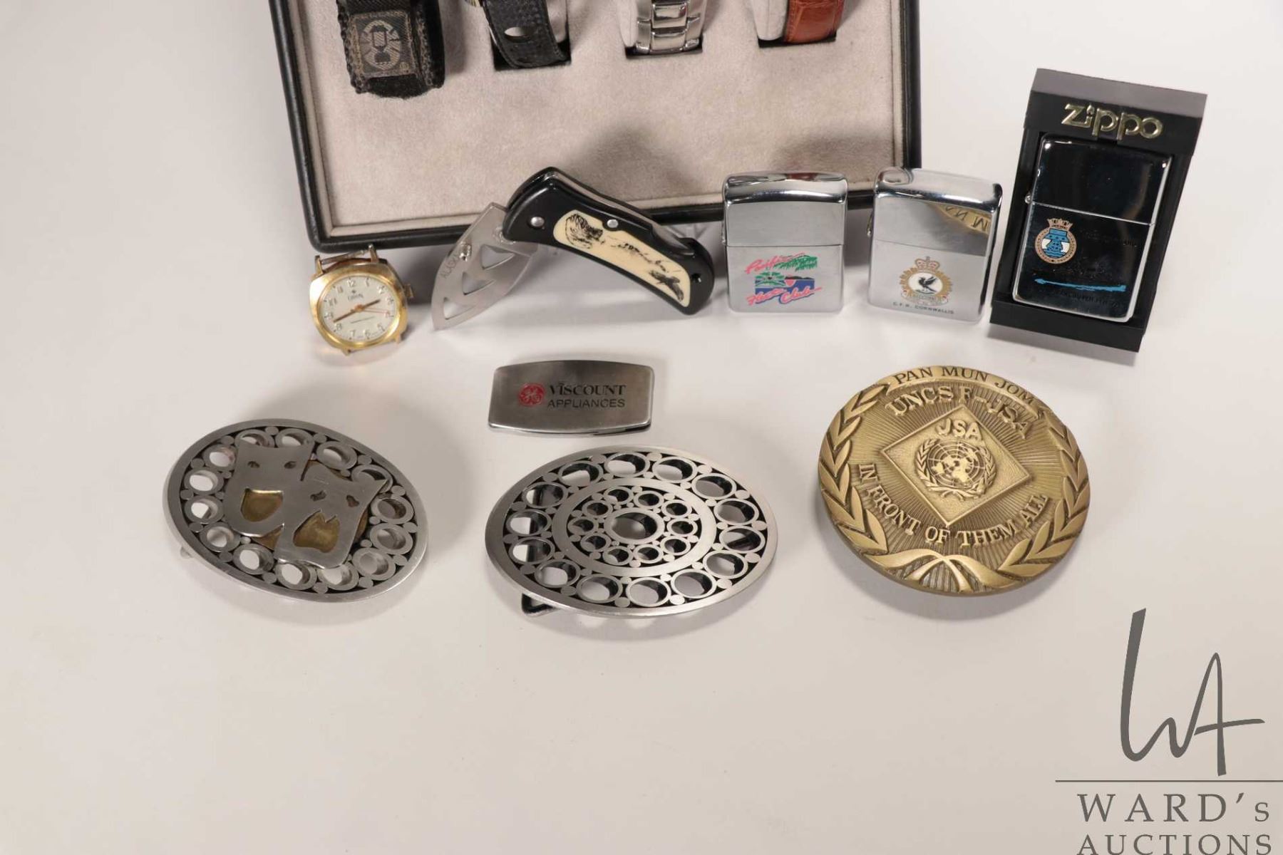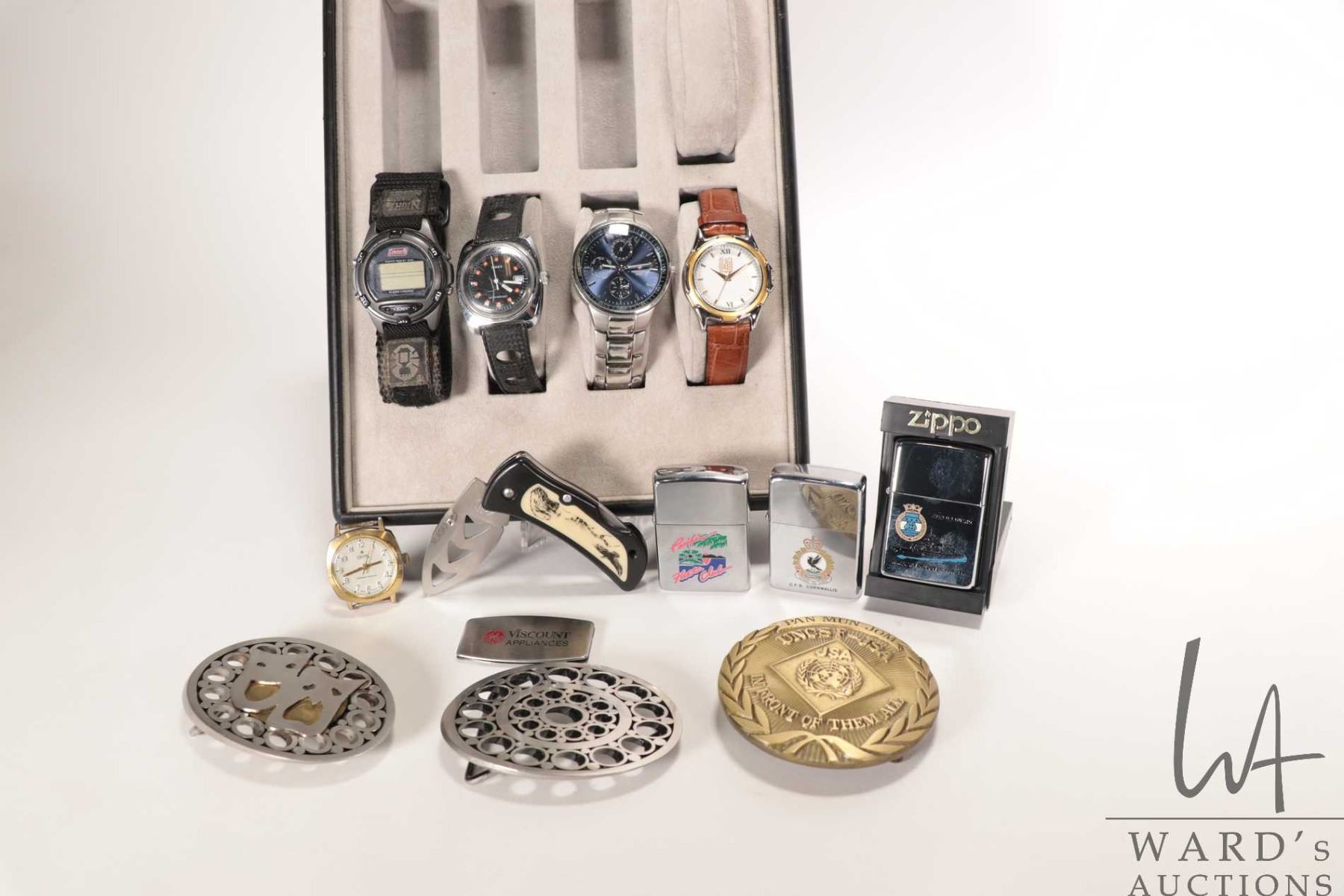 Tray of gent's jewellery and collectibles including New Swiss Army stainless steel watch, Timex mechanical watch, working, Coleman digital watch, a working Orian mechanical watch, missing strap plus a selection of Zippo Lighters, a Zippo knife, three metal belt buckles etc.