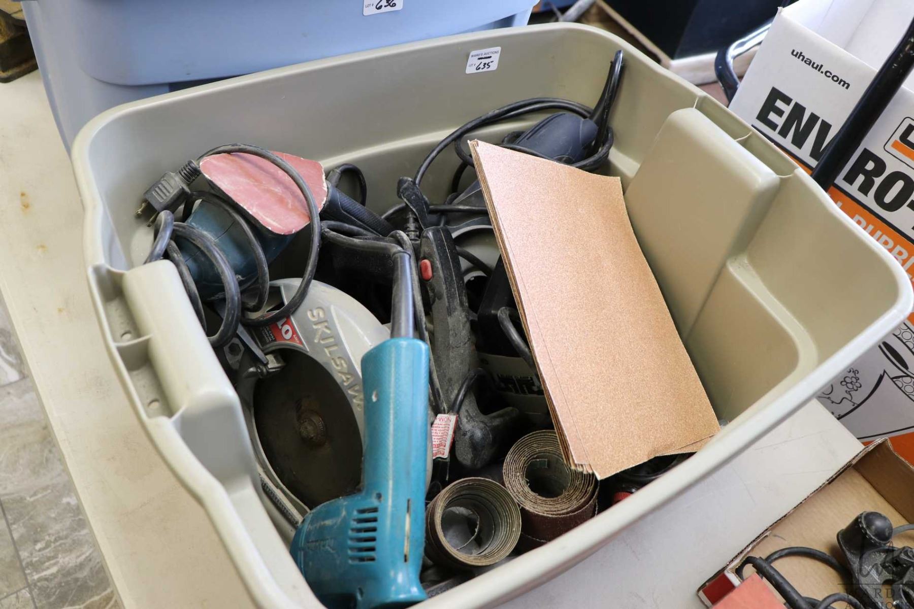 Tub of assorted hand power tools including Skilsaw, Black & Decker mouse sanders, Makita 3/8" drill,