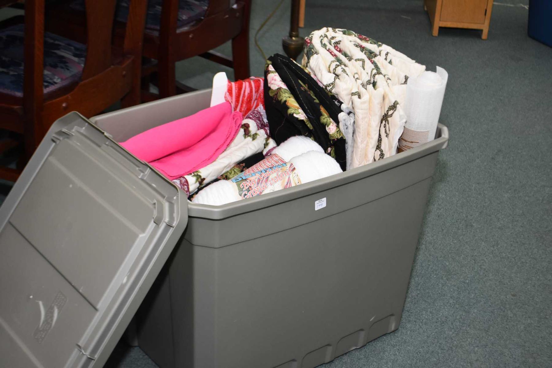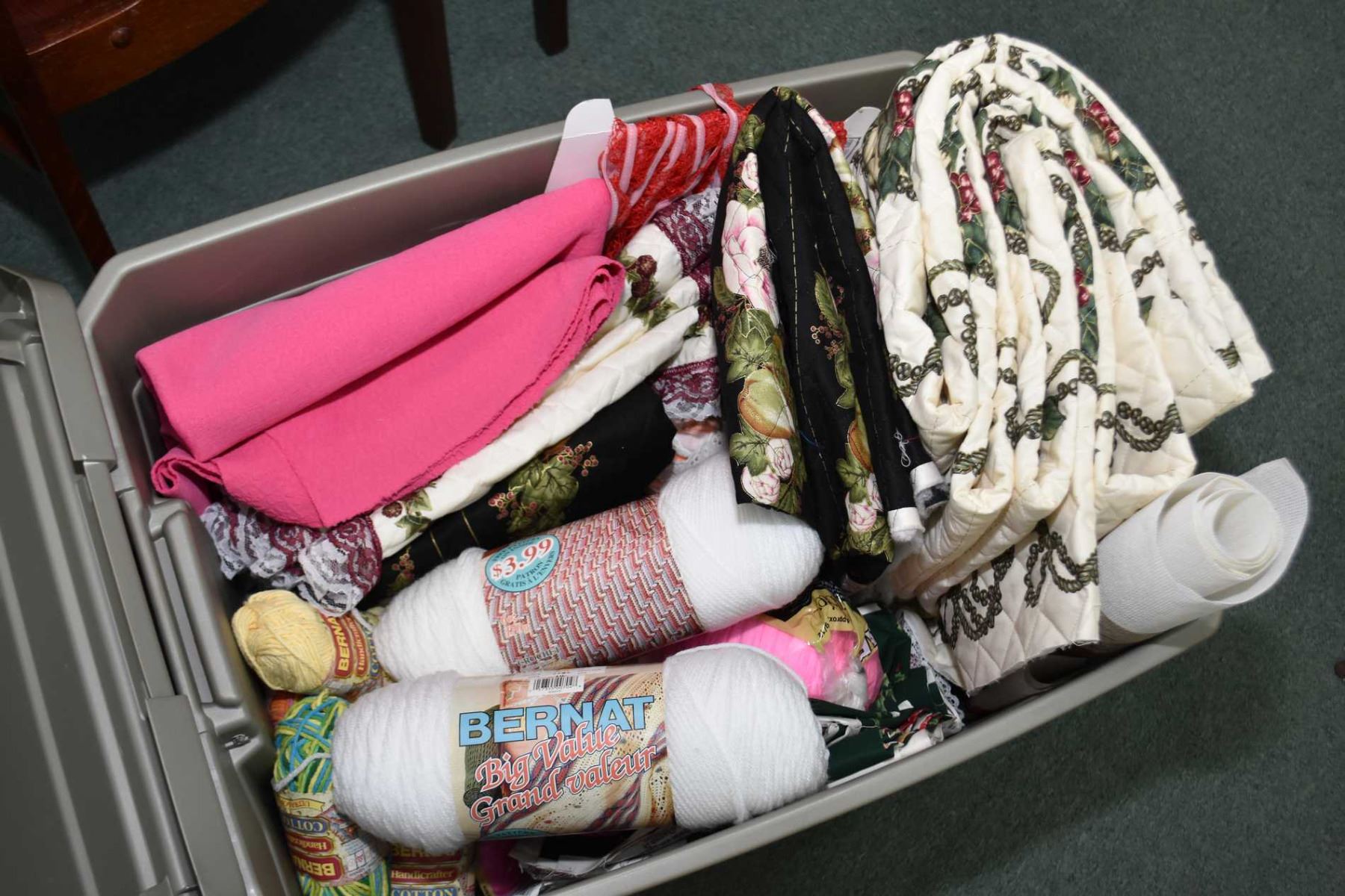 Tub of knitting wool and crafting supplies including fabric and placemats to make up with edging