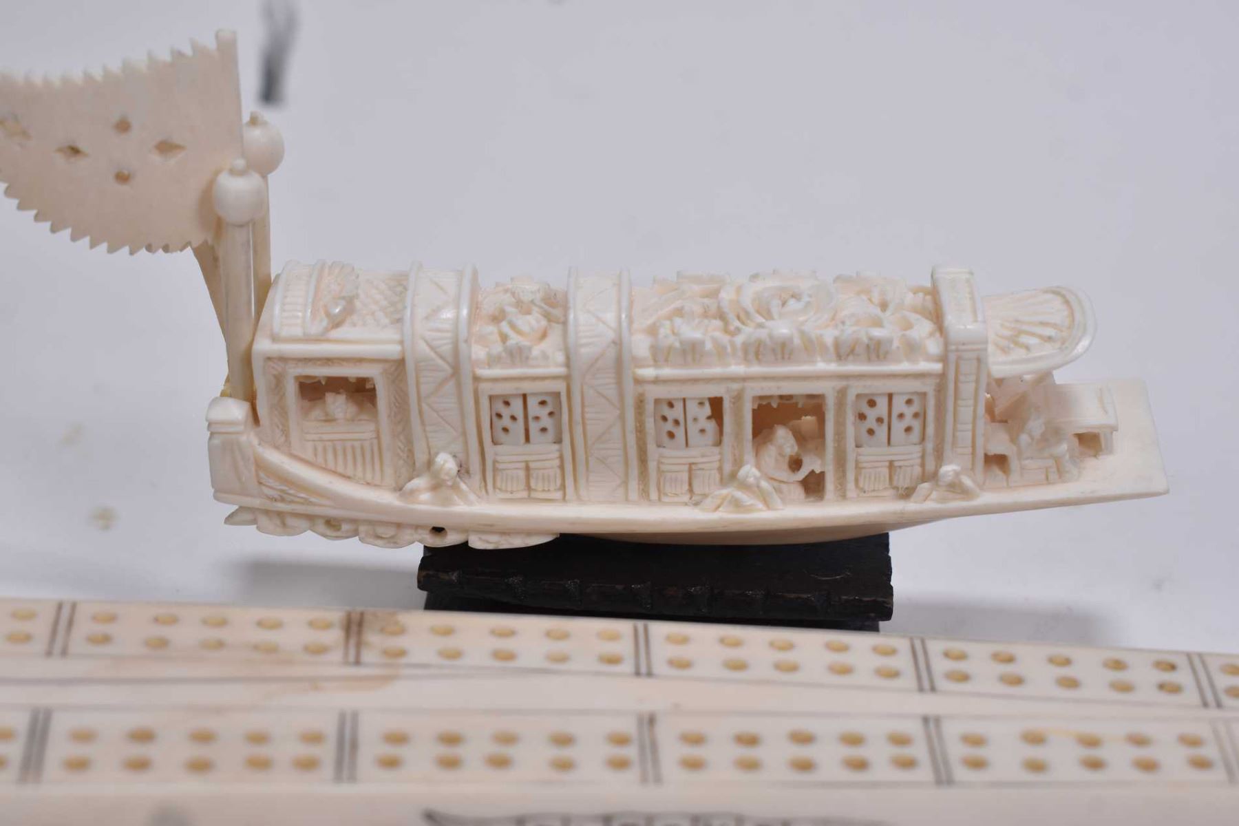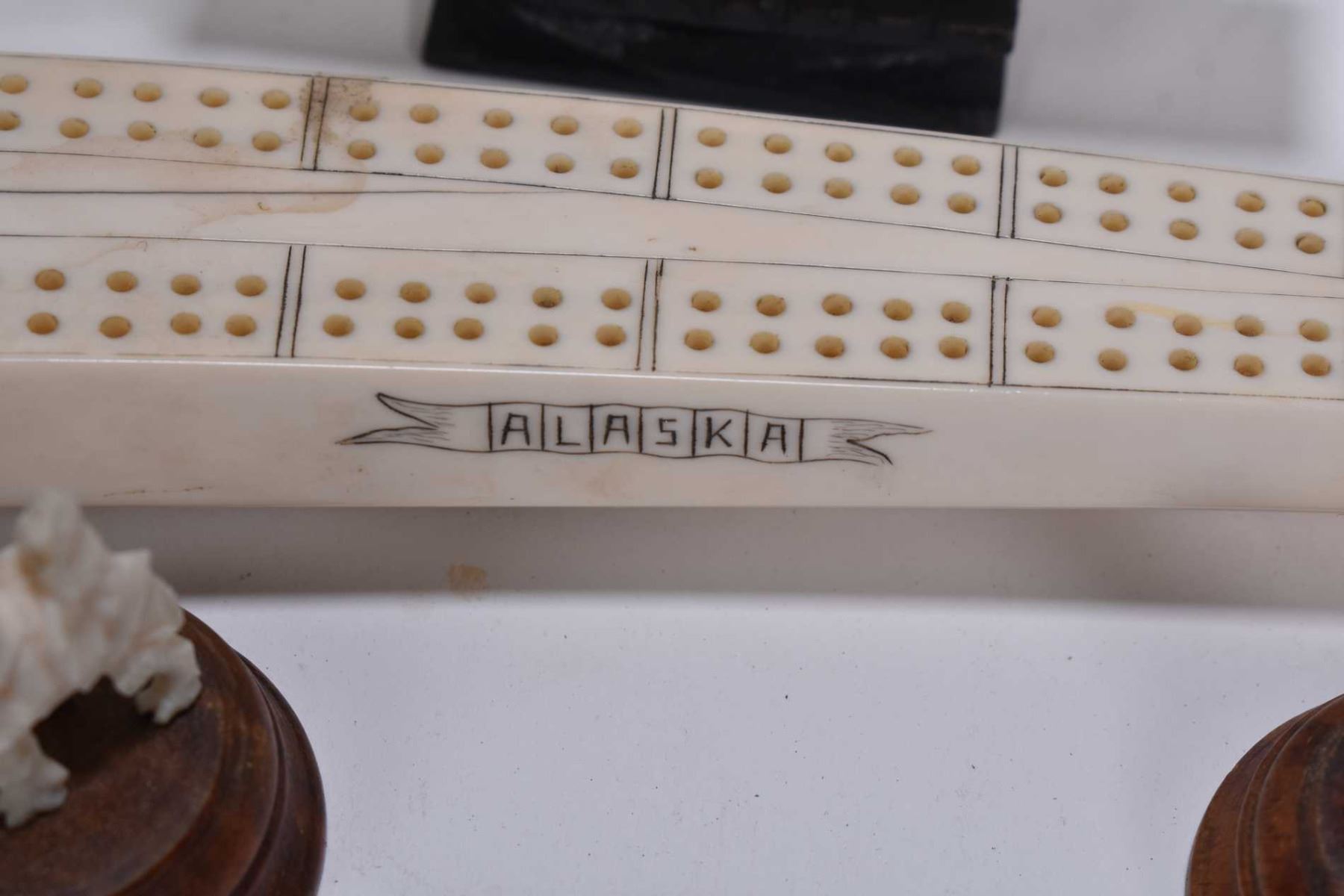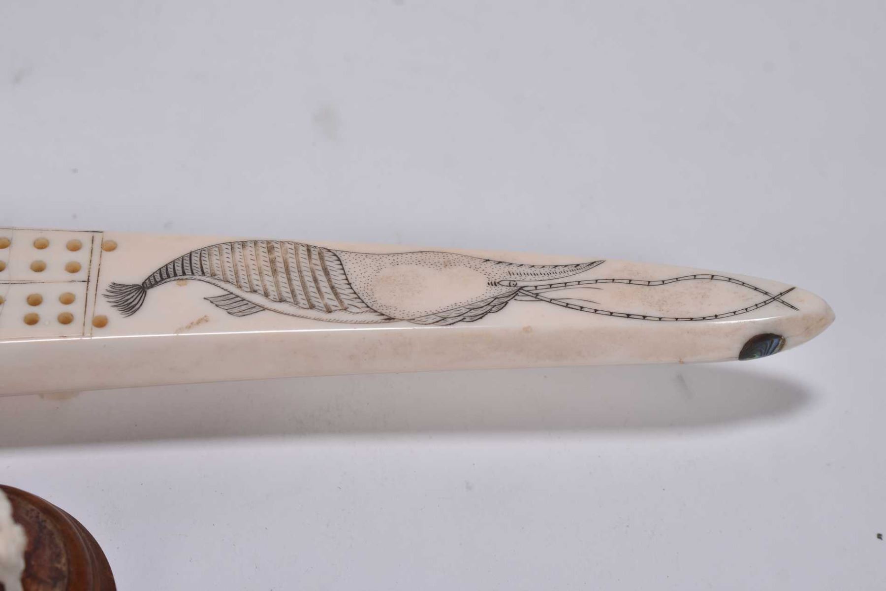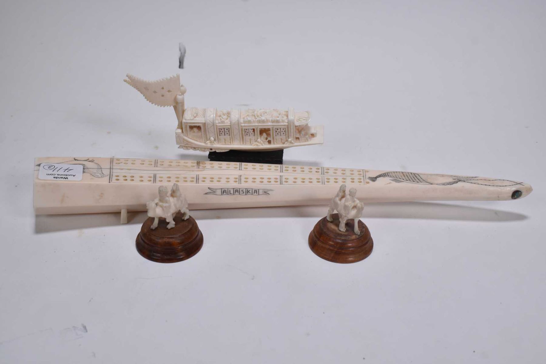 Tusk cribbage board with scrimshaw decoration plus three small ivory ornaments