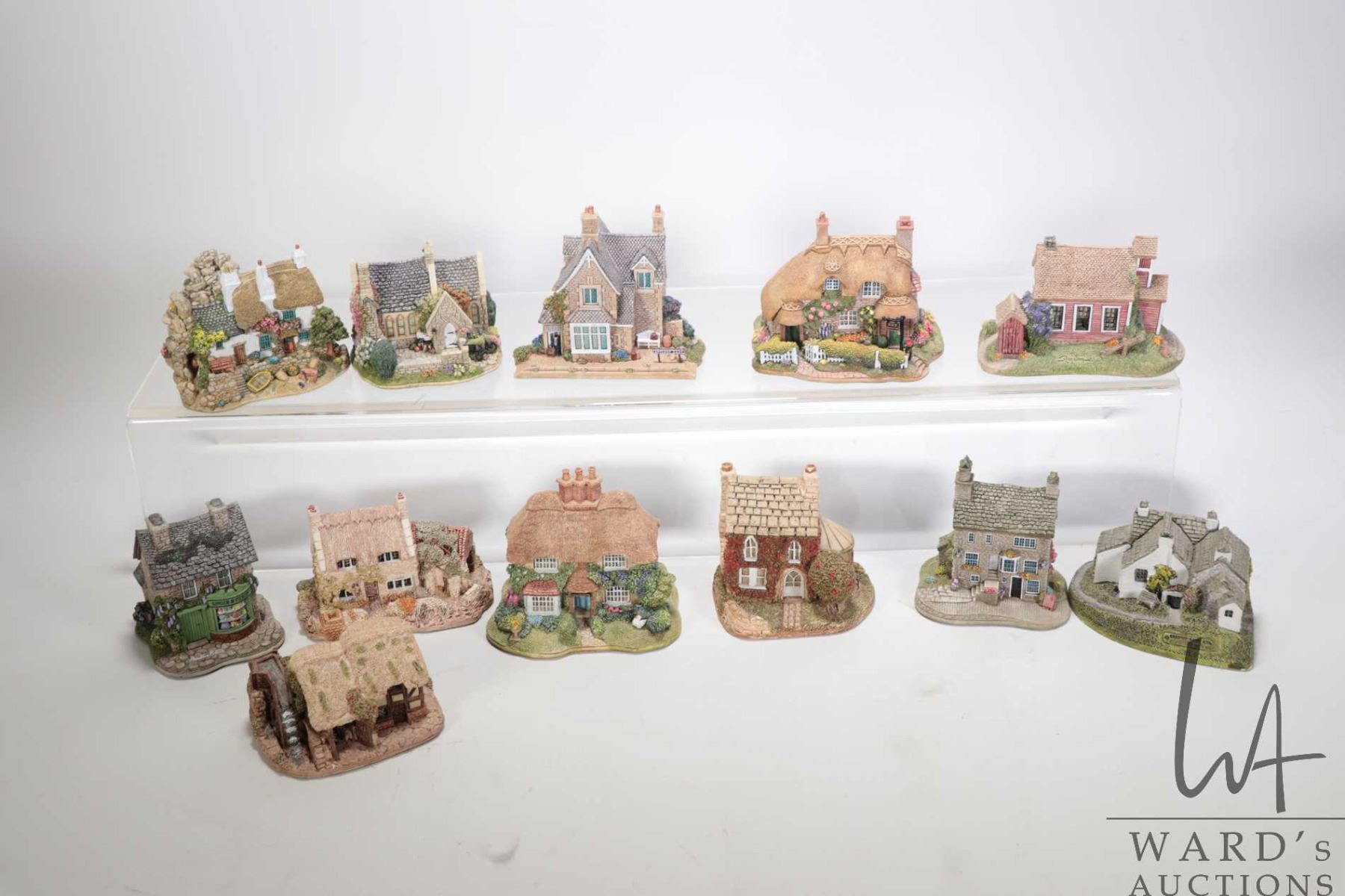 Twelve Lilliput Lane cottages including Country School, Harriet's Cottage, Walker's Rest, Smuggler's Rest, Kendal Chocolate House, etc.