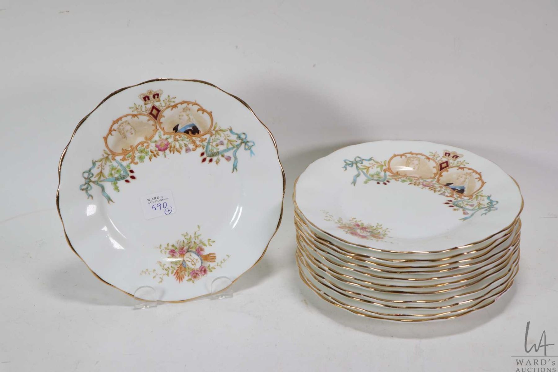Twelve antique Queen Victorian diamond jubilee 1837-1897, 7" plates with depictions of young Victorian and old Victoria in transfer ware with hand enamelled detailing