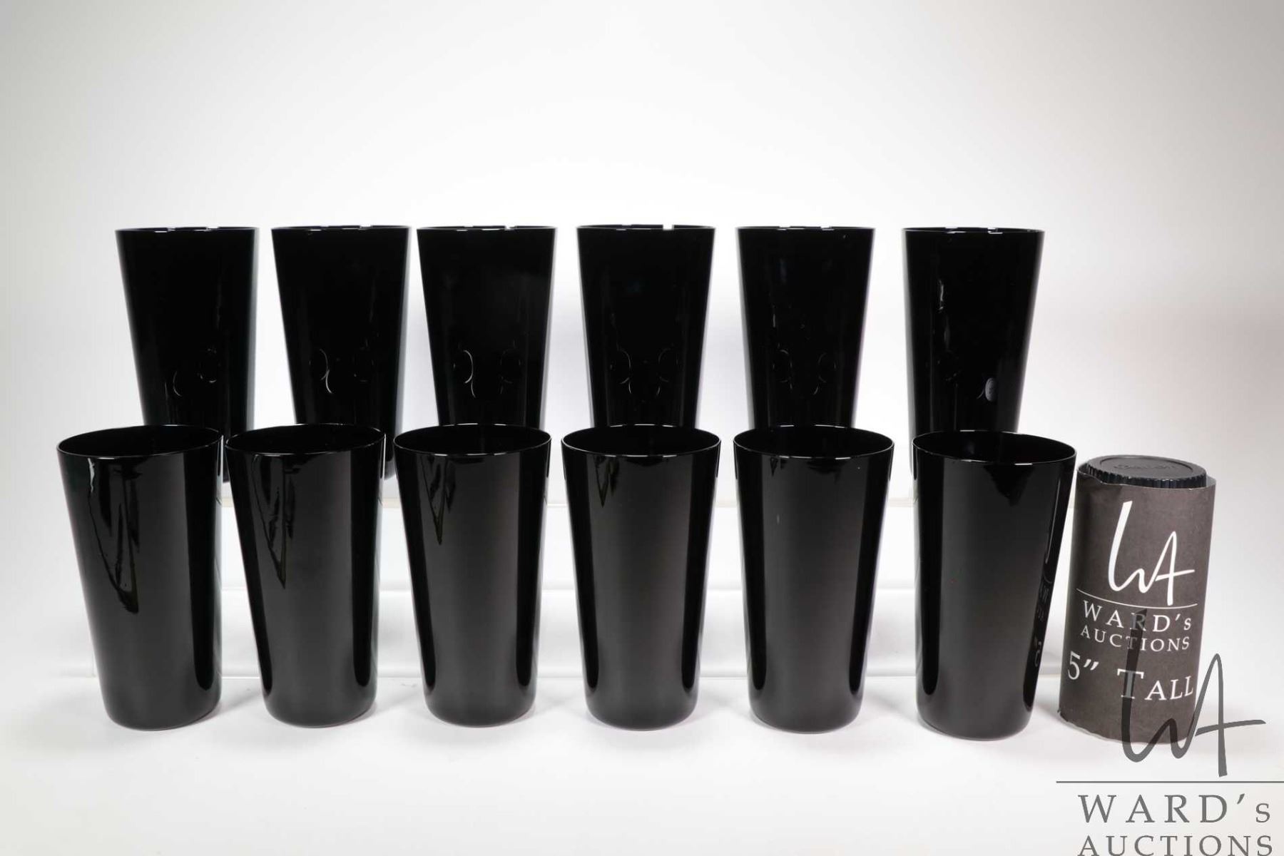 Twelve black 6" high Nason Moretti tumblers. Shipping Note: This item may be very delicate, heavy or large. Ward's Auctions will endeavor to package this adequately for shipping but it may incur large shipping or packaging costs. Anticipate this being an expensive shipment. Local pickup is recommended