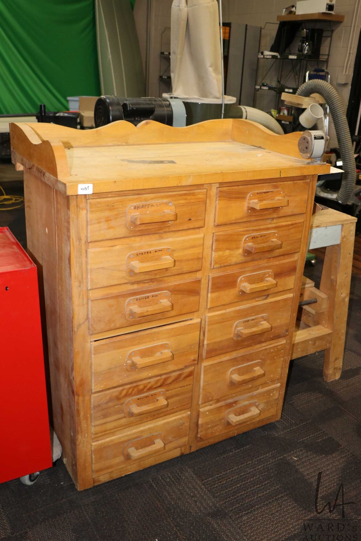 Twelve drawer, hand crafted tool/ parts cabinet 47" H X 36" W X 22" D