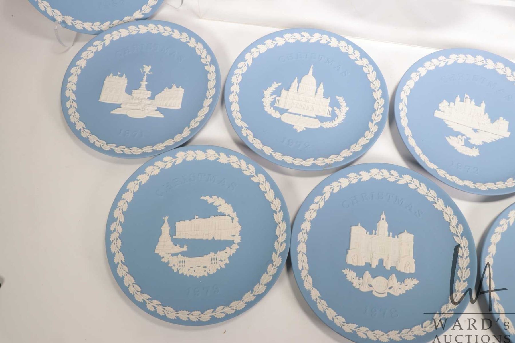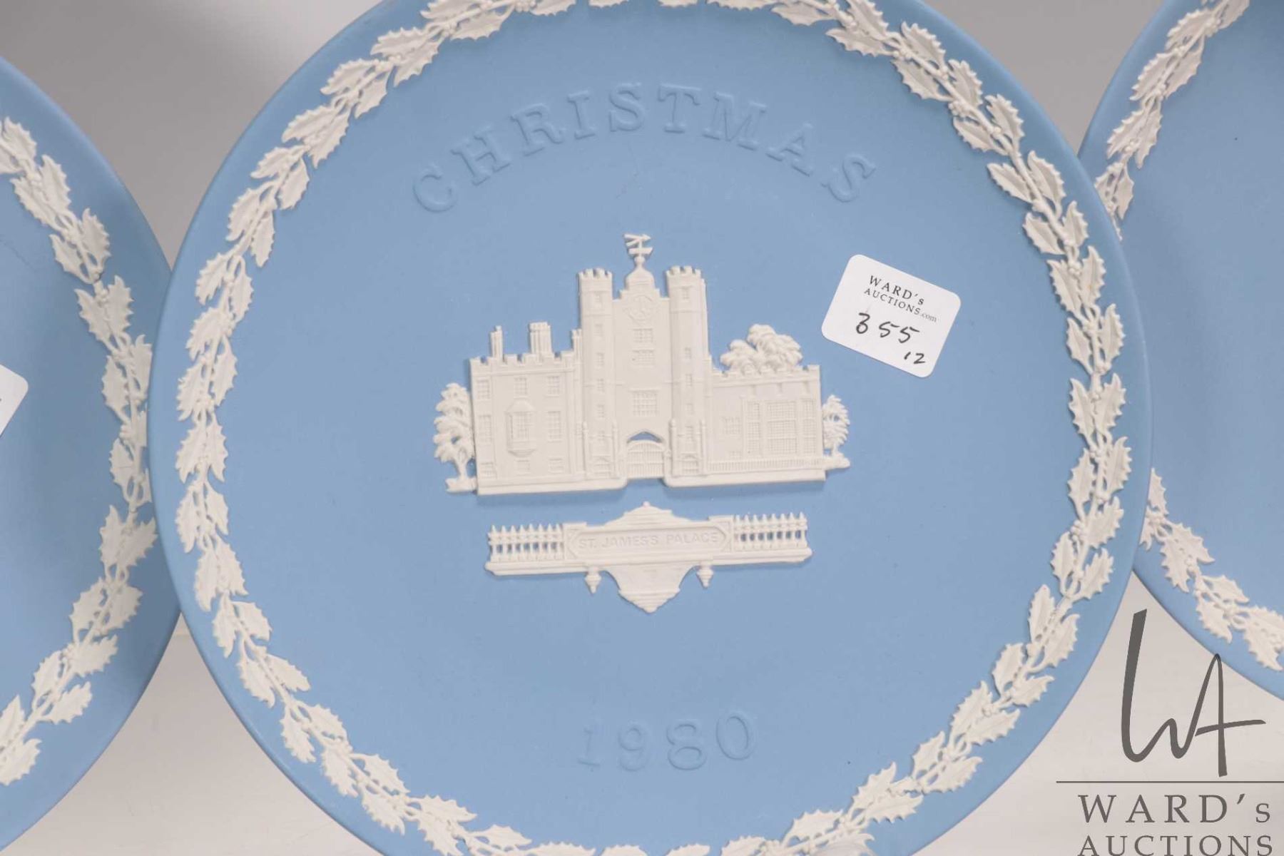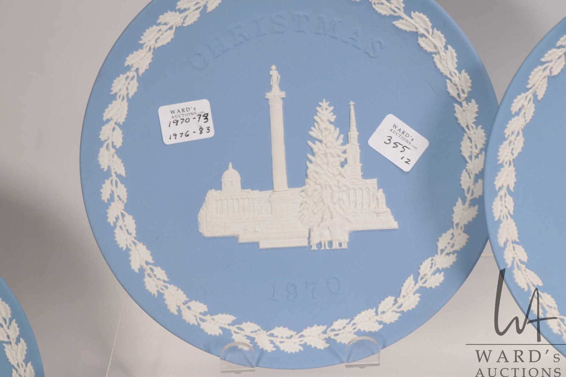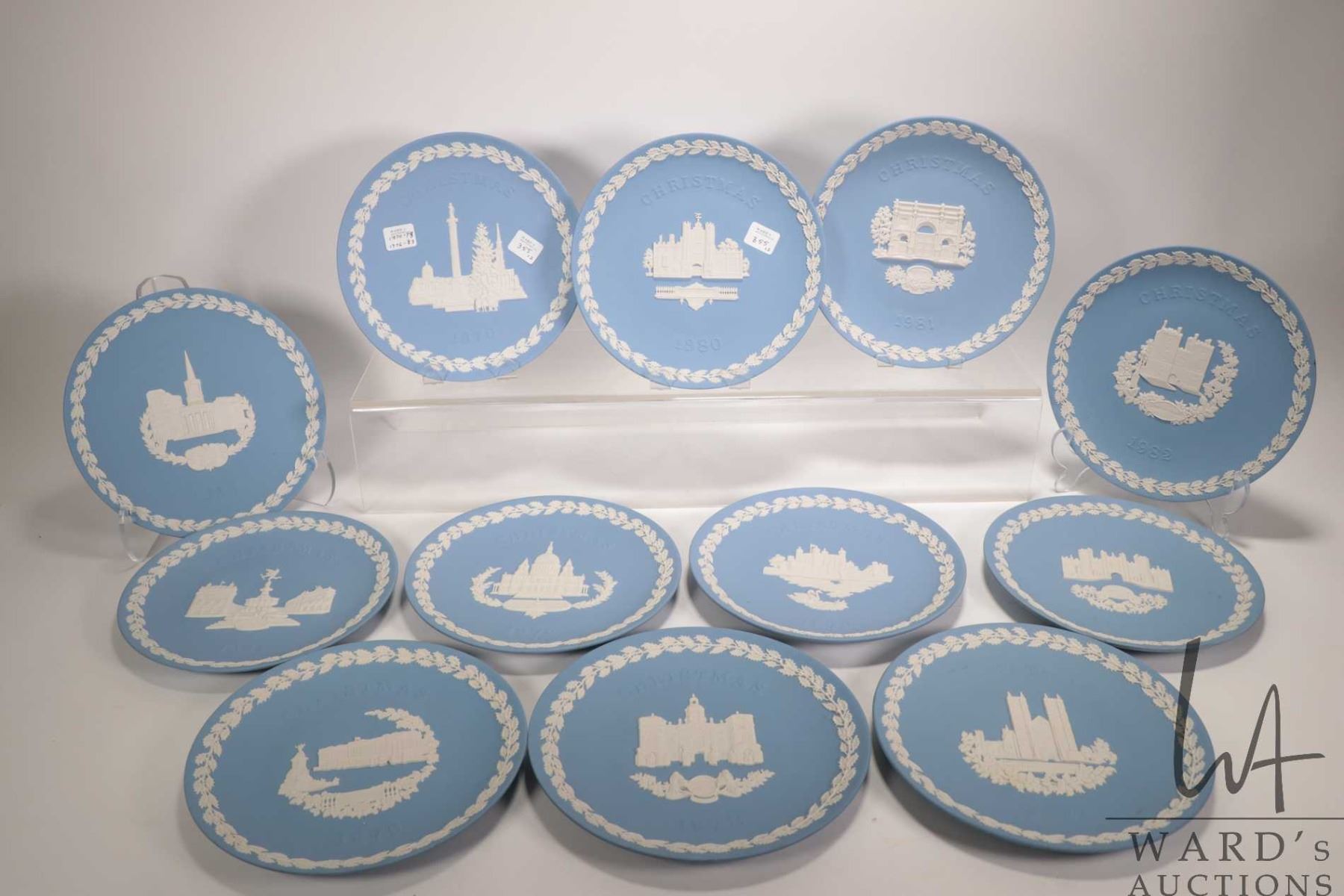 Twelve vintage Wedgwood Jasperware Christmas plates, featuring scenes of English architectures including 1970, 1971, 1972, 1973, 1976, 1977, 1978, 1979, 1980, 1981, 1982 and 1983