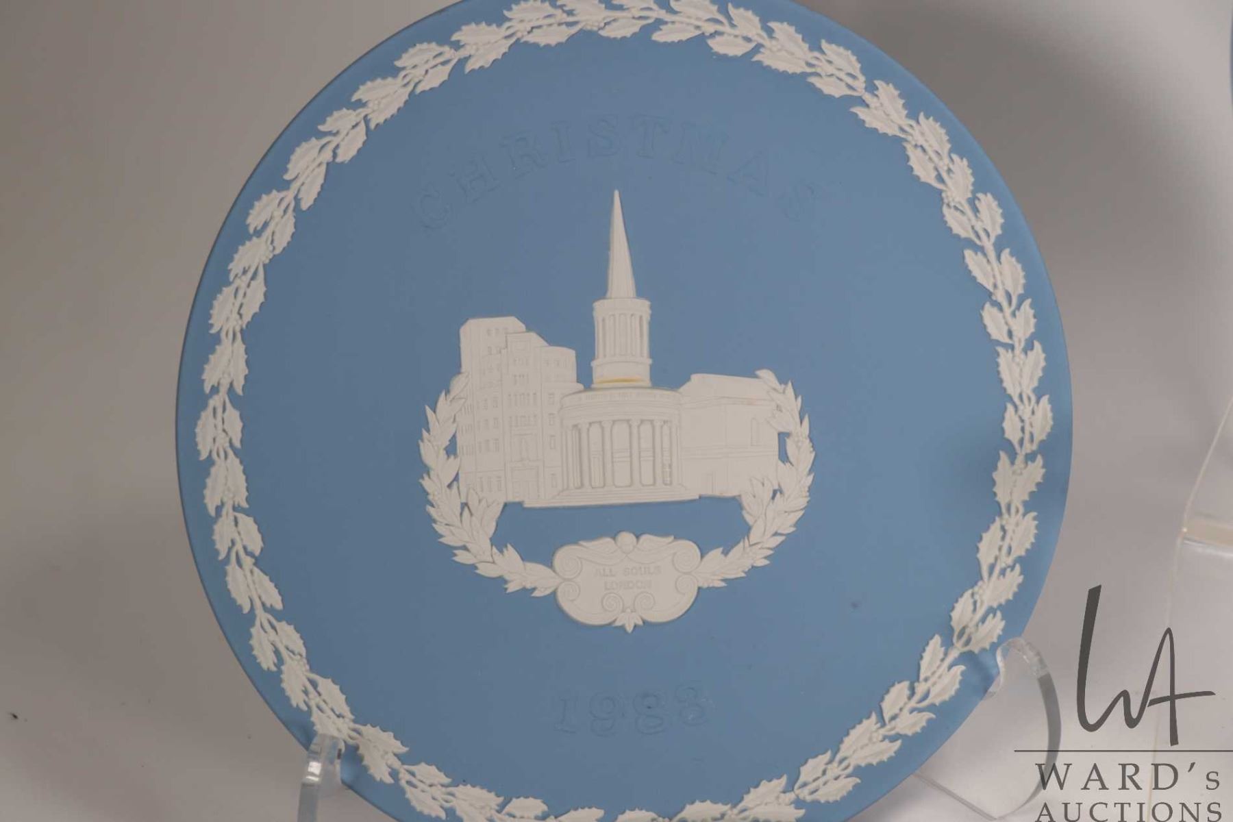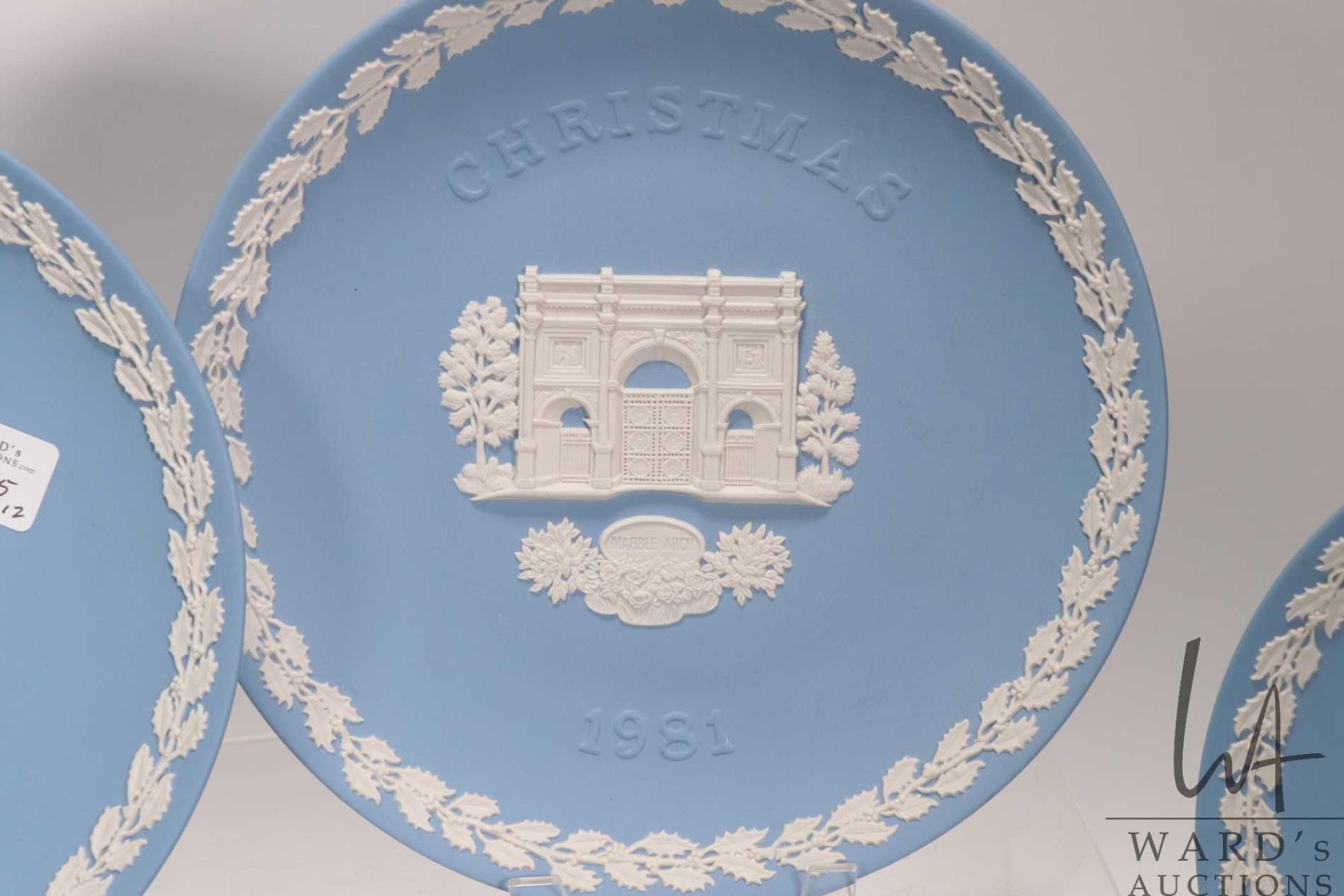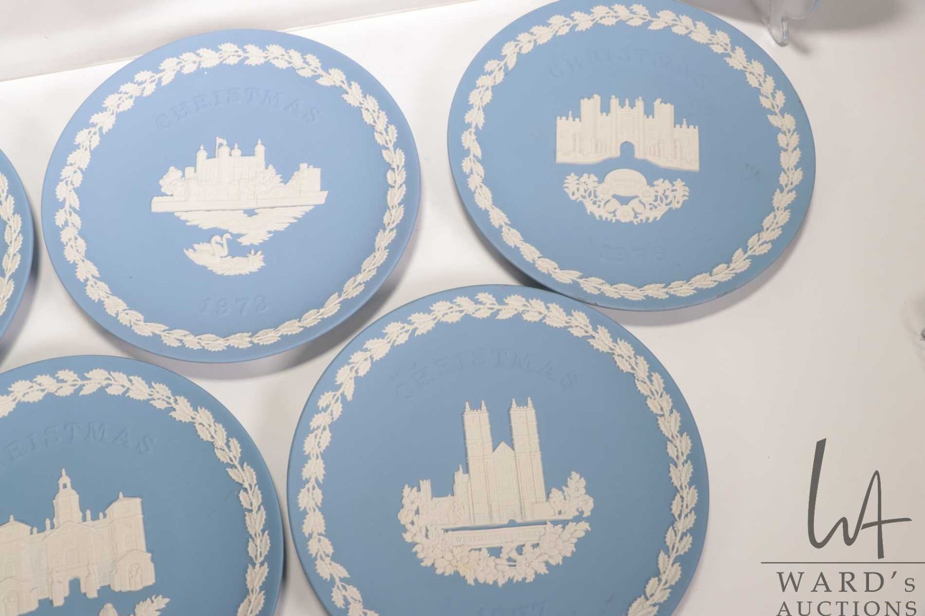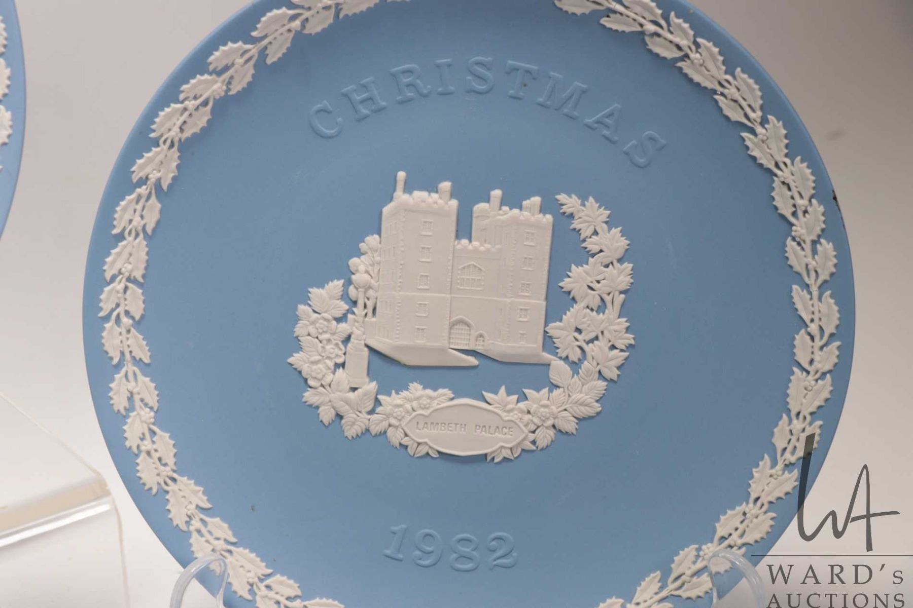 Twelve vintage Wedgwood Jasperware Christmas plates, featuring scenes of English architectures including 1970, 1971, 1972, 1973, 1976, 1977, 1978, 1979, 1980, 1981, 1982 and 1983