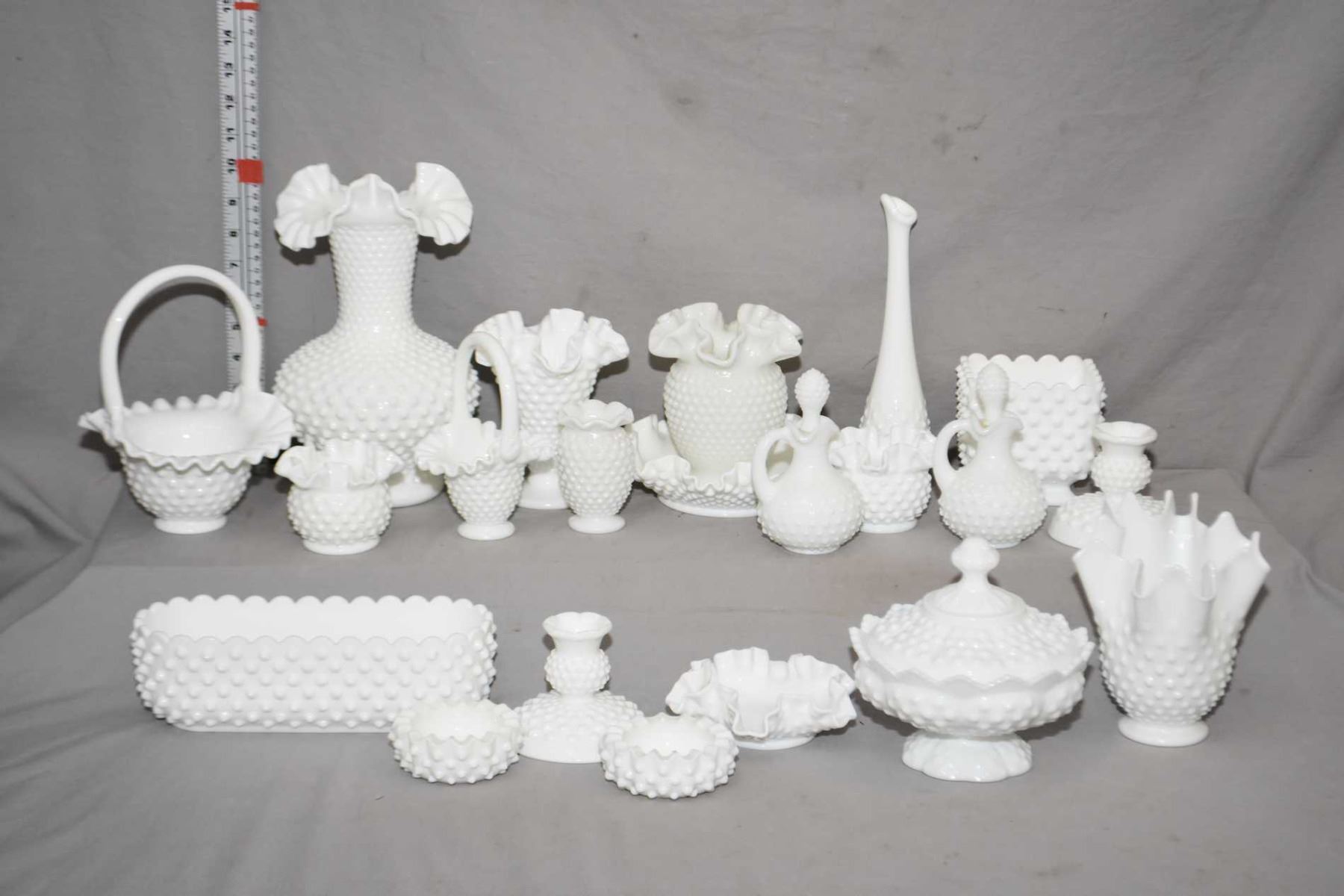 This item is not available for shipping. Local pickup only. Twenty one pieces of Fenton hobnail milk glass including vases, trinket holders, lidded dish, lidded bottles etc.
