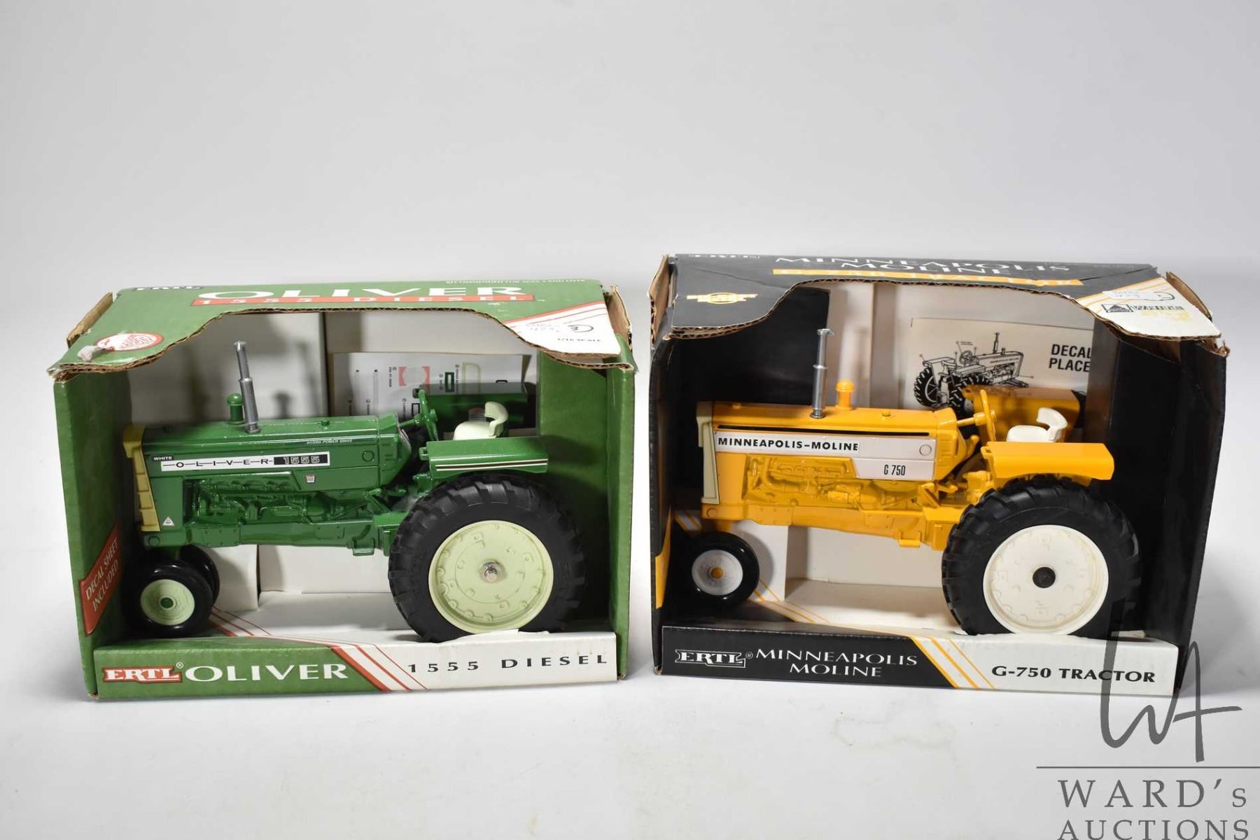 Two 1:16 scale Ertl die cast toys including Oliver 1555 Diesel and Minneapolis Moline G-750 tractor
