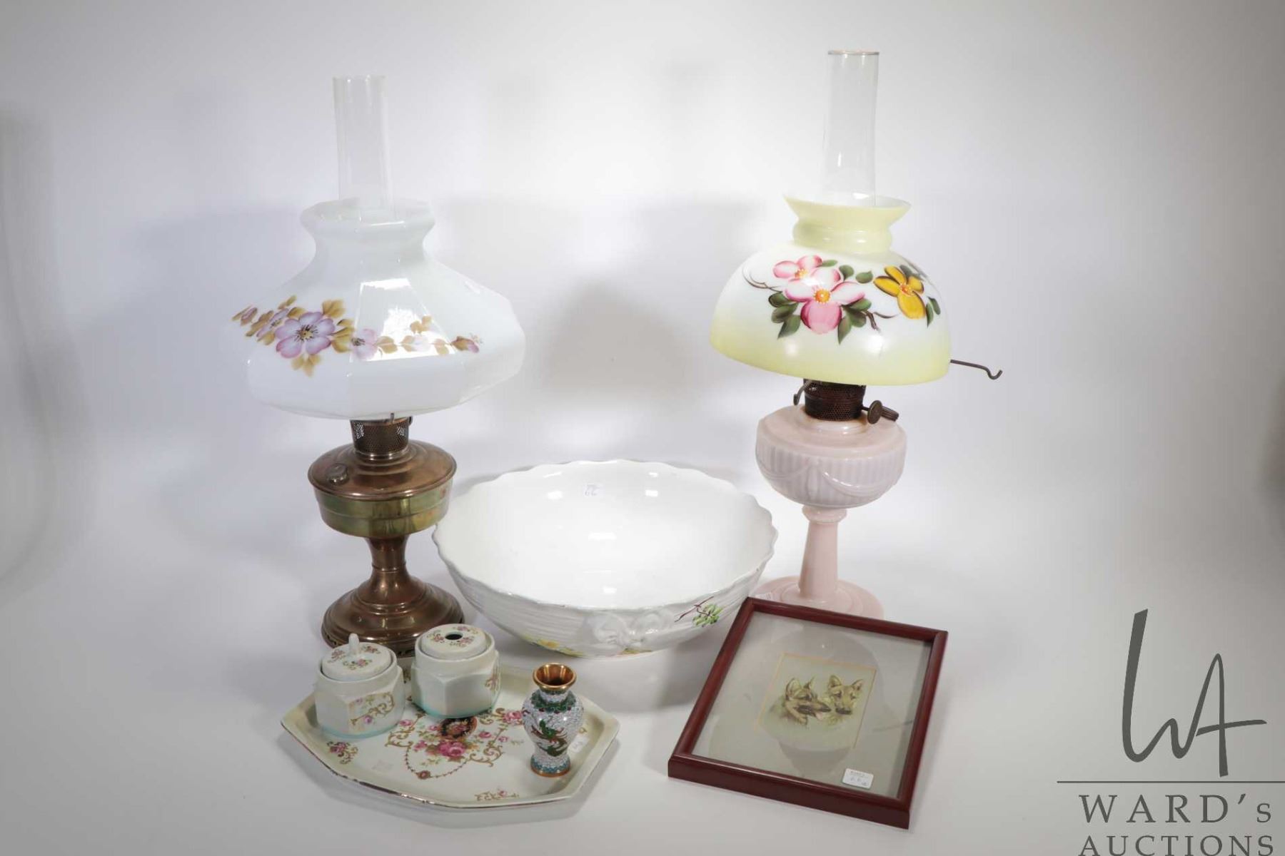 Two Aladdin lamps including brass with chimney and hand painted milk glass shade and a Lincoln drape glass oil lamp with chimney and ill fitting hand painted glass shade plus a unmarked hand painted wash bowl, small cloissone vase and a print of two Alsatian dogs. Note: Not Available For Shipping. Local Pickup Only